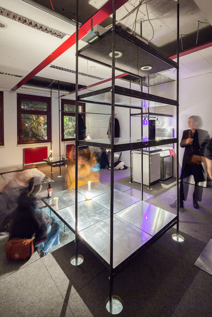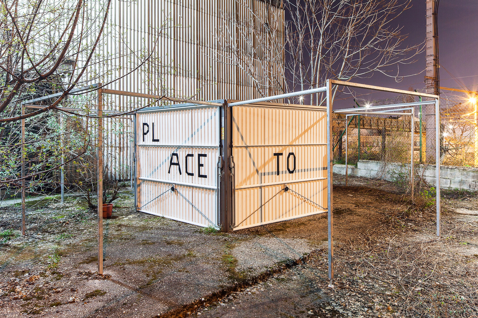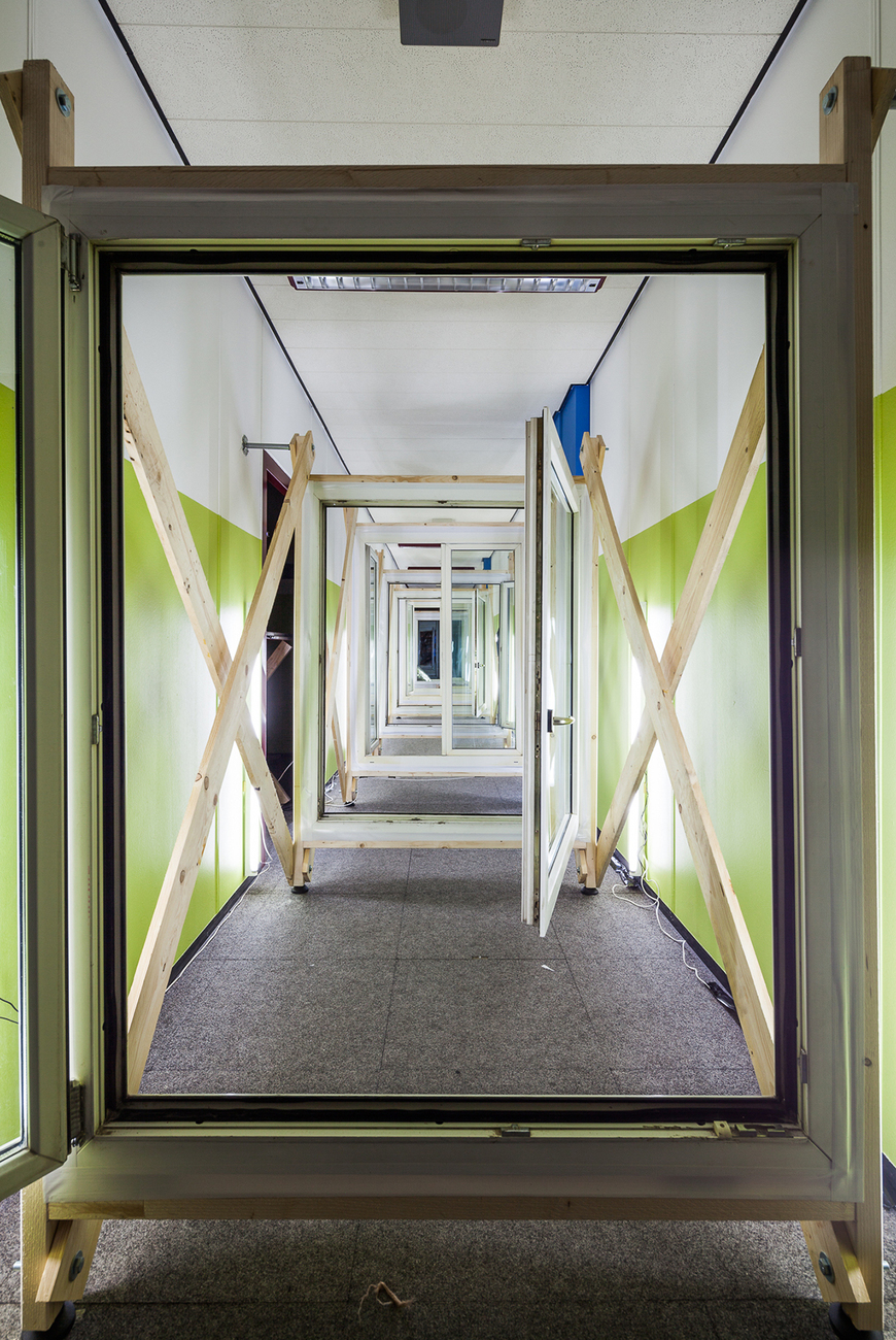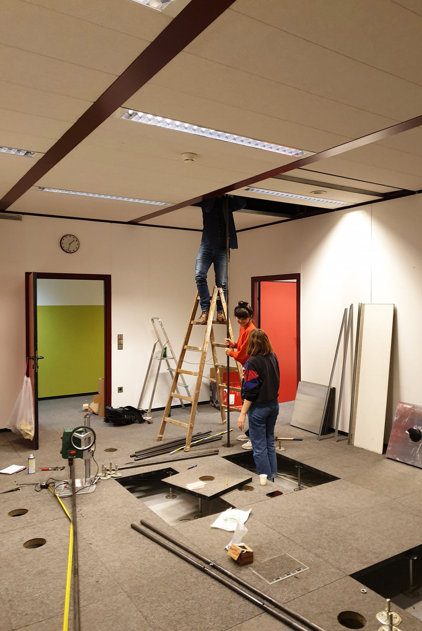 AKT: Eines unserer ersten Projekte hieß "Europa" und wurde 2019 zum ursprünglich geplanten Brexit-Ausstiegsdatum lanciert. Dafür haben wir eine alte Industriehalle gemietet und dort zehn Installationen hergestellt. Eine hieß zum Beispiel „British Folly“, für die ein Unterstand aus fünf Garagentoren gebaut wurde. Dabei ging es um das Ausformulieren von Grenzen, weshalb die BesucherInnen durch das Zu- und Aufklappen der Tore den Grad ihrer eigenen Isolation bestimmen konnten. Am Anfang haben wir uns noch in kleinere Gruppen unterteilt, die jeweils eine eigene Position ausformuliert und hergestellt haben. Bei unserem nächsten Projekt „Eingang“ ging es um eine Auseinandersetzung mit den oft leer stehenden Bürobauten der 1970er-Jahre. Wir haben deshalb verschiedene Installation in einen Bürokomplex eingebaut, um herauszufinden, wie sich solche Gebäude transformieren lassen. Es gab dort zum Beispiel Durchbrüche durch die abgehängten Decken oder neue Öffnungen und Zugänge, um so spezifische räumliche Erfahrungen zu schaffen.