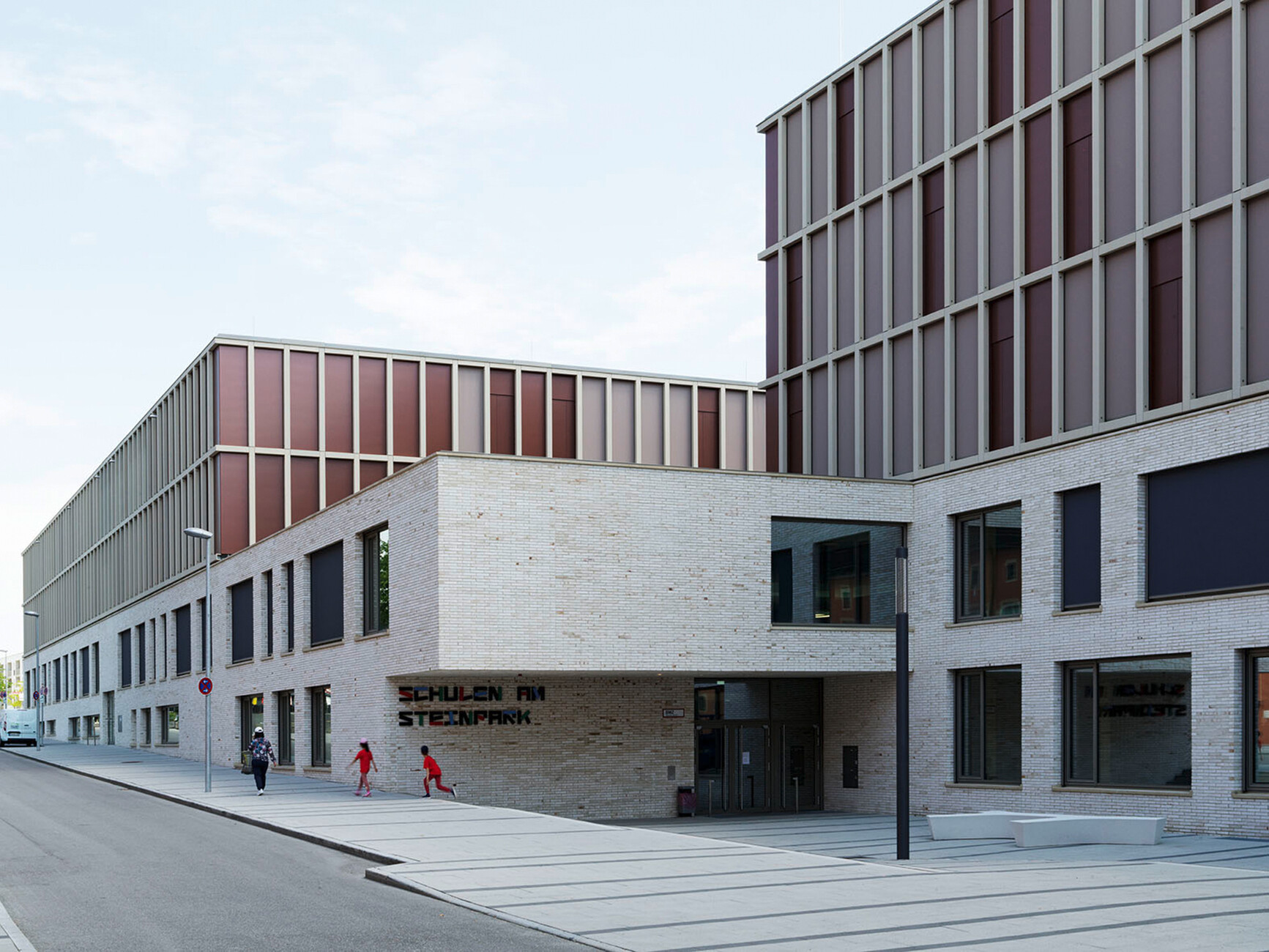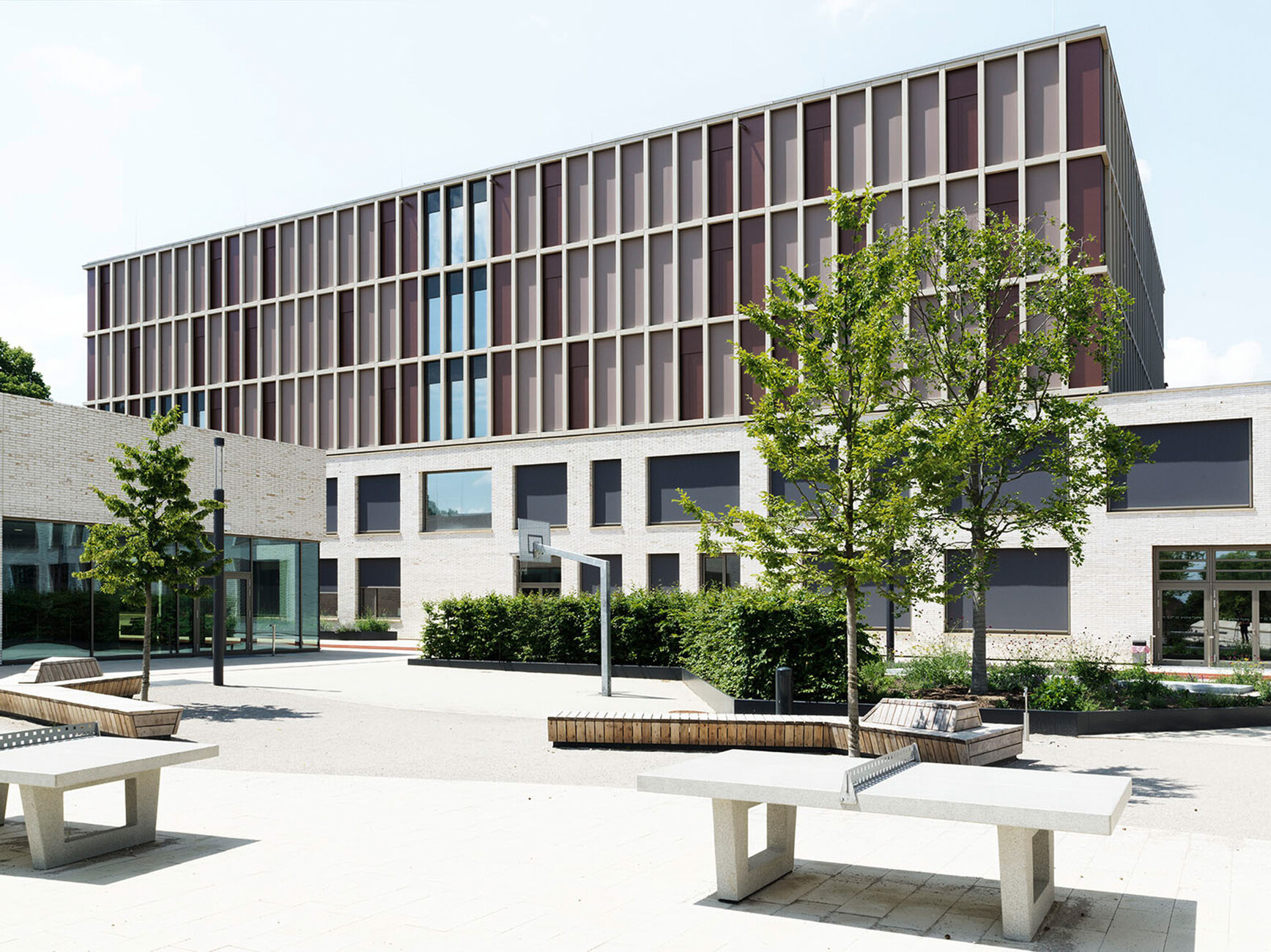 In Freising nahe München ist vor kurzem ein von Fuchs und Rudolph Architekten und Stadtplaner entworfenes Schulensemble fertig gestellt worden. Der umfangreiche Gebäudekomplex mit rund 23.500 Quadratmetern Bruttogeschoßfläche beinhaltet eine viergeschossige Grundschule und eine fünfgeschossige Mittelschule. Hinzu kommt ein Ganztagsbereich, eine Küche mit Mensa, Räume für die Verwaltung, diverse Lagerflächen, eine Dreifachsporthalle mit Tribüne und eine Tiefgarage. Die sogenannten Schulen am Steinpark bieten nun Platz für bis zu 1100 SchülerInnen. Während der Bauarbeiten konnte der Baumbestand erhalten bleiben und gleichzeitig um Neupflanzungen ergänzt werden. Entsprechend grün wirkt das mit Stauden, Sträuchern und Pinienbäumen versehene Schulareal, das den SchülerInnen viele Möglichkeiten zum Spielen oder Entspannen gibt. Angesichts der hohen Nutzung war es wichtig, die Fassaden der Schulen nicht nur architektonisch ansprechend, sondern auch robust zu gestalten.