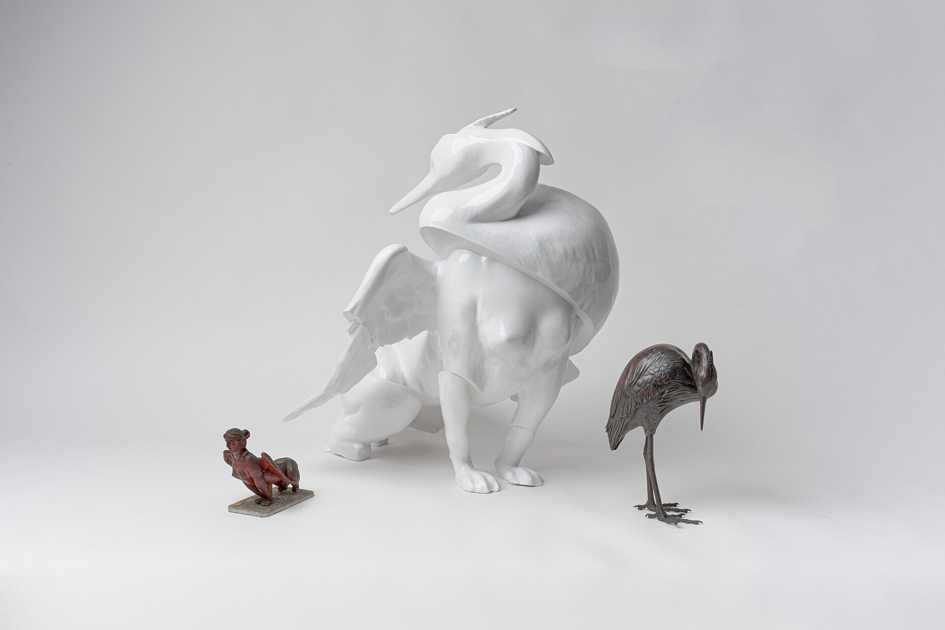 Eva Rucki: Wir haben in der hauseigenen digitalen Sammlung des MAK recherchiert und einige "Grenzgänger" gefunden. Für die neue Plastik haben wir mit einem Wachsmodell aus der kaiserlichen Porzellanmanufaktur und einem Bronzeguss aus Japan gearbeitet, eine Sphinx und ein Reiher. Diese beiden Objekte bilden die Grundlage für die Skulptur 'Heron Sphinx' (2024). Die Originalobjekte haben recht unterschiedliche Grössen. In der digitalen Welt hingegen sind Parameter wie Maßstab, Gewicht und Material geglättet. Der Reiher wurde oft als ein Vogel verstanden, der die Verbindung zwischen dem Diesseits und dem Jenseits herstellt und die Sphinx trägt diese Dualität auch in sich. Zudem kommen die Objekte aus völlig unterschiedlichen Glaubenssystemen und liegen geografisch so weit auseinander, wie sich die vielfältige Sammlung des MAK erstreckt.