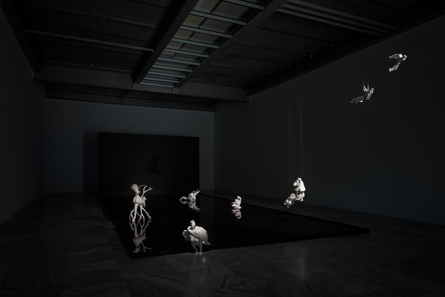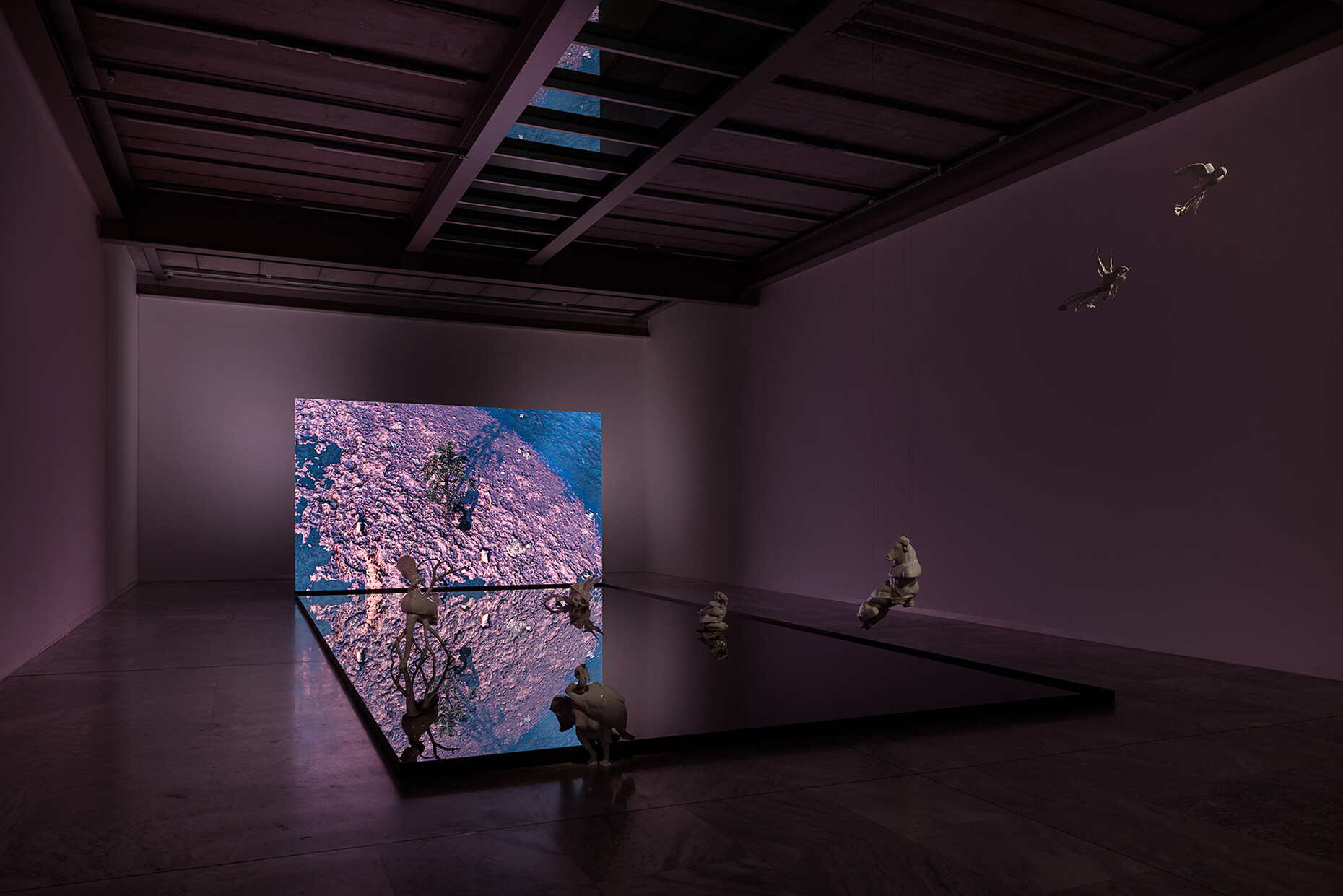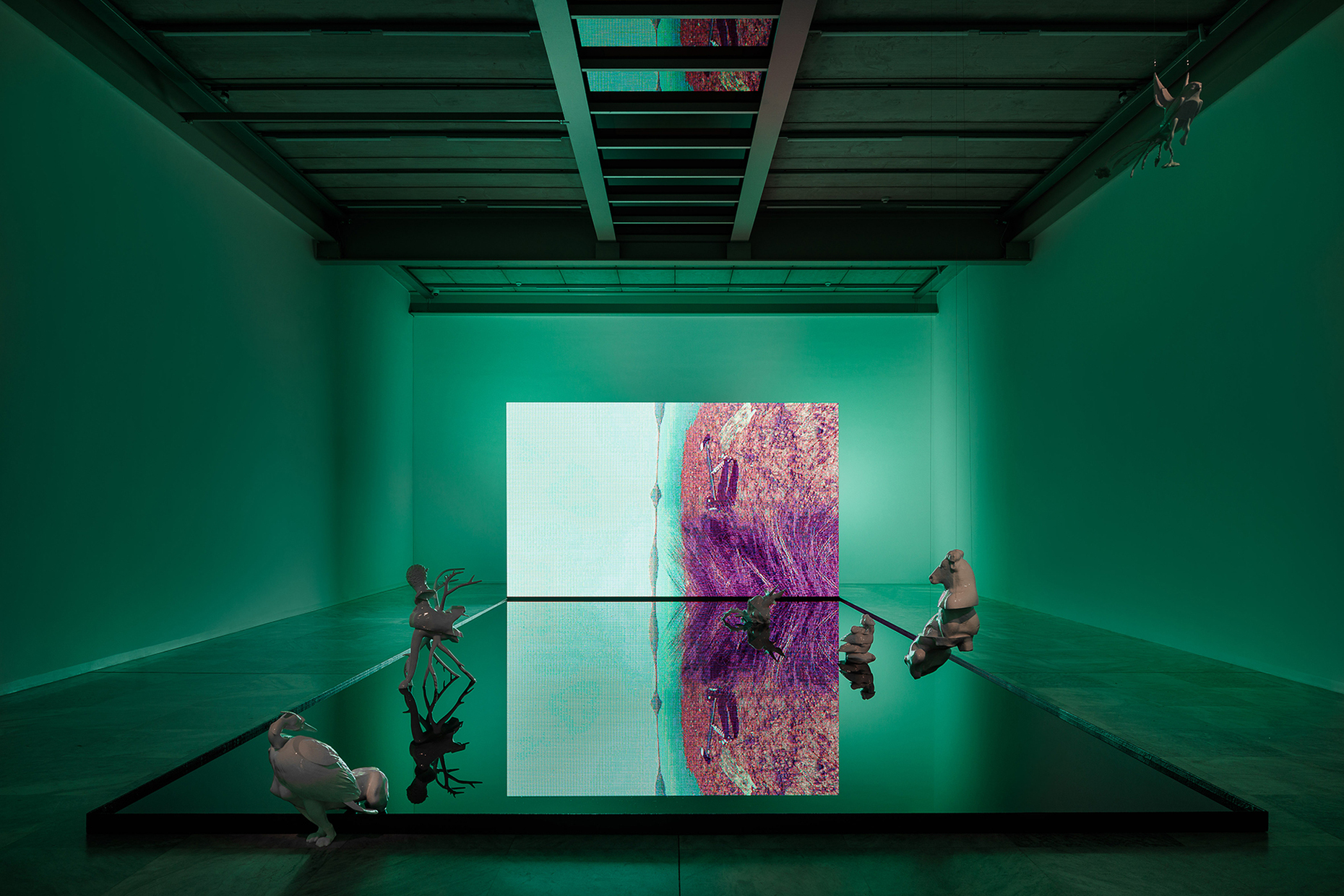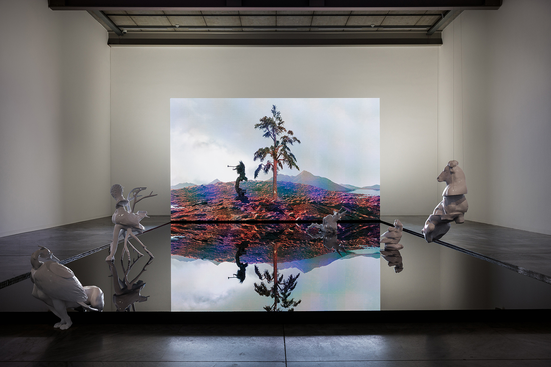 Troika hat für das MAK in Wien eine immersive Rauminstallation geschaffen: Der darin gezeigte titelgebende Film "Terminal Beach" entfaltet eine dystopische Szenerie vom Ende des natürlichen Lebens auf der Erde und verhandelt die Schnittstellen von virtueller und materieller Welt. Den Museumsraum bevölkern indes im 3D-Druck gefertigte "Grenzgänger".