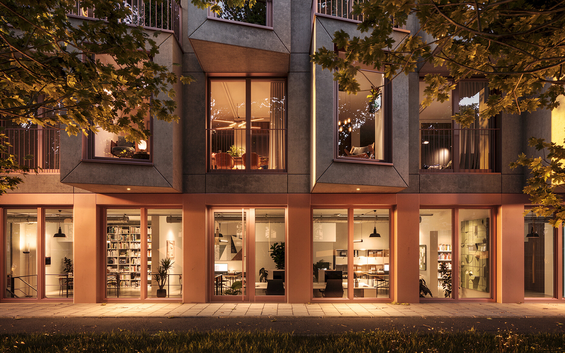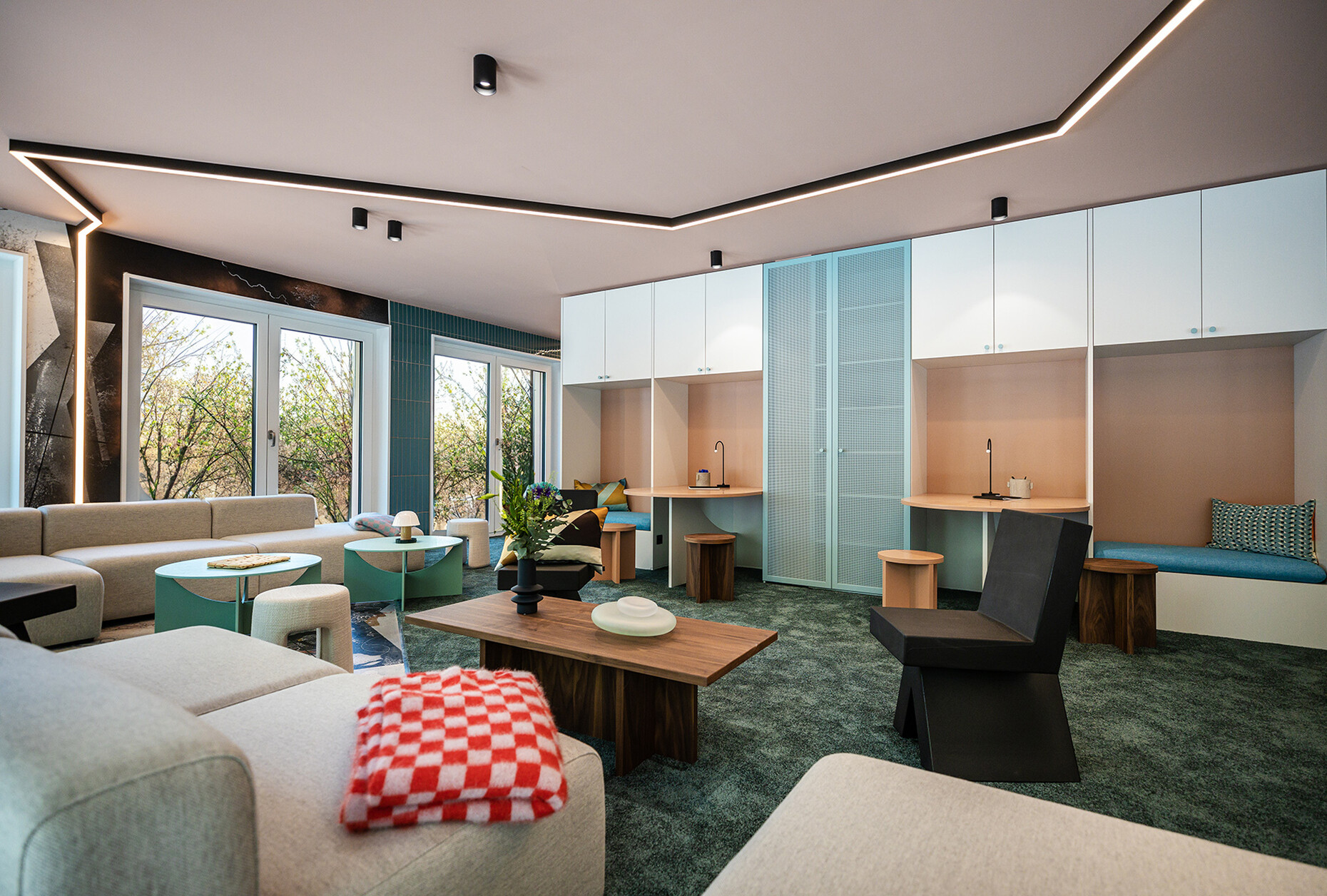 Im Erdgeschoss gibt es unter anderem einen sogenannten "Co-Living-Space" als Treffpunkt und Arbeitsraum für die BewohnerInnen. Auf circa 115 Quadratmetern sind hier Sofas und Sessel, eine Bar, ein großer Tisch und abgetrennt dahinter mehrere kleine Nischen zum Arbeiten untergebracht. Trotz der großen Fenstertüren, die sich auf zwei Seiten zum Straßenraum öffnen, wirkt das alles leicht beengt. Das eklektische Gestaltungskonzept – ein Resultat der Zusammenarbeit des Urban-Art-Duos Layer Cake mit der Interior-Designerin Stephanie Thatenhorst – verstärkt das Ganze zusätzlich. Zeitgeist-Design trifft hier auf Graffiti-Kunst, was nicht nur etwas bemüht wirkt, sondern aufzeigt, wie man sich in München die Großstadt mitunter so vorstellt. Die Belegung des "Co-Living-Space" und seine Öffnung zur Stadt, überlässt Bauwerk im Übrigen den BewohnerInnen. Und so bietet nicht nur die Nutzung des Raums, sondern auch dessen Organisation eine Möglichkeit sich gegenseitig kennenzulernen.
