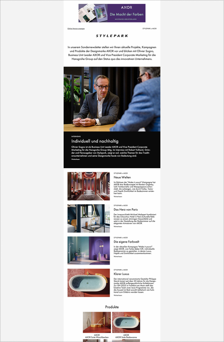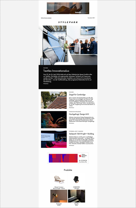 Stylepark offers an exclusive online advertising platform, reaching an annual audience of approximately 3.2 million users on the website and engaging with the 120,000 subscribers of our weekly newsletter through online advertisements.