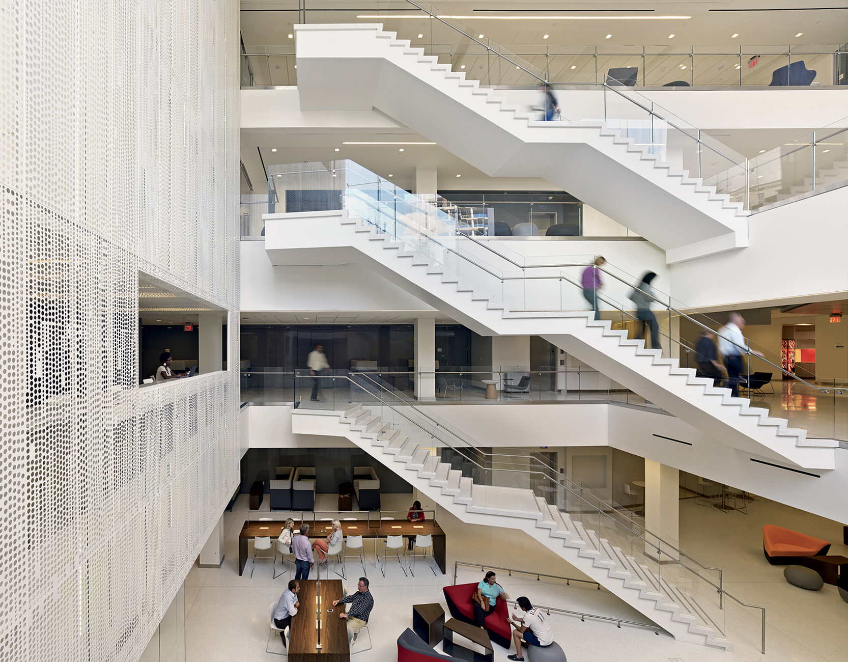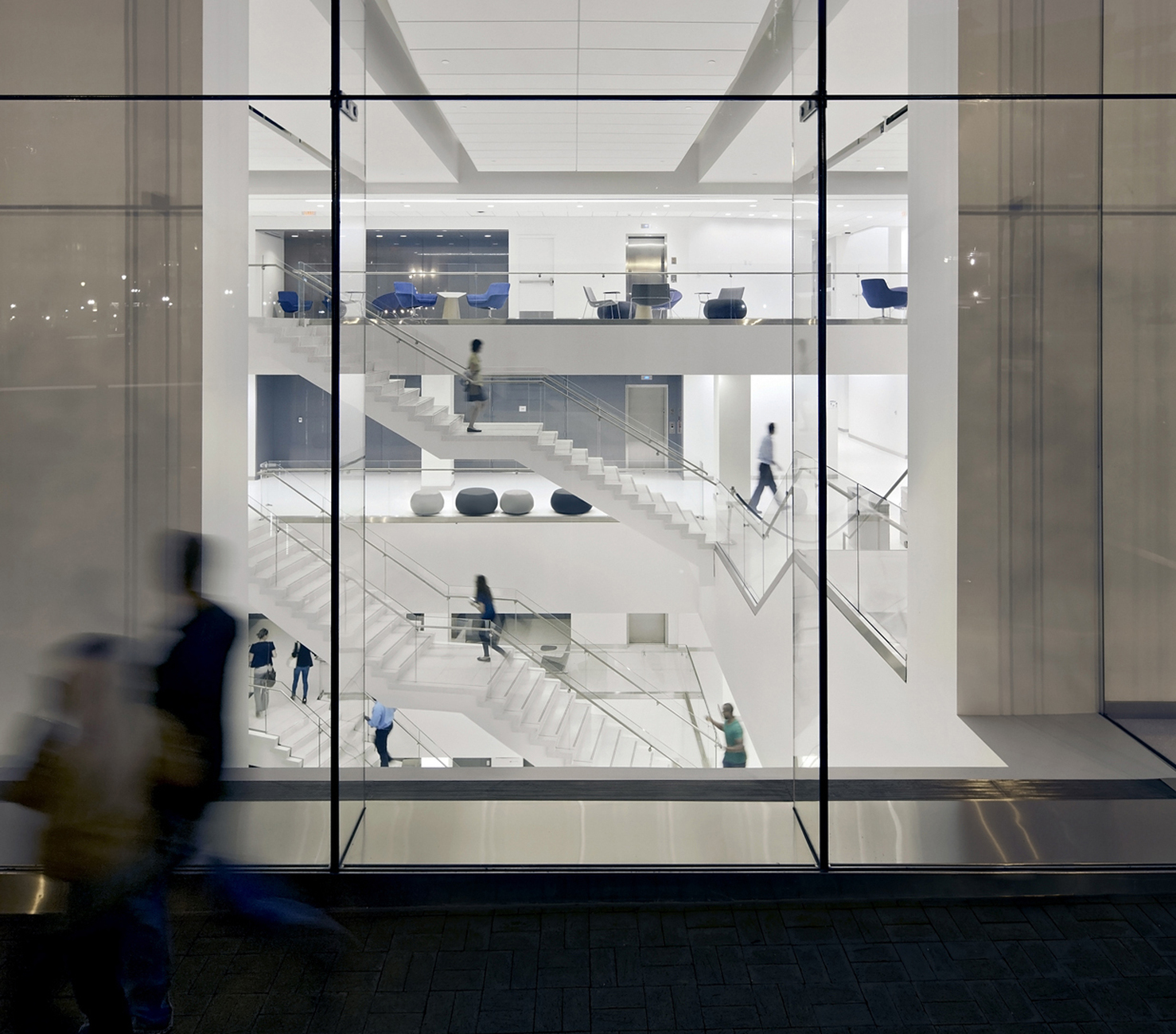 To bring together its various off-campus programs at a single place, elite Georgetown University in Washington D.C. chose a former TV studio as its extramural seat. Given the building’s prior use, its ground plan features a plethora of small rooms and a windowless façade designed to keep as much daylight as possible out of the recording rooms. Studios Architecture replaced this with a two-story glass façade that strongly emphasizes the building’s presence in the urban fabric. Moreover, in the atrium a central white staircase leads up to the rooms on the four floors. Bright wooden cladding provides warm accents. Small islands for meetings and recreation areas give the overall layout a leisurely feel: In the latter, you can enjoy using the seating courtesy of long-standing furniture makers Arper: “Catifa 46” and “Catifa 80” collections by Lievore Altherr Molina. With frames made of powder-coated aluminium, the “Catifa 46” chair is all about sturdy flexibility.