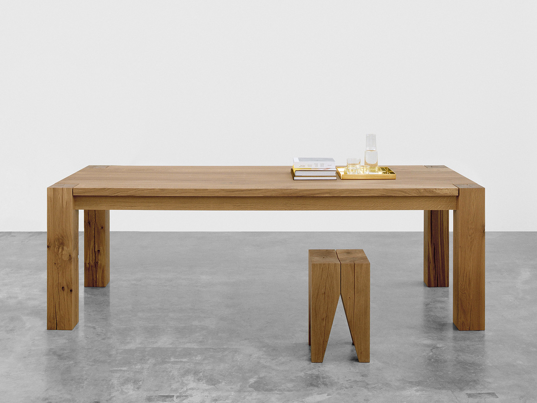 That was 30 years ago, meanwhile "Bigfoot" has gone from rebel to classic. This has done it no harm, as the clear design, the natural material and the long service life of the table could not be more up-to-date. Durability, craftsmanship and environmentally friendly production are what e15 still stands for today. Philipp Mainzer no longer dismantles old goods wagons; instead, the European oak and walnut wood is sourced from sustainable forestry, predominantly from Germany, and is PEFC-certified. The regional network ensures short transport routes and also guarantees the high quality of the furniture. A touch-up with a little oil now and then is all the ‘Bigfoot’ needs. Good ideas are often copied, as e15 knows from its own experience. A glance at the embossed logo and the individual serial number shows that the ‘Bigfoot’ is authentic. This year, a plaque with Philipp Mainzer's signature and a companion: the ‘Backenzahn’ stool made of heartwood, itself a small design icon.