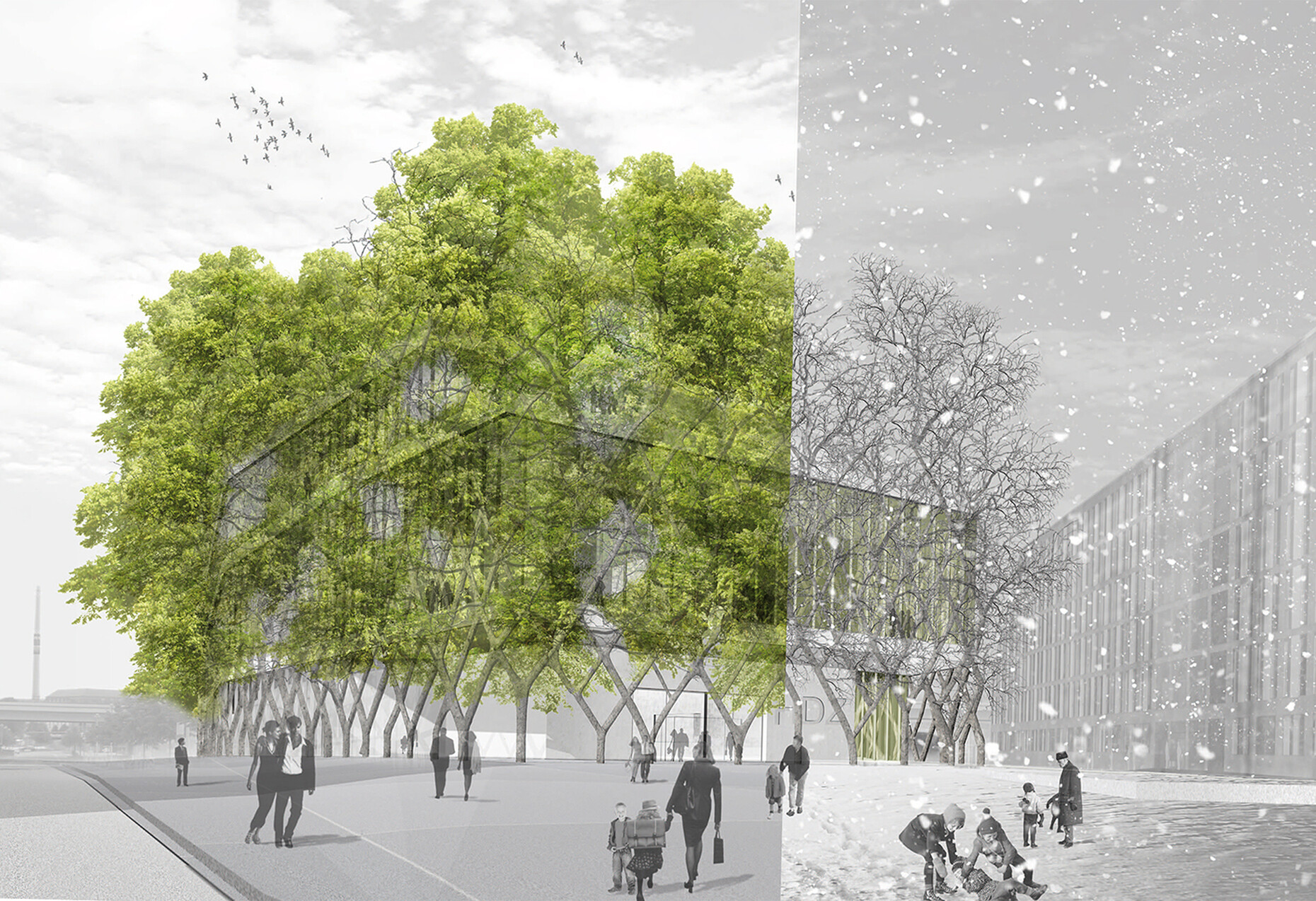 Prof. Ferdinand Ludwig: At present, among other things we’re working on a project for Munich, for a forecourt of the Thomas Morus Church. It’s a Baubotanik grove of trees, a roof made of tree canopies using hornbeams. These trees have multiple trunks that can in part be interconnected, and into these grow benches, on which you can then sit to enjoy the microclimate of the trees. The grove of trees is also a spatial filter for the design of the plaza. It’s an integral part of the design. Water management plays a role here, as we use the surface water from the sealed surface to irrigate the trees.