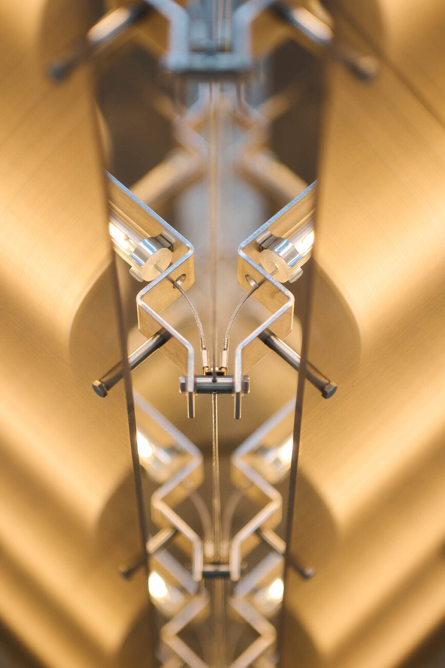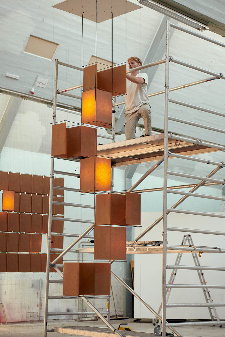 Frederik Gustav: ‘Paperwork’, which we exhibited at The Mindcraft Project in 2022, was our first project with light. As the discipline is associated with numerous technical aspects, we lacked the courage for a long time. In the meantime, light has become a focal point of our work. ‘High Wire’ was our first solo exhibition, which was presented at Til:værks in Østerbro in Copenhagen. Normally, the electrical components in lighting design are hidden. We wanted to challenge that. Instead, we were inspired by the electrical structures of the city, such as antennas, power lines, streetlights or railway systems, where the mass of cables itself forms an enormous sculpture. Following this exhibition, we then developed the ‘Pylon’ lamp series. Another current exhibition project is ‘Reflector’, a luminaire that combines bent steel rods and aluminium shades and can be scaled from a single light source to an extensive architectural installation.