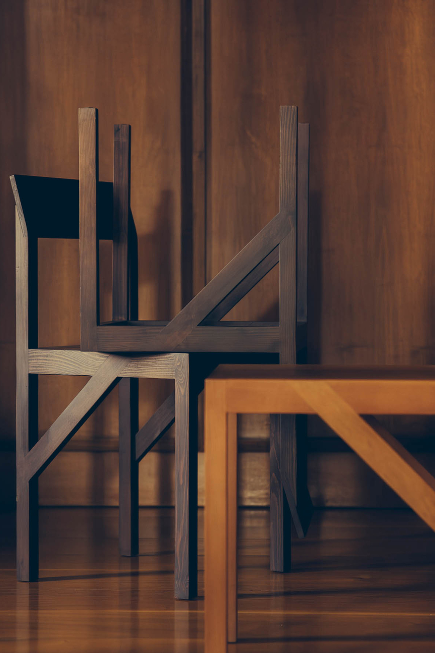 Frederik Gustav: Our collaboration with Frama started with the chair I mentioned earlier. One evening over a beer, we decided to send a small presentation to the boss of Frama. A rather hopeless endeavour, but to our surprise he replied the same evening. The ‘Bracket’ chair is a further development of the first idea, which still had problems with stability. The concept was to incorporate a diagonal brace that not only stabilises the entire piece, but also gives it its unmistakable character.