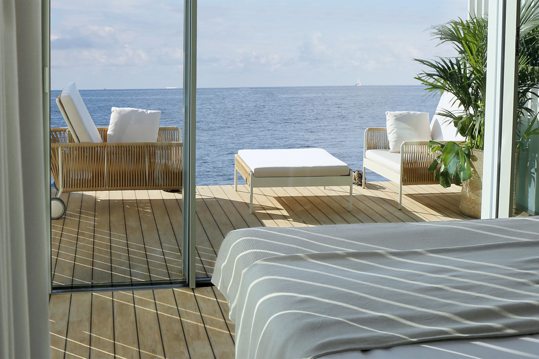 The sensation of the sea: When the curtain is pulled aside as if by magic, the great blue expanse begins right by the edge of the bed – separated only by the windowpane and the balcony. But – and this is where this room differs from others in conventional luxury resorts – the view can be changed on a whim. This is because the “Punta de Mar” is not a hotel, but rather a floating pavilion.