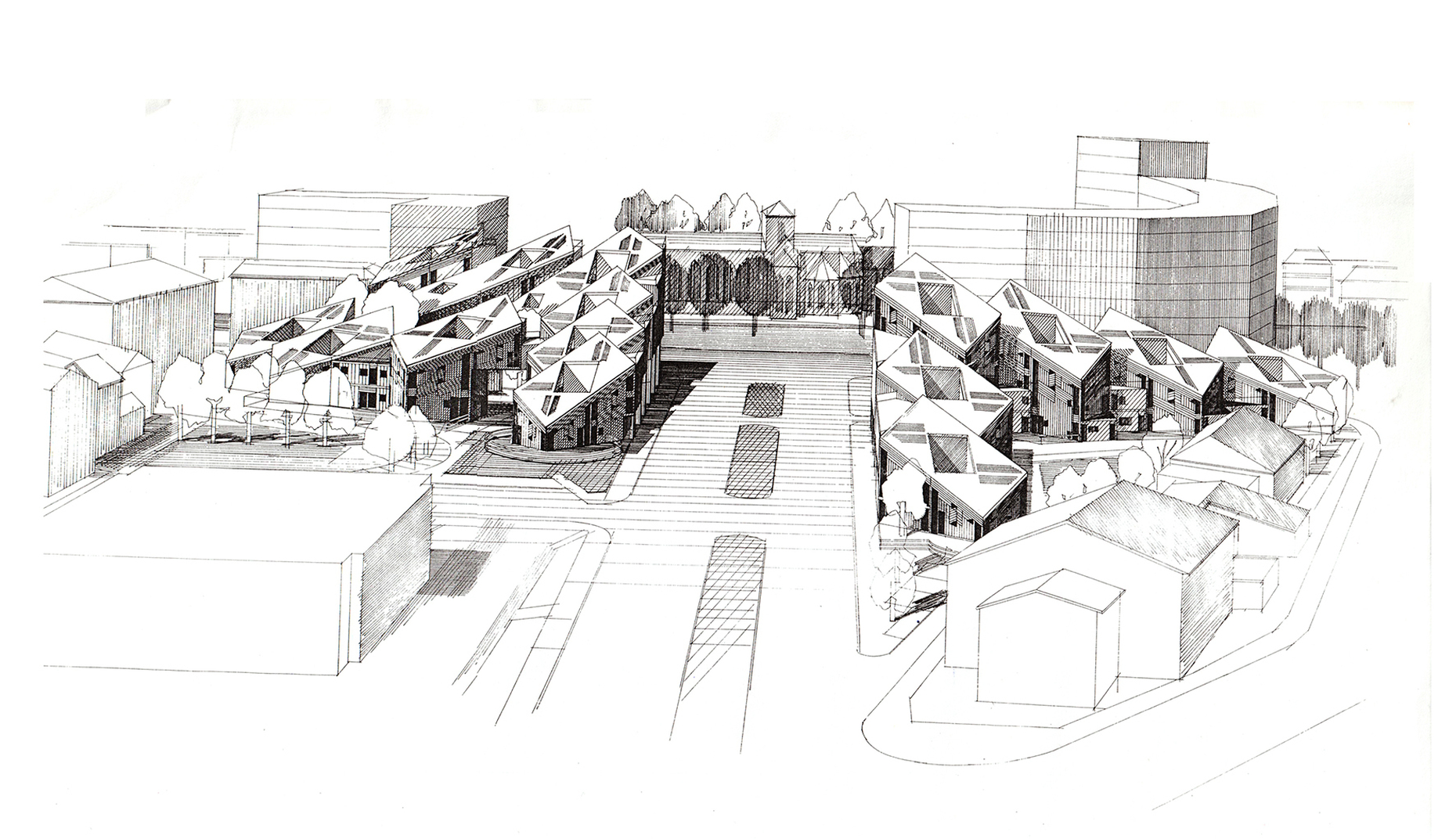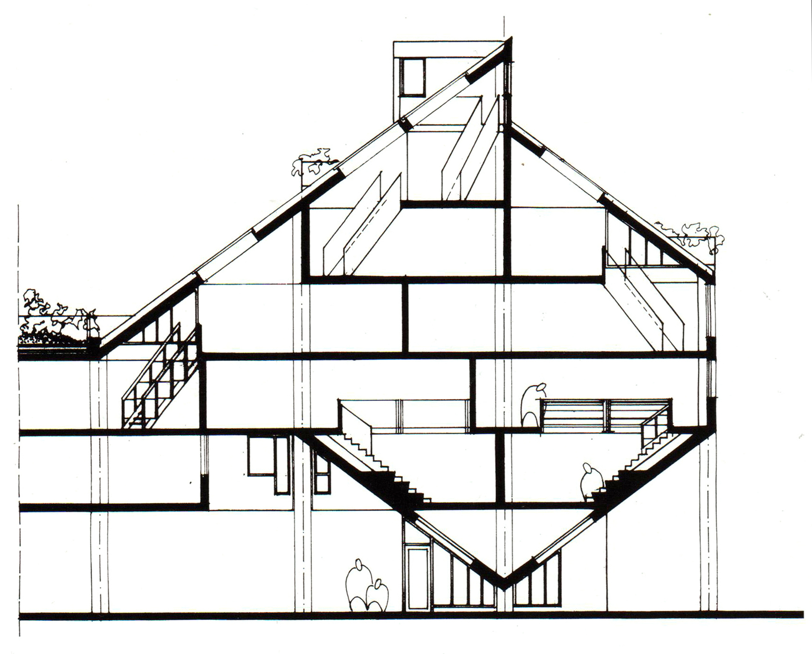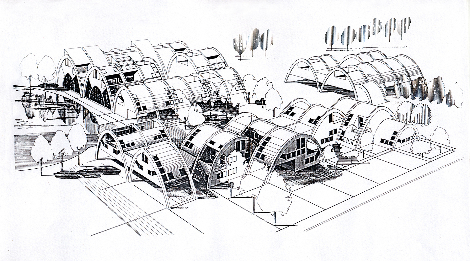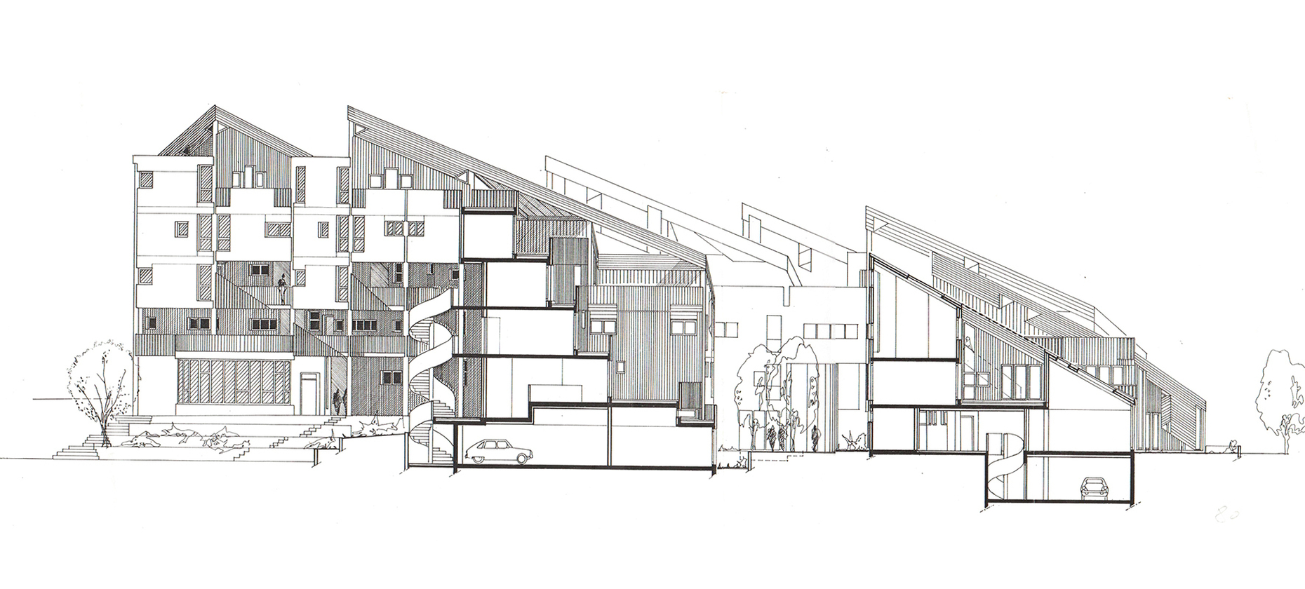 Iwona Buczkowska: As soon as I arrived in Paris, my class went to visit a construction site in Ivry. It turned out to be Les Étoiles d’Ivry, a social housing project designed by Jean Renaudie. It was a shock to me. I was very impressed by the freedom of the architect’s vocabulary, by the expressive force of the buildings, which avoided any of the orthogonality in which I still believed at the time, at least for housing. So I started to discover the freedom of architectural expression in the horizontal planes of the jagged geometries of Renaudie and Gailhoustet. Also I discovered the freedom of expression in the vertical oblique planes of Claude Parent and the importance of load-bearing systems in the space frames by Yona Friedman and in the tensegrity structures by David Emmerich. It seemed there were infinite possibilities. I tried to find my own path through the use of oblique constructive frames or supporting arches in connection with free floor plans.