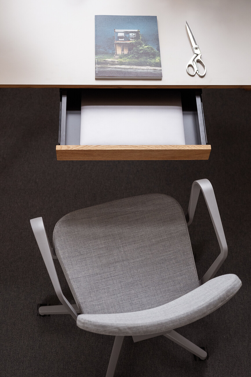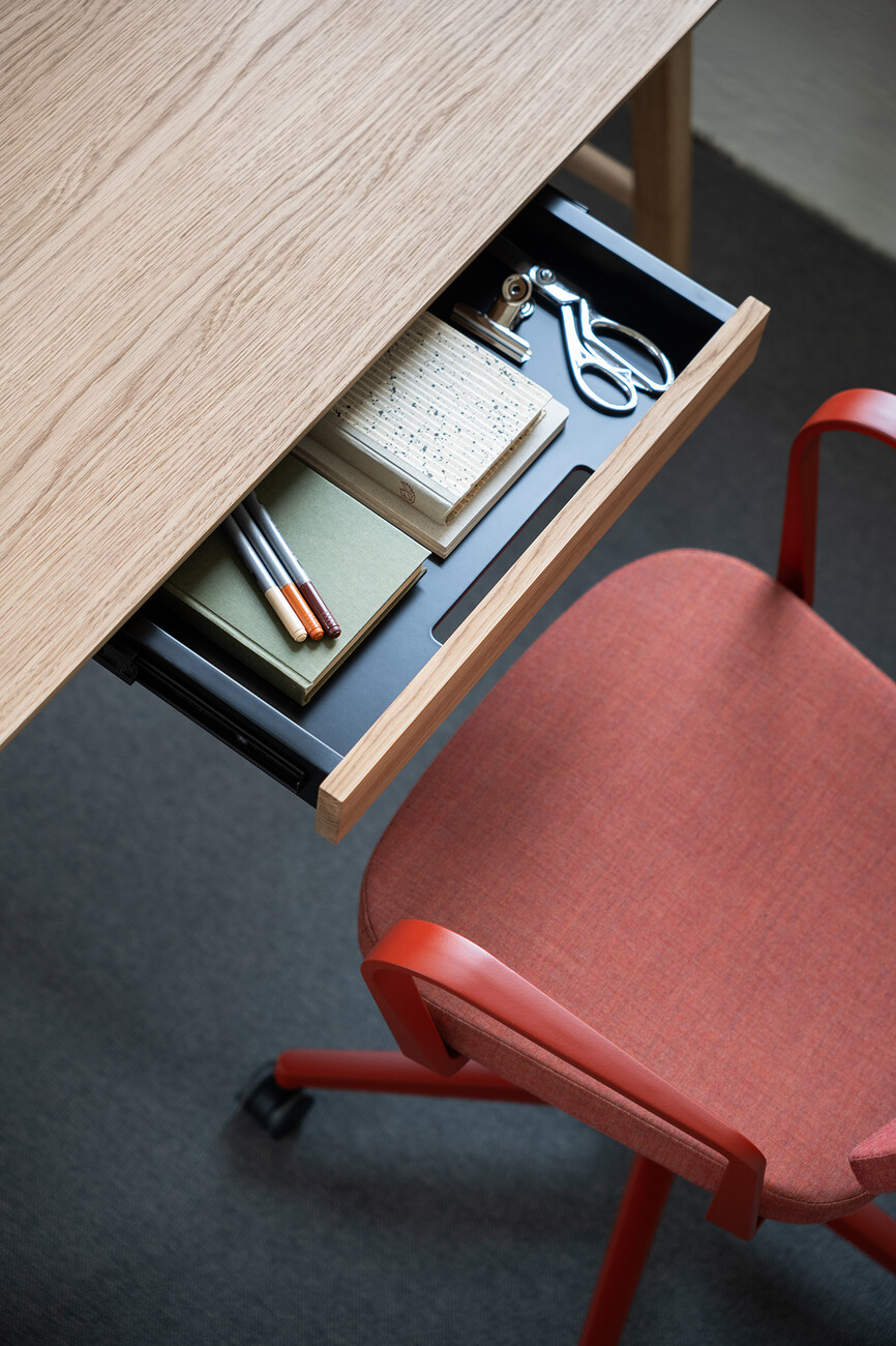 Good working conditions at the "Soho" table are ensured also by the optional accessories: a drawer can be integrated into the table frame, the front of which blends in discreetly thanks to the same materiality. The soft-closing drawer is operated via a concealed handle in the base and the stylish black interior provides a good overview of the necessary work utensils. To keep the design clear and the workplace tidy, a USB-C port with a three-metre cable with charging function can also be integrated into the front frame. This is where pragmatism meets design – in accordance with Kinnarps' expertise in producing creative furniture that meets the requirements of modern works places in the office and home office.