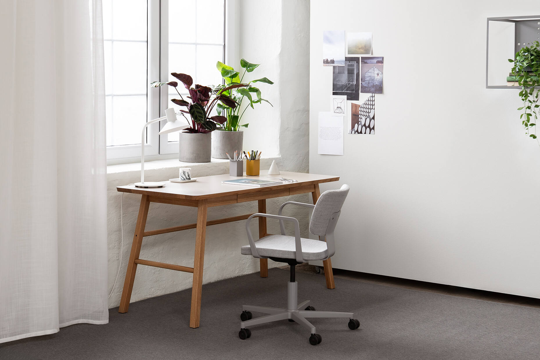 With distinctive lines and smooth corners, a certain Scandinavian purism characterises the essence of Ståhl's design: like a delicate version of a workbench, "Soho" gives room for completing any task. The light oak wood of the solid frame generates the impression of an open, cosy working atmosphere. At the same time, it harmonises with a wide variety of seating options, such as Ståhl's new "Palette" chair. This means that the table works just as well at home as it does in public offices. There are two options for the table top: In the first, oak veneer creates a uniform wood impression emphasising the handcrafted character of "Soho". In the alternative with beige laminate, a solid oak edge accentuates the high-quality, natural look.