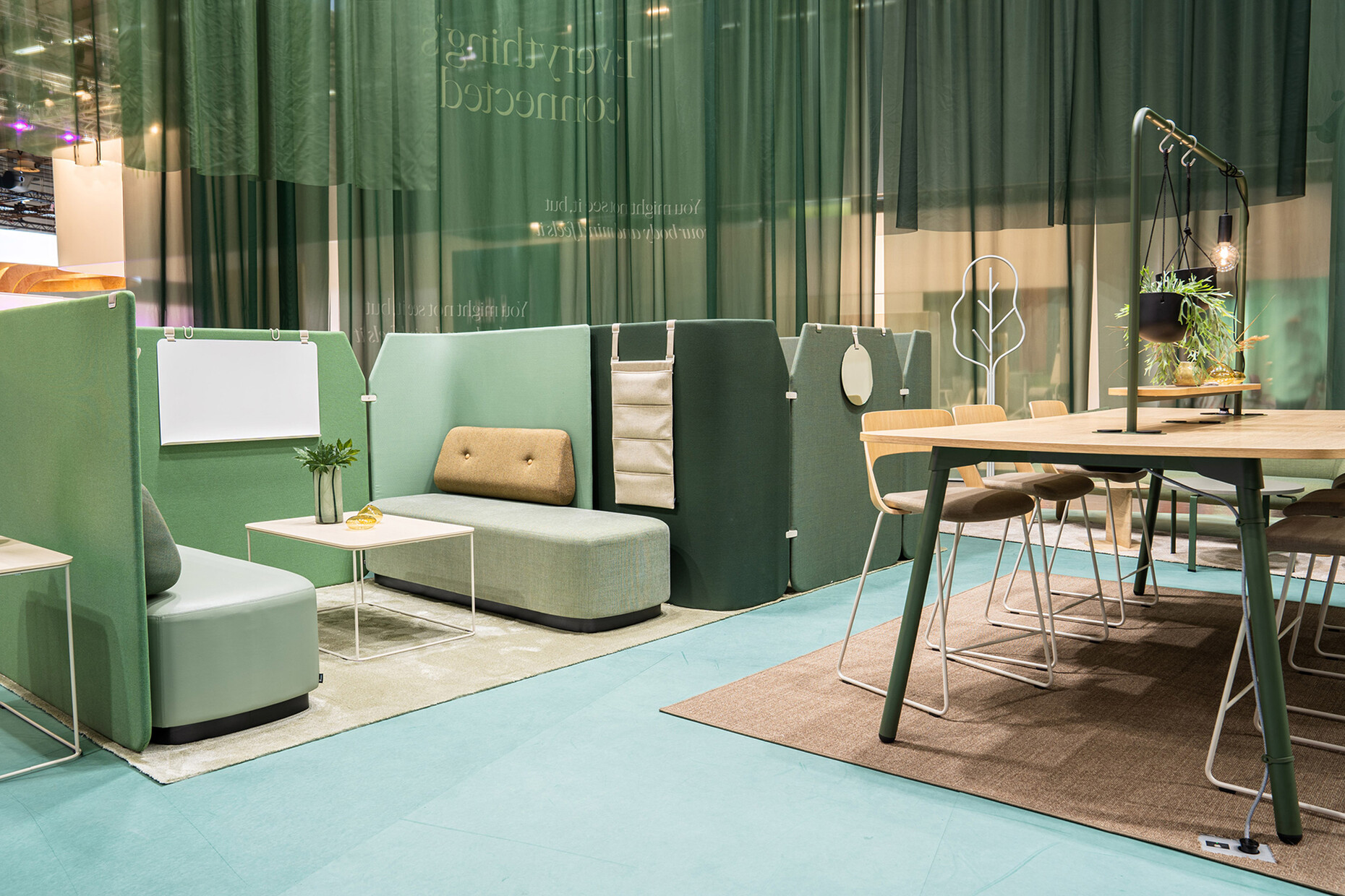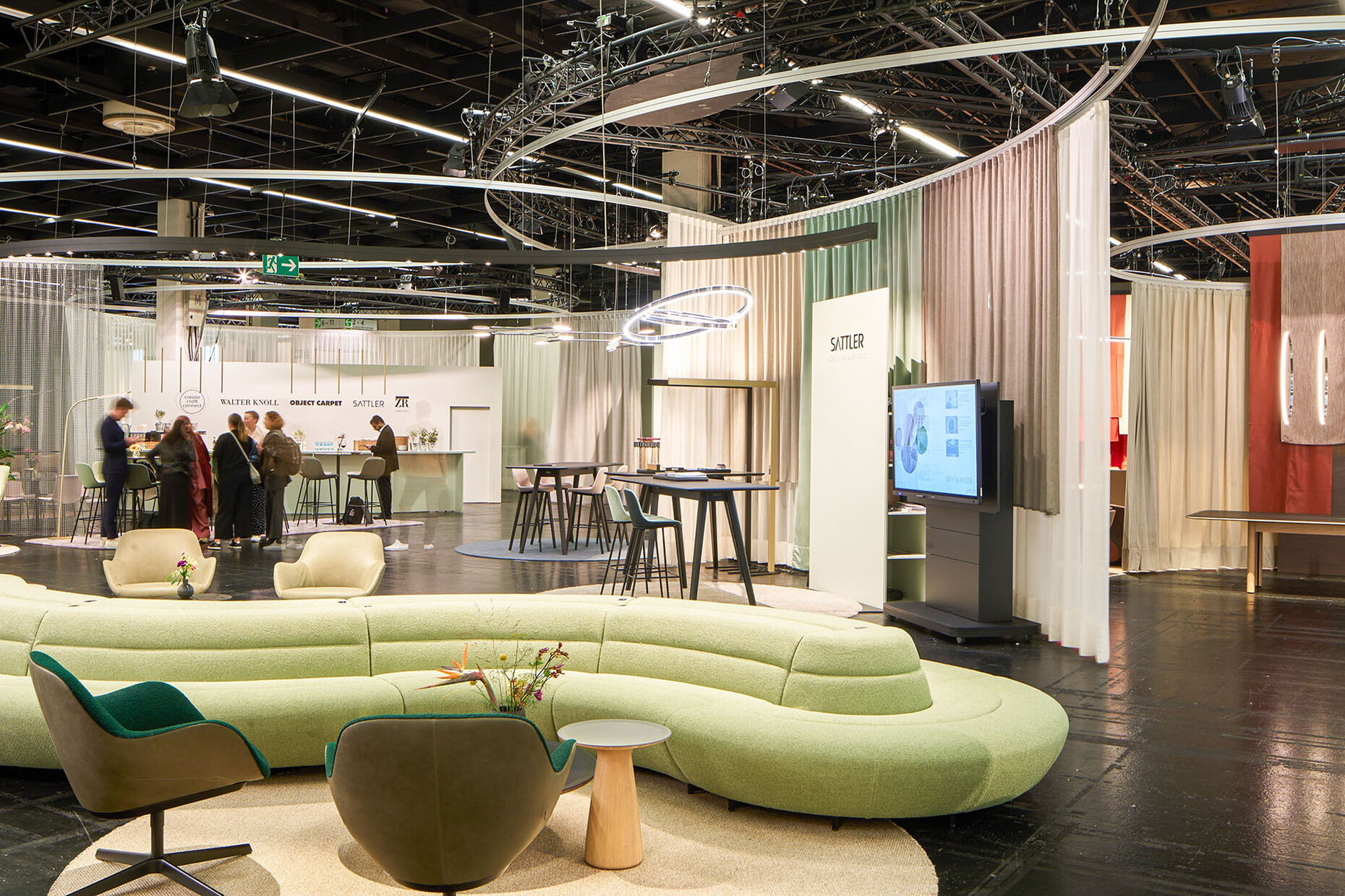 These ideas were presented to us in unusually airy spaces, which, on the one hand, pointed to the reduced number of major exhibitors and, hopefully, the final move away from elaborate and wasteful stand architecture. Instead, in addition to wooden structures and fine metal chains, transparent fabric was increasingly used as a ceiling structure and impressive installation - as at NowyStyl. Without further ado, Palmberg set the light textile in motion with a blower, creating a dynamic room divider. Meanwhile, ‘Kein Messestand’ (‘No exhibition stand’) was plotted on the wall by the company Form to present its ‘UF Collection’ and, with its ‘No Campaign’, called for a radical rethink in the design of working environments for multifunctional solutions.