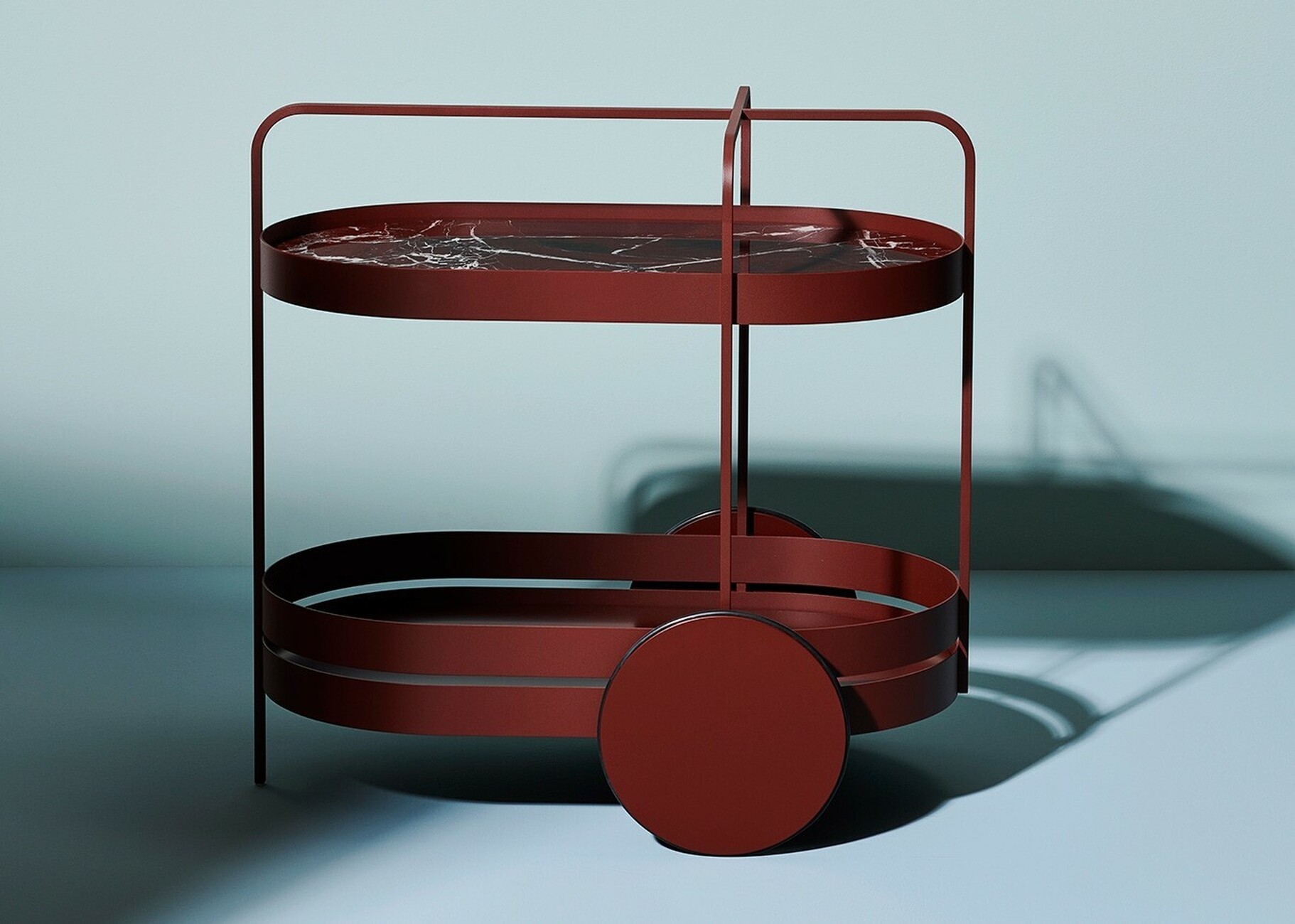 The "GRACE" bar trolley is a successful classic from Schönbuch. Designer Sebastian Herkner has designed a new version in collaboration with Carolin Sangha, Schönbuch's artistic director - the "GRACE SALON Edition": the design, inspired by the 1950s, with its organic shape and filigree lines, features a powder coating in sensual mahogany red. The upper surface has also been refined with a top made of Rosso Lepanto marble, which, with its deep Bordeaux red and fine ramifications in white and anthracite, perfectly matches the colour scheme of the frame. Like all versions of the "GRACE" bar trolley, the limited edition of 100 pieces is handcrafted in Bavaria.
