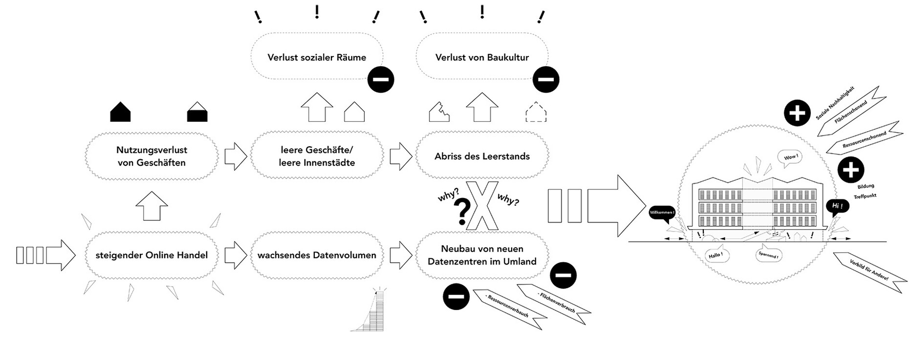 Katharina Neubauer: We proposed using the now empty Karstadt building as a data center. In a way it’s the fusion of my PhD thesis which addressed data storage buildings at the interface between their social significance and the absence of a spatial presence – and the previously mentioned questions about how to deal with typologies like department stores, railway stations or churches. It needn’t always be residential and isn’t always feasible anyhow. But what might a suitable use for this typology be? In this instance, it’s the storage of data, which are the commodities of our time.
