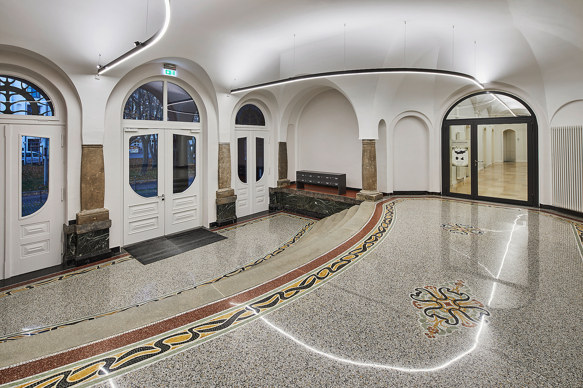 A centerpiece of the lighting concept is the idea of continuous lines of light that are intended to help link the individual sections of the building to one another. The lighting designers opted for the "LED-Linargo" pendant luminaire from the ADO Lights brand by TTC Timmler Technology, which now runs through the building in straight and curved forms, producing both direct and indirect light. Boasting a span of over 4.50 meters and featuring barely noticeable suspension points in the round arches of the original building each line of light seem to float in space. In addition, careful consideration was given before making any interventions in the historical substance of the building. Consequently, the new lighting elements are positioned at existing cable outlets, which meant it wasn’t necessary to place new anchor points in the original vaults. In the entrance area the “LED-Linargo” luminaires are fitted out with “LED-Luc” spotlights, likewise courtesy of TTC Timmler Technology. They enable additional lighting scenarios and thanks to their indirect light create an inviting entrance area that anticipates the design concept of the building as a whole.