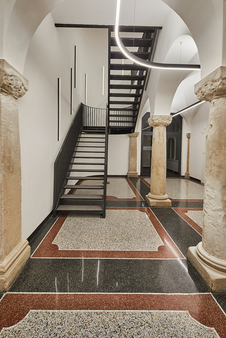 The lighting concept not only emphasizes the sculptural nature of the existing building’s cross vaults but also generates an overall aesthetic guideline that becomes part of the new and historic architecture. Moreover, as the “LED-Linargo” luminaires boast a delicate shade of anthracite they provide a link with the modern architectural elements. At the same time, their curved design refers to the shape of the historic round arches. Installed vertically as wall-mounted luminaires, the “LED LightLines” by TTC Timmler Technology also cite the architecture and immerse the new metal staircase in an even light. The light lines are subtly positioned at the top of the stairs and take up the vertical structure of the banisters. Moreover, like the other luminaires they form a gentle contrast to the sculptural stone architecture of the existing building and add a new time layer to the administration building.