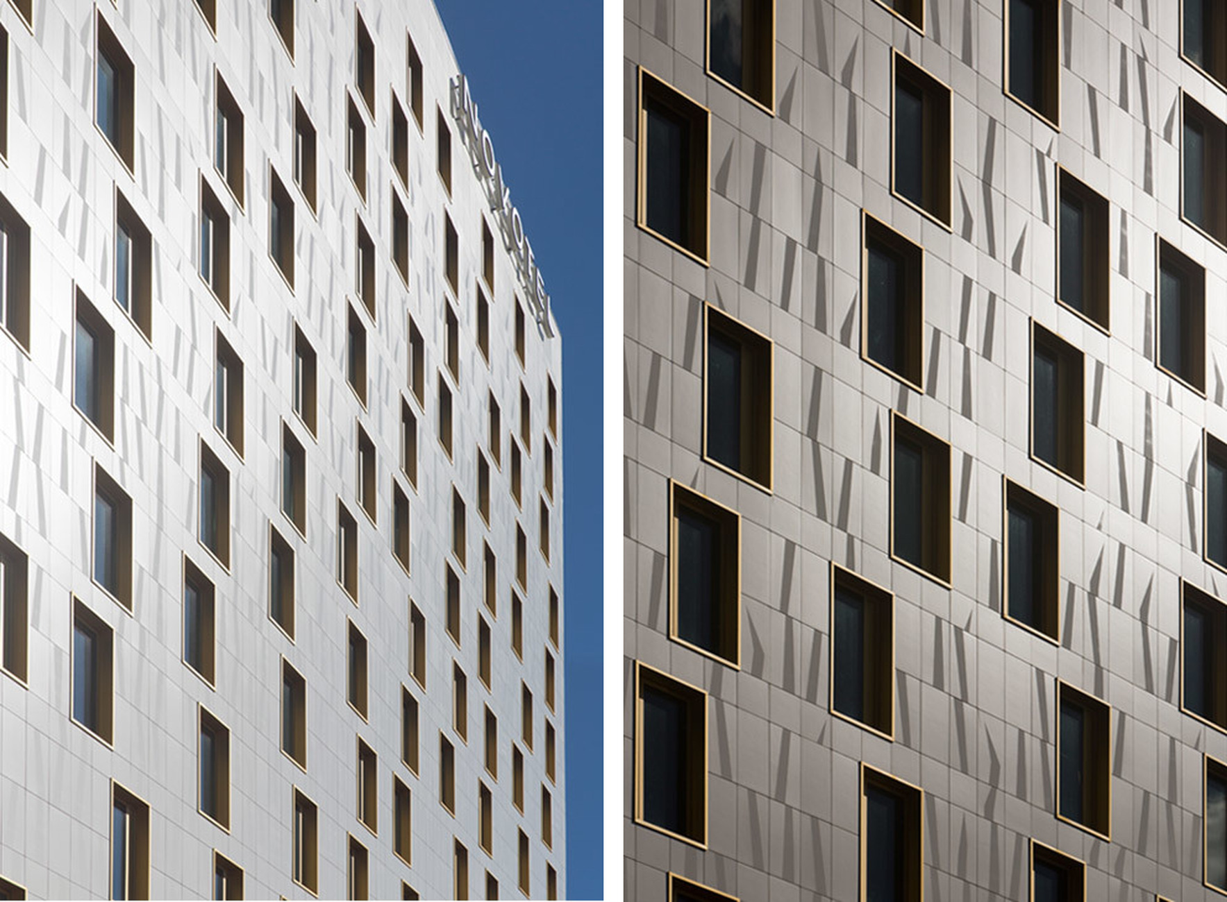 The tiles, measuring 60 x 120 and 60 x 60 centimeters, were inspired by the reed belt along the canals of Haarlemmermeer. “For Novotel Hoofddorp we wanted a light-colored facade with a soft radiance,” explains architect Robert Mulder. The result is a marvelous interplay of satin and high-gloss surfaces. Abstract reeds “grow” up the facade, printed in a high-gloss finish on stone-satin glazing. Yet the tiles not only display their own motif, but also reflect daylight. Owing to this effect, the building aesthetically melds into its surroundings despite its large size.
