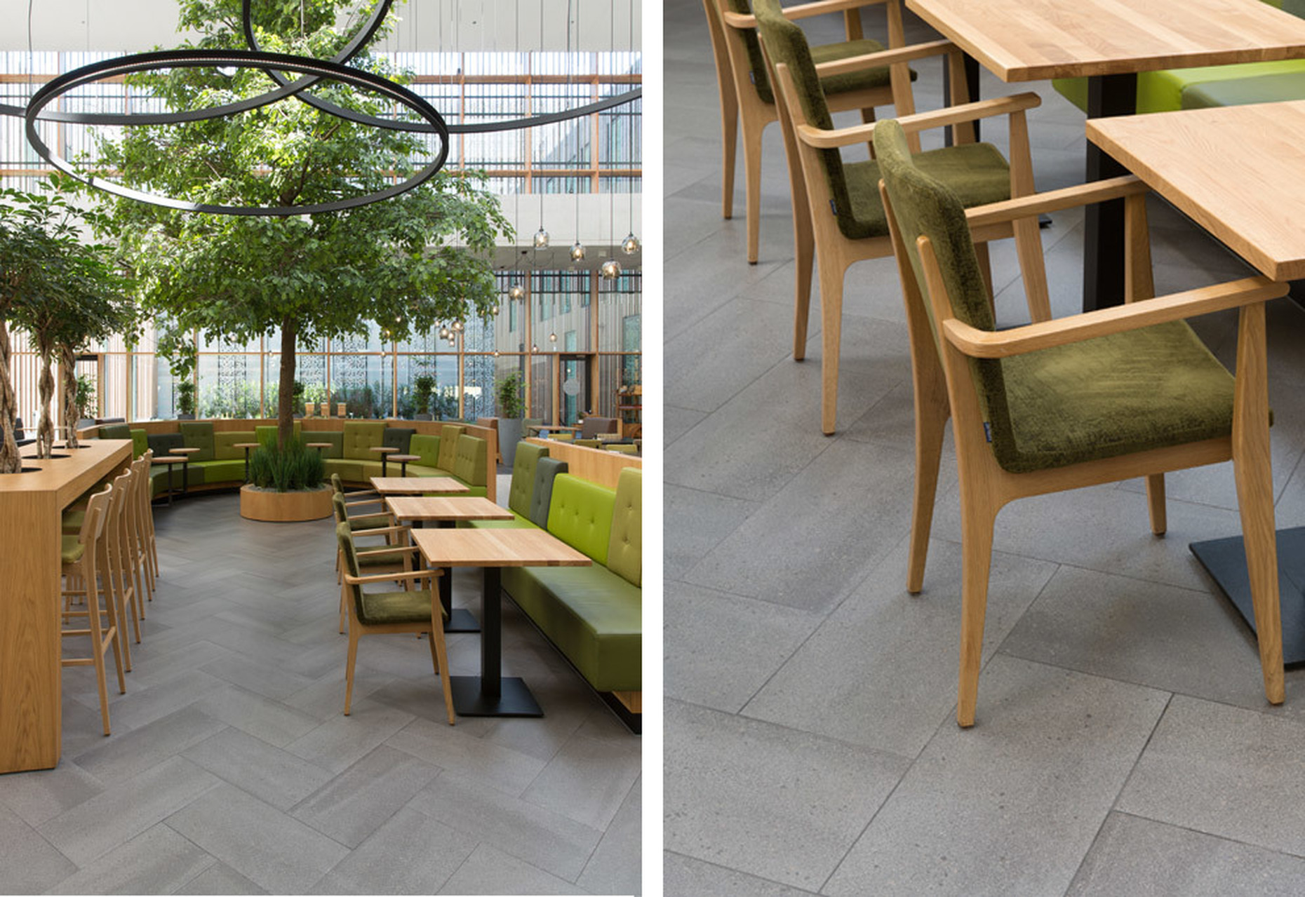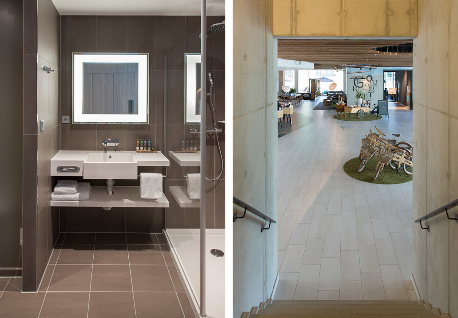 For walls and floors inside the hotel, and above all for the 314 bathrooms, the architects opted for Mosa’s current tile collection, including the series Terra Maestricht, Terra Tones, Beige & Brown and Mosa Murals. They were able to choose between unglazed and glazed tiles with numerous decors. The unglazed tiles are produced using the double-layer Ultragres process, making them suitable for use both indoors and outdoors. Whereas the upper surface is particularly abrasion-resistant, easy to clean, and frost-proof, the underside guarantees high strength, excellent dimensional stability, and optimum bonding with all suitable tile adhesives owing to a water absorption level of 0.3percent. The glazed wall and floor tiles are double-fired and feature a ceramic glass layer. They are low maintenance, abrasion-resistant, and highly versatile.
