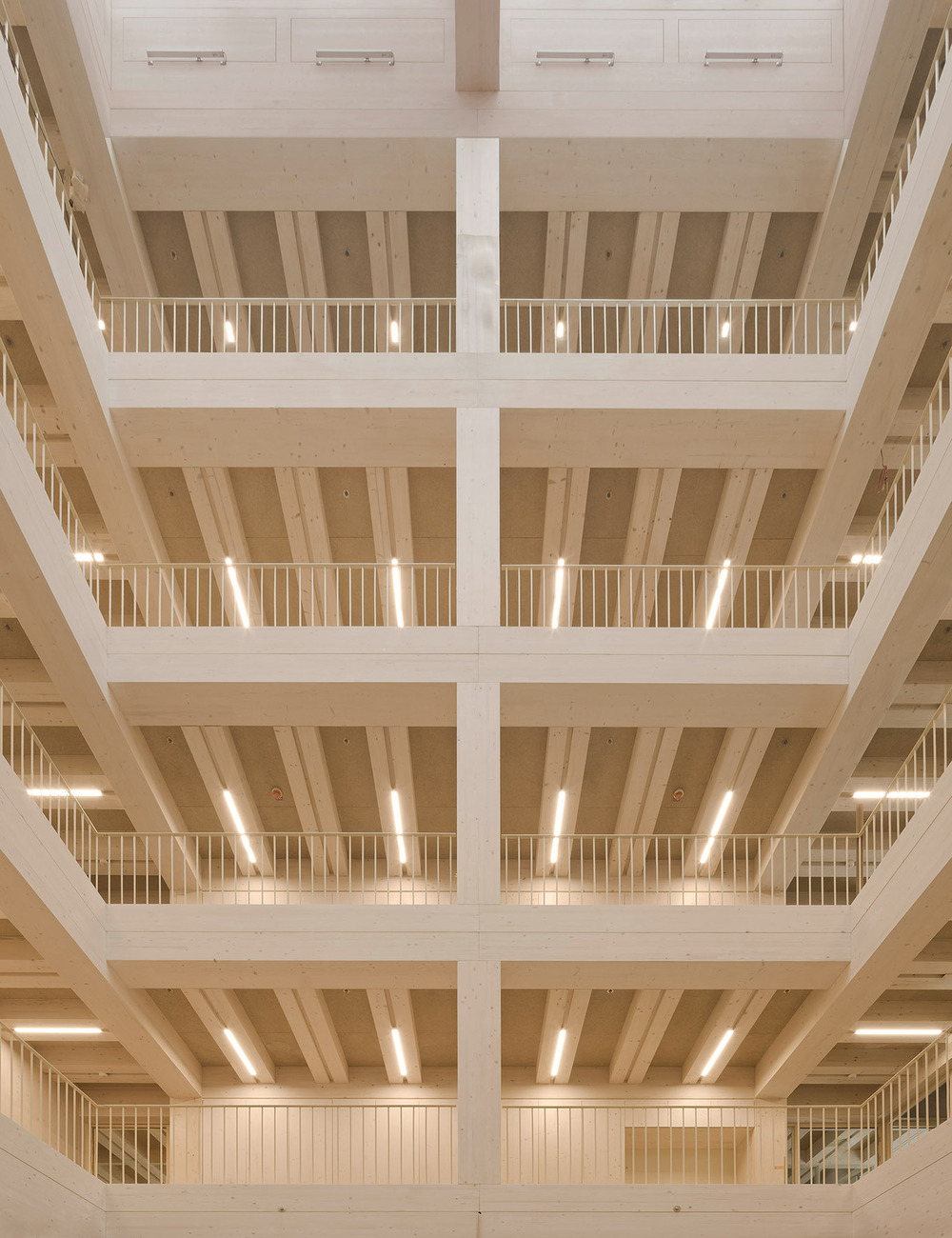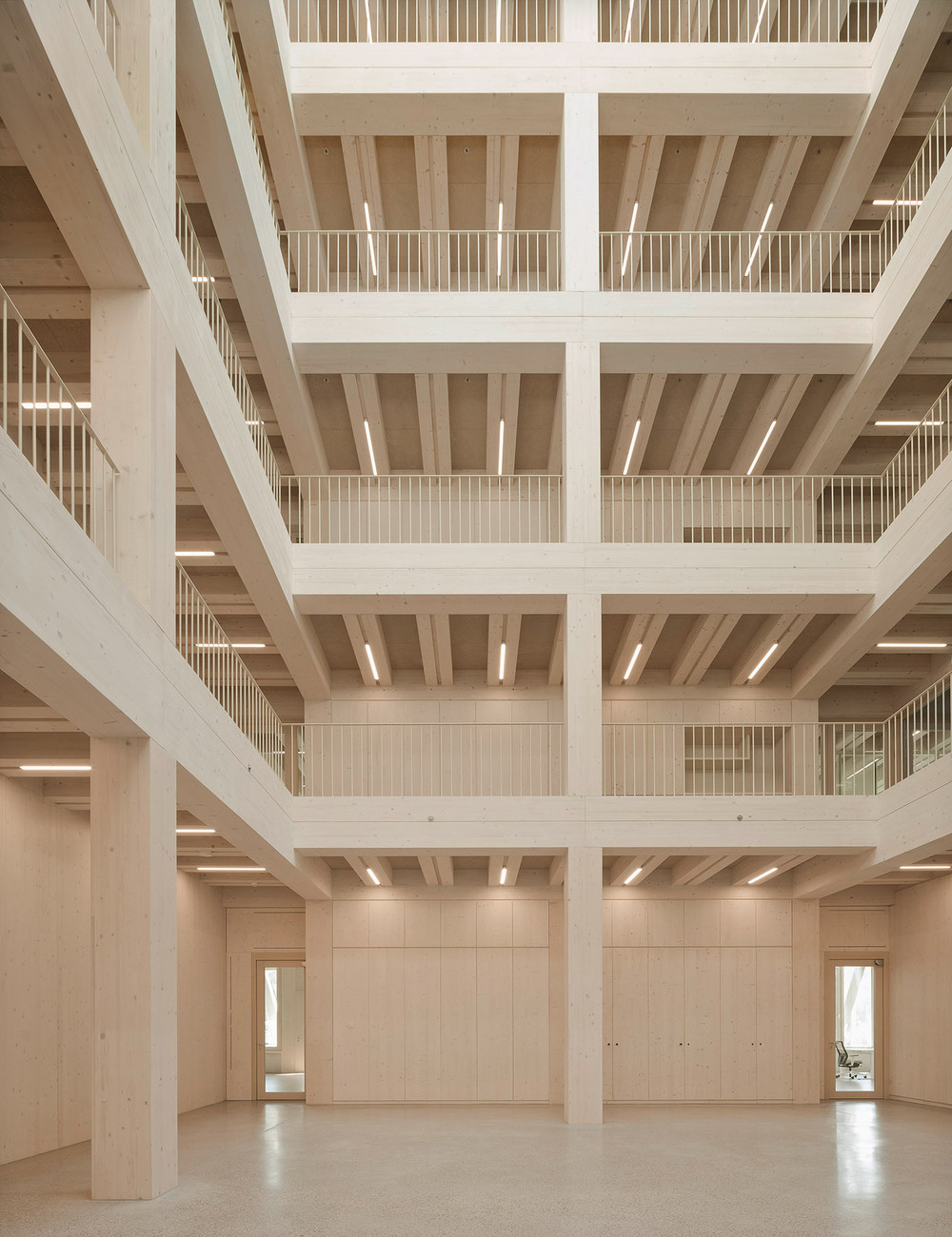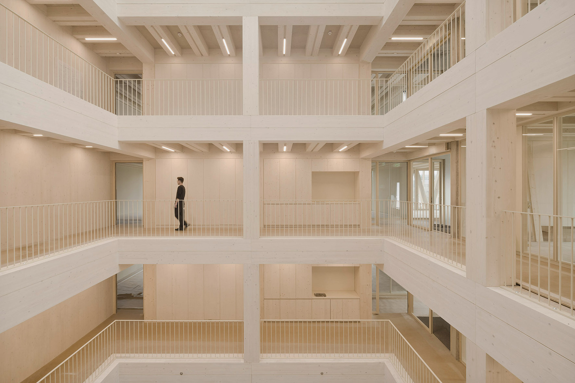 After the entrance area, a beautiful space opens up that extends through the house on all five floors up to the roof, where it is crowned by a glass lantern that brings daylight down to the ground floor and the walkways that surround the air space on each floor. A great space. Here you can experience the full quality of contemporary timber construction. The components are neatly and naturally joined according to their structural logic, and a spiral staircase connects the ground floor with the first floor. Both this small staircase sculpture and the metal balustrades of the walkways are painted in a beige that comes surprisingly close to the colour of the glazed wood.