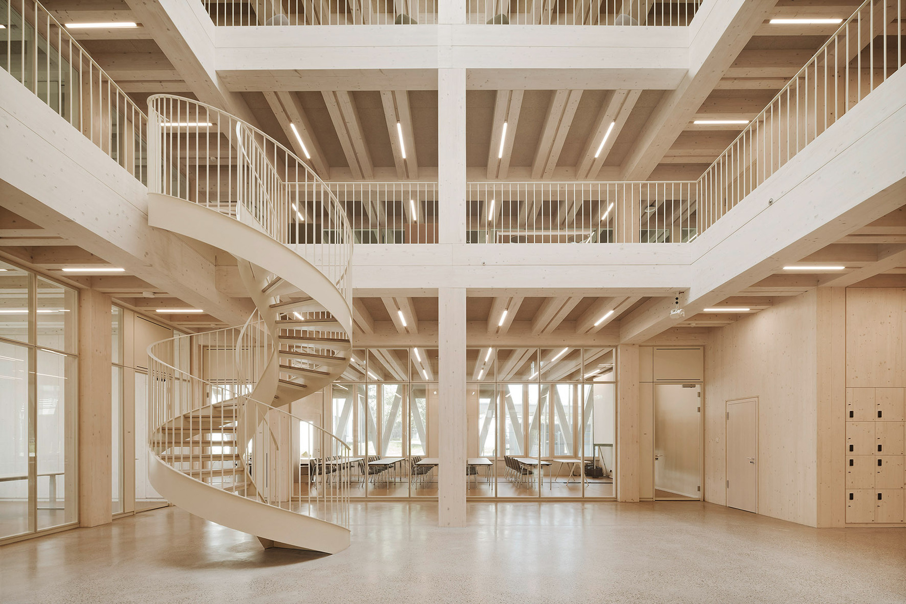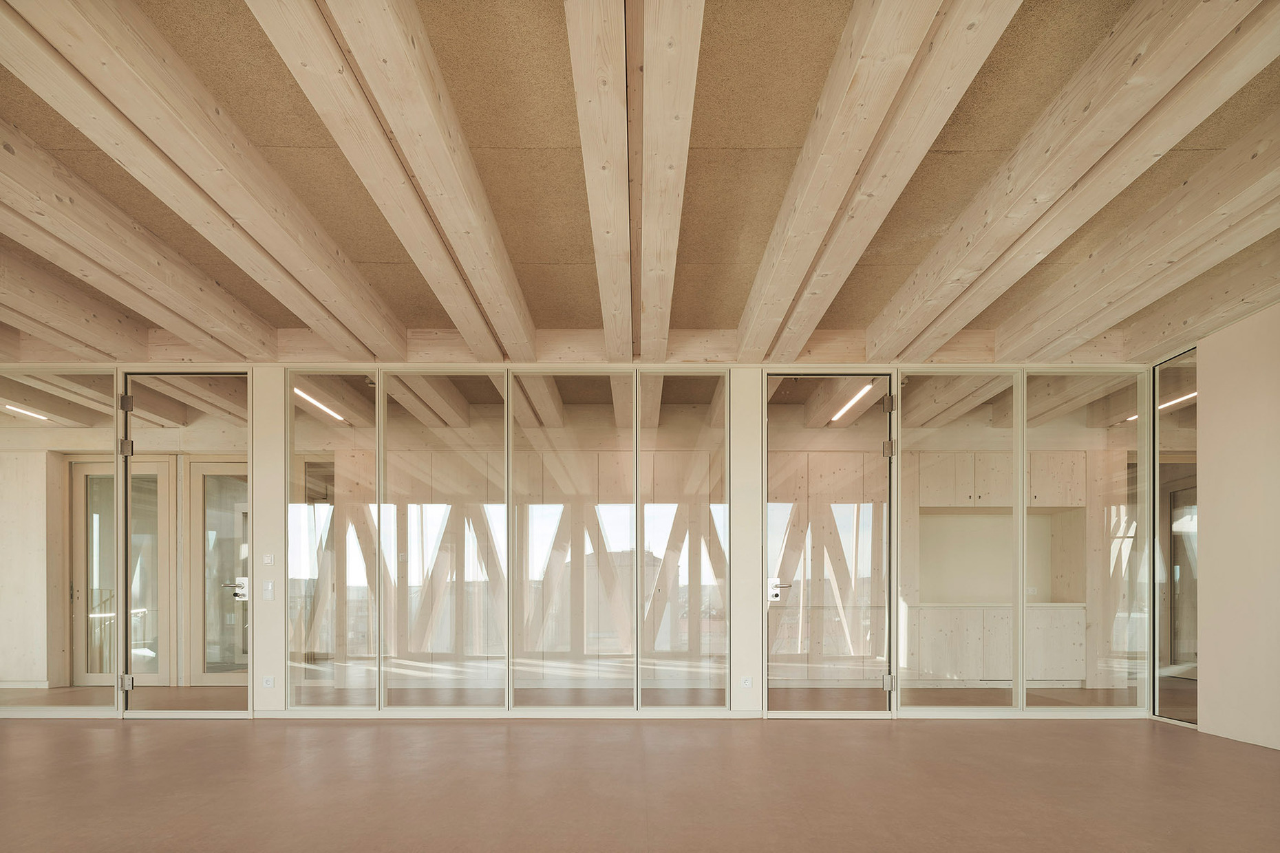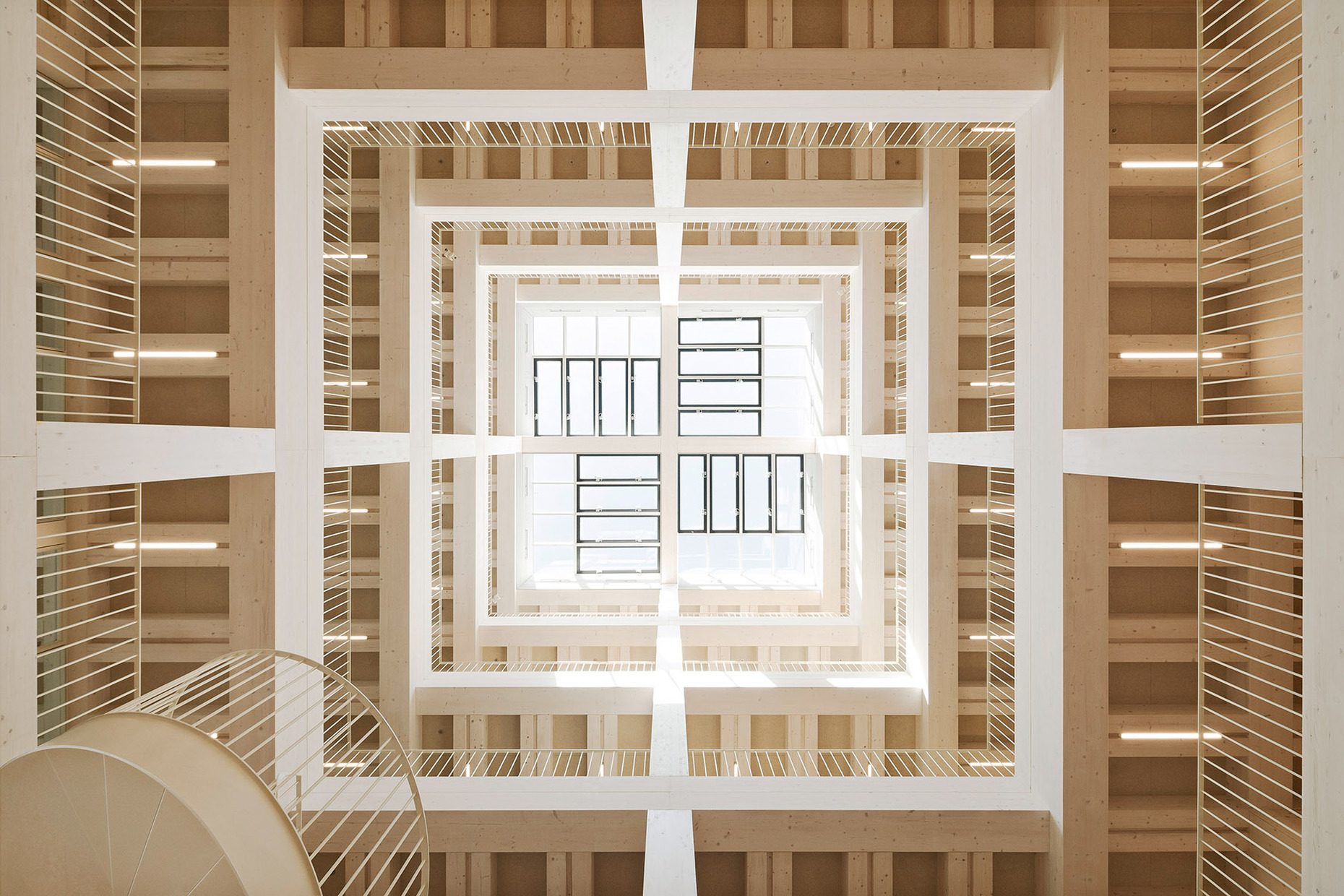 After the entrance area, a beautiful space opens up that extends through the house on all five floors up to the roof, where it is crowned by a glass lantern that brings daylight down to the ground floor and the walkways that surround the air space on each floor. A great space. Here you can experience the full quality of contemporary timber construction. The components are neatly and naturally joined according to their structural logic, and a spiral staircase connects the ground floor with the first floor. Both this small staircase sculpture and the metal balustrades of the walkways are painted in a beige that comes surprisingly close to the colour of the glazed wood.