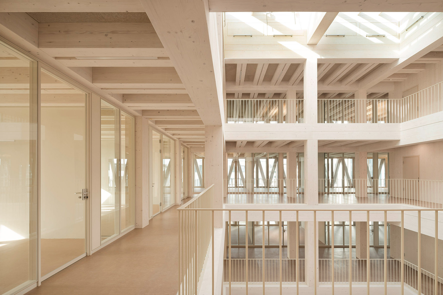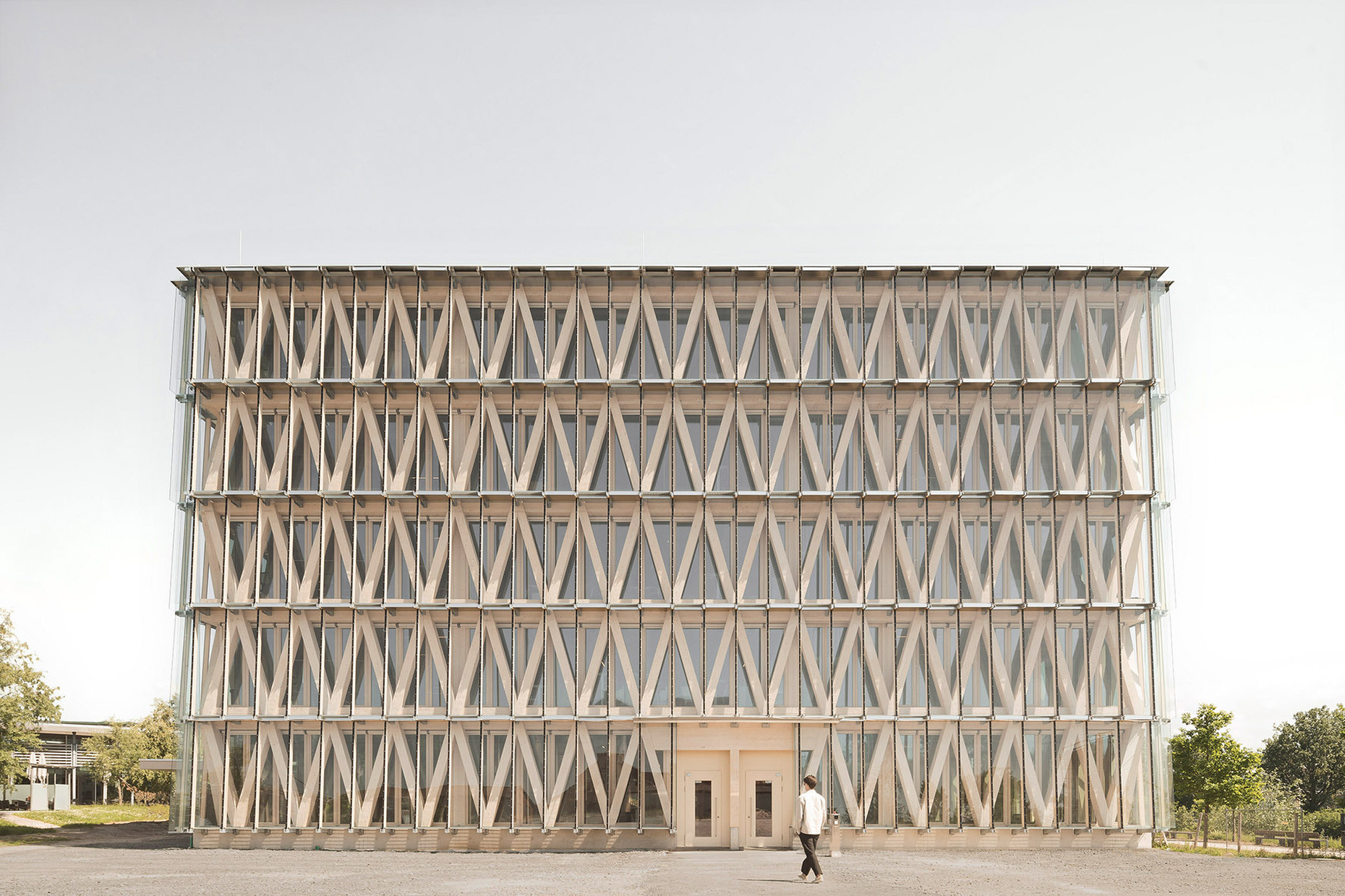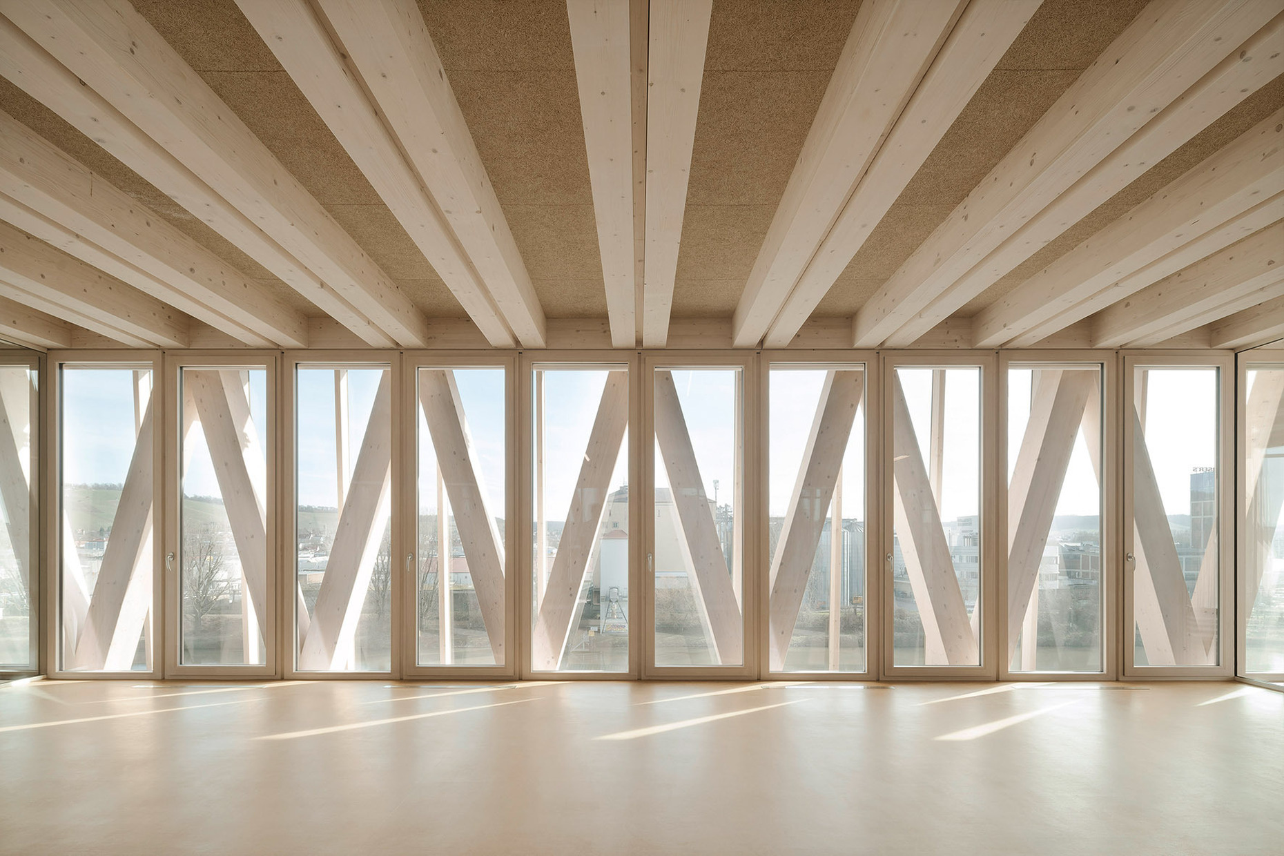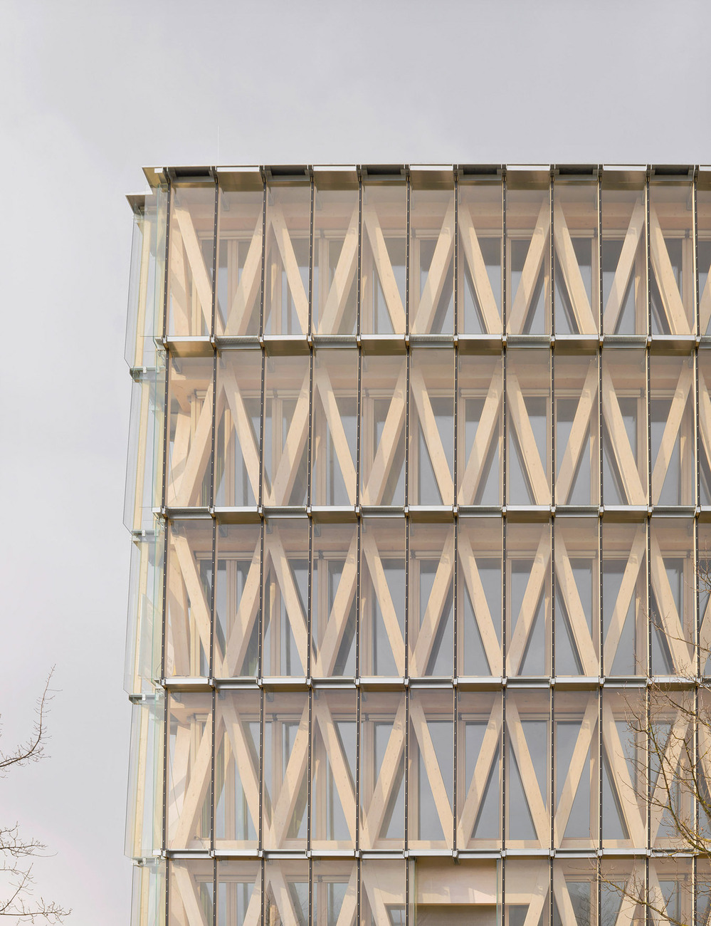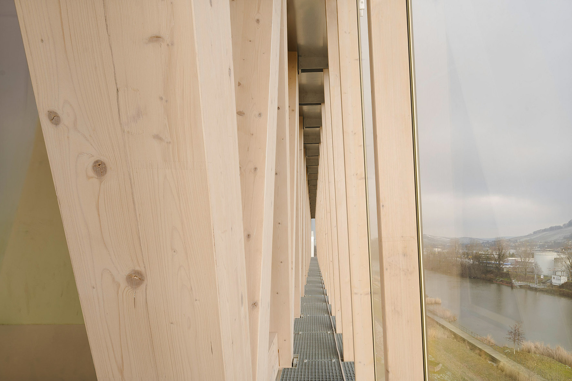 But in the second row, at the end of a cul-de-sac and directly on the Neckar, there is a remarkable part of this otherwise despondent piece of the city: the so-called Innovation Factory 2.0. Darmstadt-based Waechter+Waechter Architekten BDA realised the five-storey building as a replacement for an existing start-up centre that was located in a building that had been sold. The first thing that catches the eye is the façade with its timber structure protected by a scaled glass shell. The solid timber beams are positioned at an acute angle to each other so that they form a long chain of Vs. Or, in view of the office name, are they perhaps also Ws? According to the office, the dimensions and positioning result from the fire protection and the stiffening effect for the entire timber construction. The thickness of the components ensures their stability even in the event of a fire. The glass shed cladding, in turn, is the structural protection that protects the wood from wind and weather - except at the entrances, which are surprisingly small in the overall cubature of the house and are marked by metal canopy stumps that are again pleasantly unpretentious.