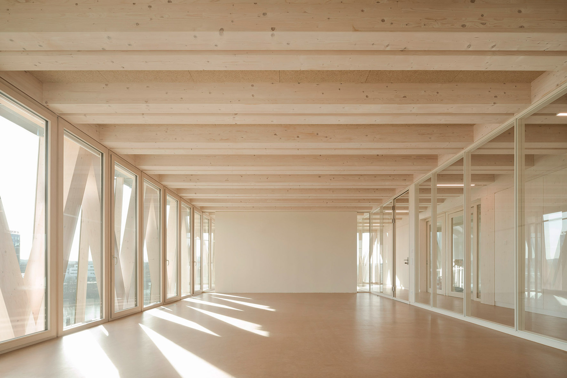 Two concrete staircase centres and a lift lead to the upper floors. The fact that these concreted components are ultimately needed is surprising in view of the façade with its V-shaped columns, which is also designed in this way in terms of its structural effect. Access cores or façade, one of the two might have been enough to stiffen the timber construction. And so the impression remains that, on the outside, the main aim was to create an image. In view of the qualities of the location and the genius that is supposedly or actually blowing in this loci, this is understandable on the one hand. On the other hand, the outer building envelope made of glass cannot do much more than protect the wood from the weather. Where it may still serve as additional sound insulation towards the harbour, it would have been conceivable in principle to use this actual intermediate space around the V-shaped wooden supports as a climate garden and thus for exits from the otherwise really beautiful offices.