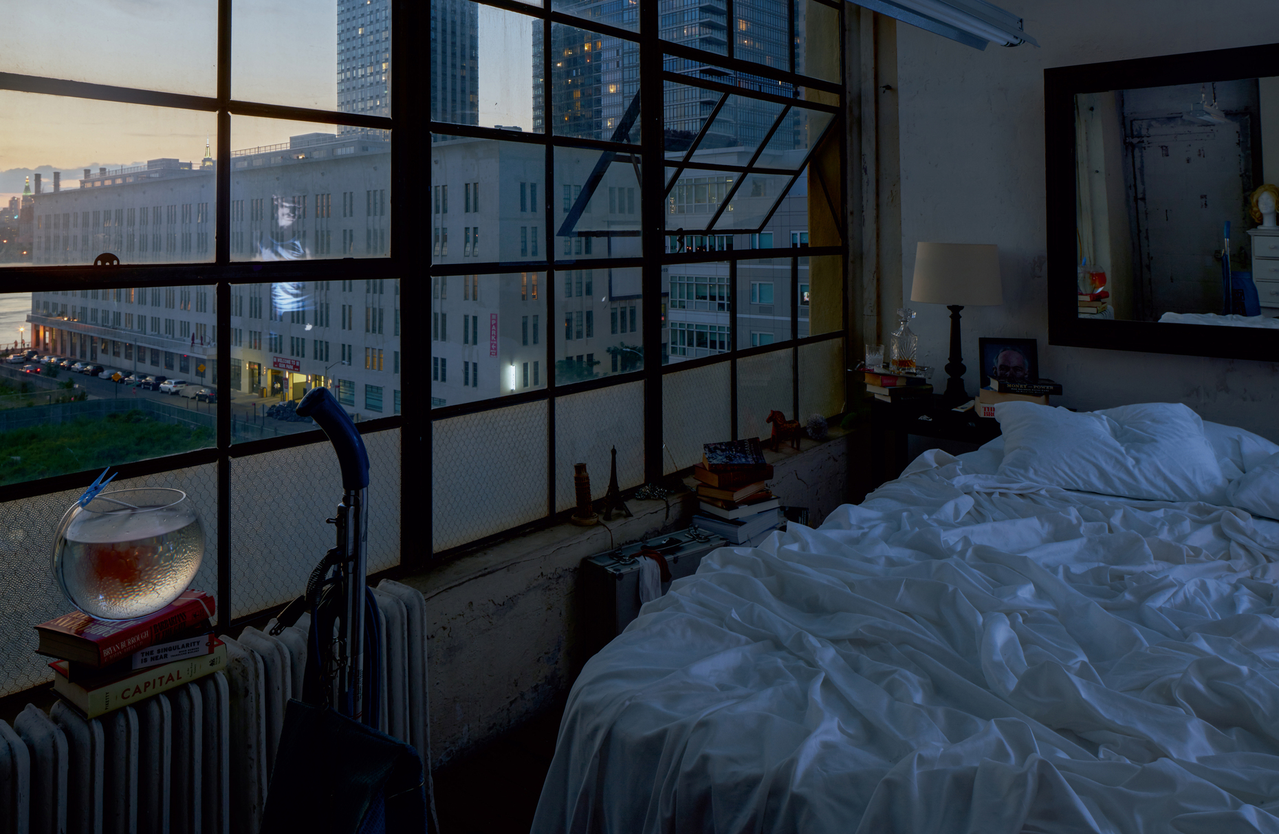 In all the shots, the viewer gazes from one and the same perspective into the bedroom of a New York loft apartment. We can discern the tip of the Empire State Building in the large windows. In the room itself there’s a bed with tousled sheets, books, a goldfish in a bowl, a vacuum cleaner. Reminiscent of American realism, the backdrop hardly changes in the first few images, the key player being the light of the setting sun that shines softly into the room. Only once the Blue Hour starts does the vague outline of a person appear, whose image can be seen in the large mirror above the bed. When night falls, the mysterious protagonist changes position, turns into another person, and eventually leaves us alone with the artificial city lights.