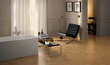 Reiche und schlichte Materialien, die sich in den Formaten und in den Farben ergänzen, um innovative Verlegungslösungen zu verwirklichen und