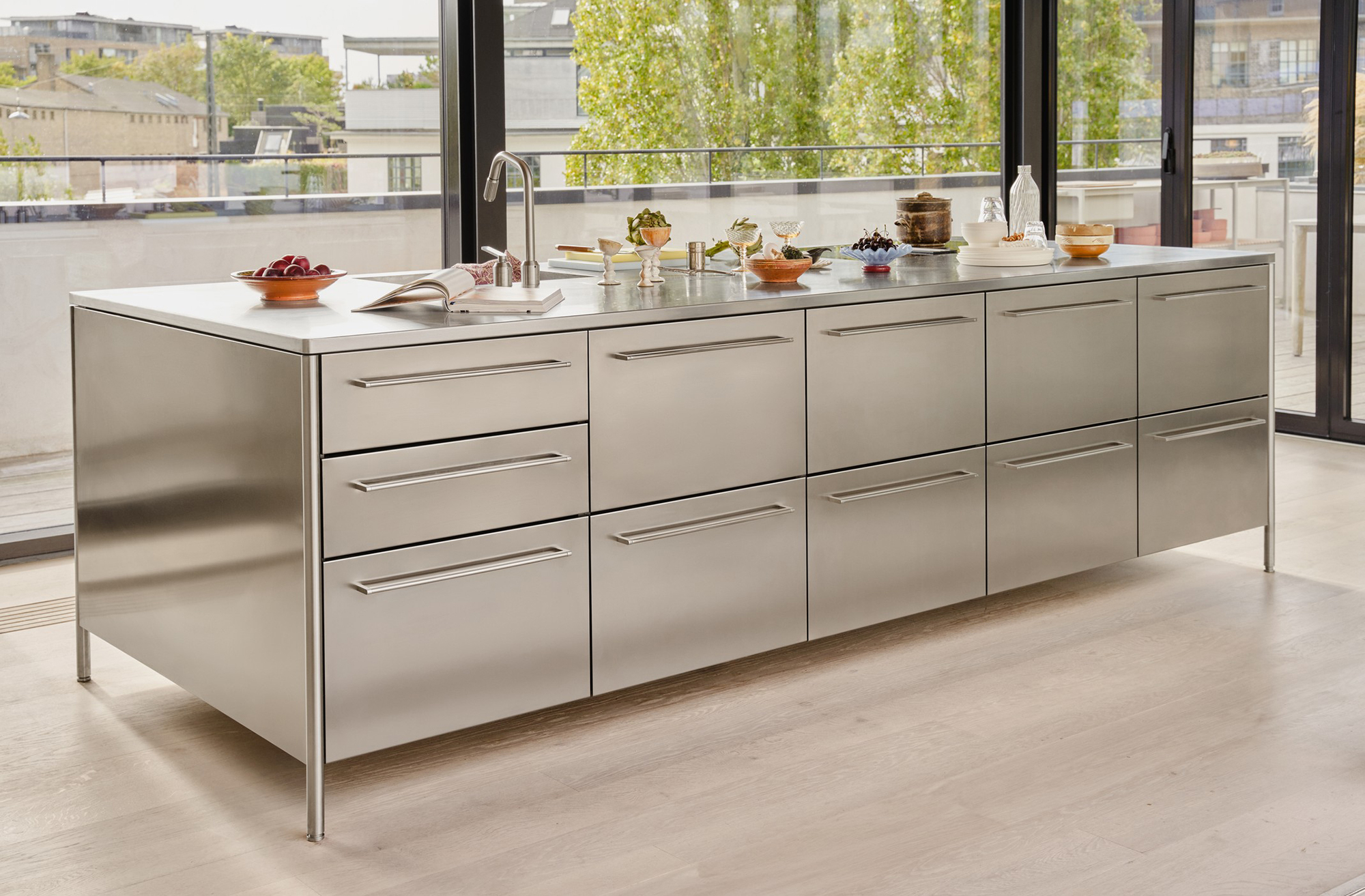 Die V4 kombiniert industrielle Ästhetik mit hoher Alltagstauglichkeit. Edelstahl gilt als besonders hygienisch, langlebig und pflegeleicht. Mit der Zeit entwickelt das Material eine charakteristische Patina, die seine Wertigkeit zusätzlich betont. Die Küche ist als Insel- und Wandmodul erhältlich und lässt sich mit Naturmaterialien wie Stein oder Holz harmonisch kombinieren.