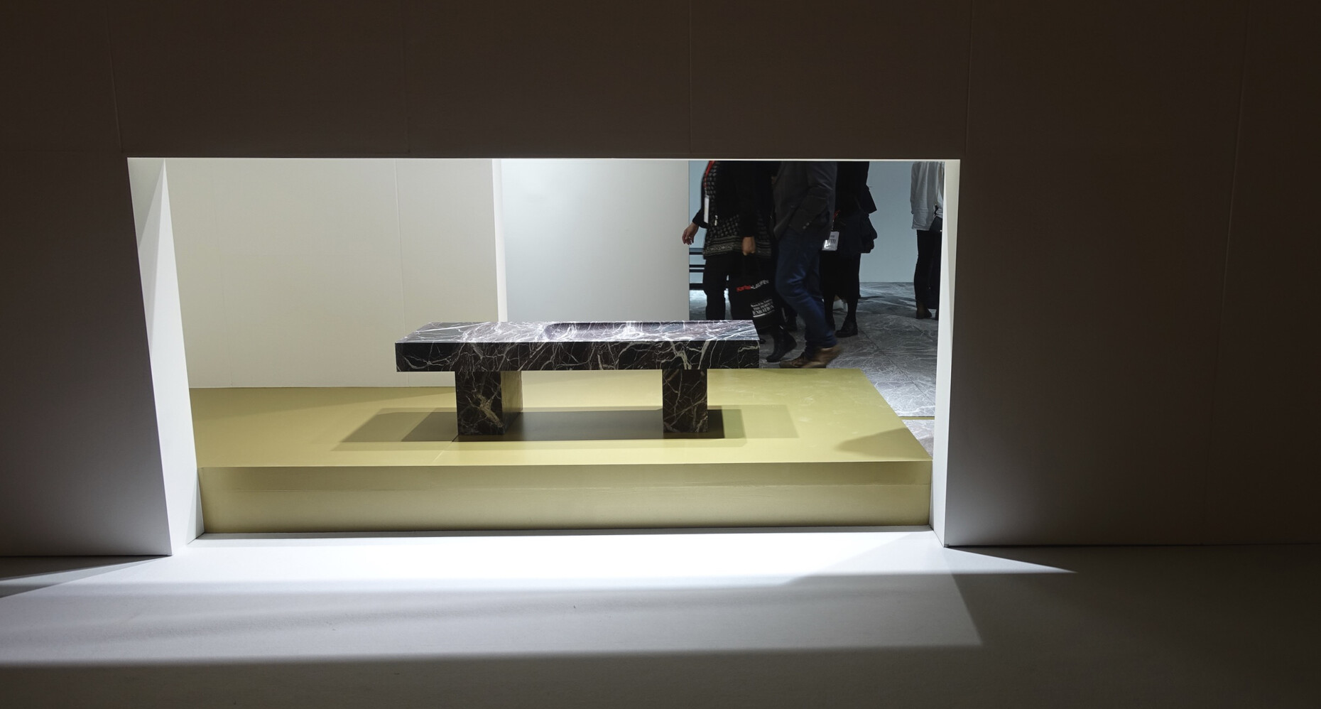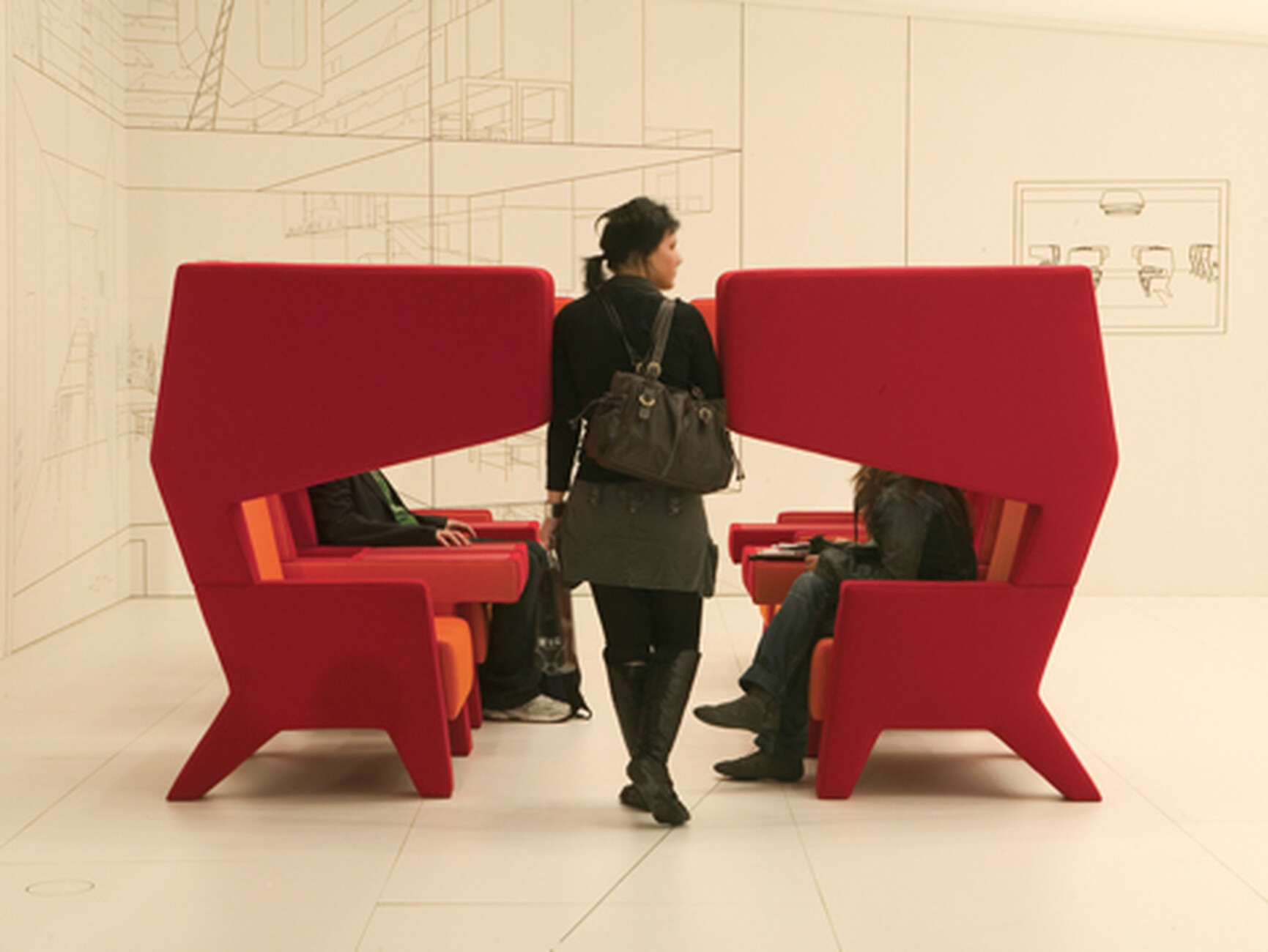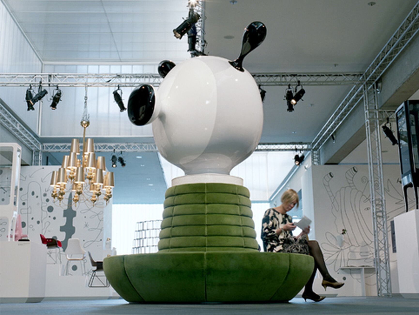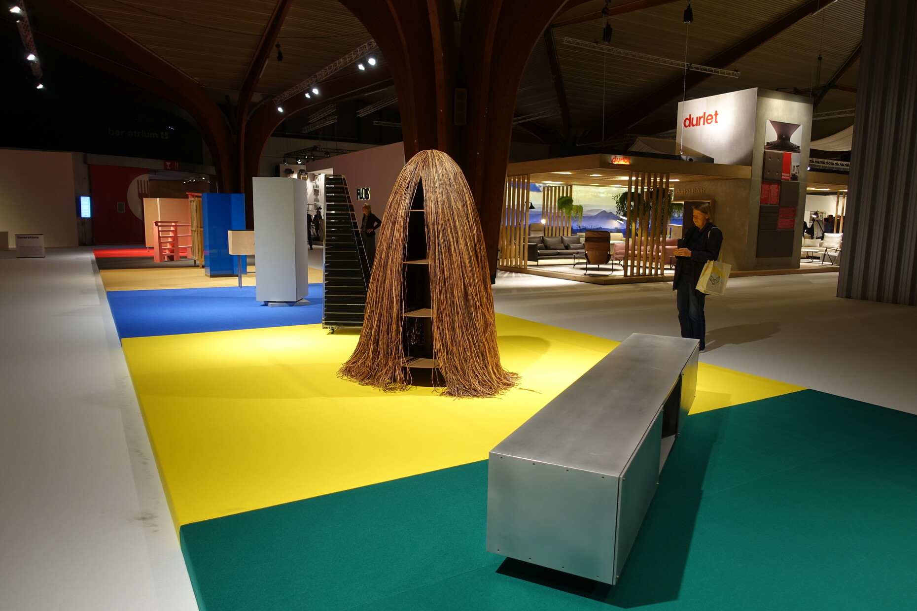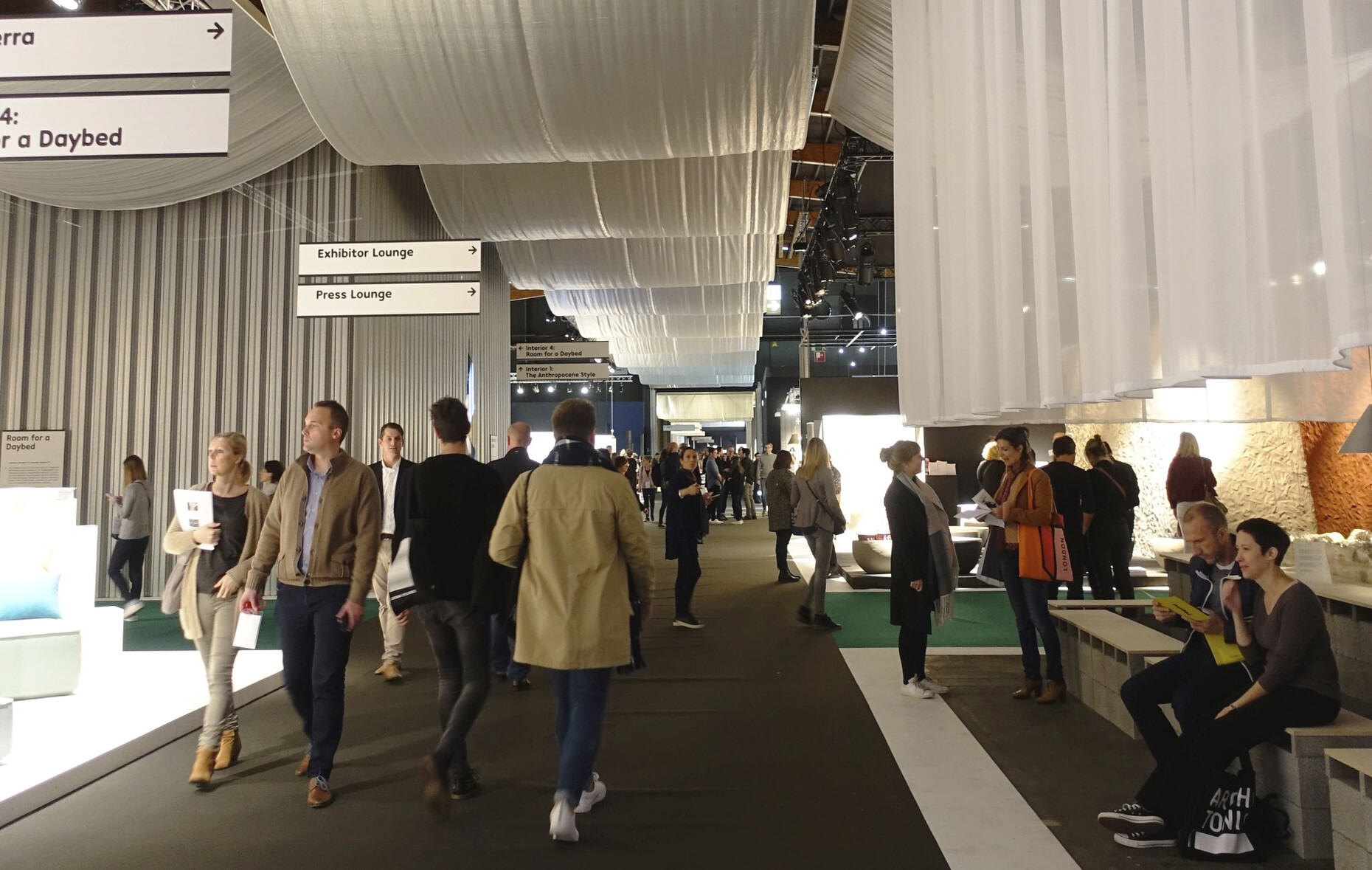 Als Kuratoren verantwortlich zeichnen in diesem Jahr die beiden Architekten Kersten Geers und David Van Severen vom belgischen Architekturbüro „Office Kersten Geers David Van Severen“. Ihr Jubiläums-Motto lautet: „Silver Lining Interiors“. In enger Zusammenarbeit mit dem Künstler Richard Venlet und dem Grafikdesigner Joris Kritis sind sie ebenfalls für das Ausstellungskonzept der Designmesse zuständig. Die Farbe Silber soll recht simpel dafür einstehen, dass die 1968 gestiftete Ehe von Kommerz und Kultur 25 Ausgaben lang gehalten hat. Also haben die Kuratoren die Gänge innerhalb der Messehallen mit einem Wegeleitsystem aus silbern schimmernden Stoffbahnen versehen. Am Boden markieren lange Teppichbahnen in Grau, Grün, Blau, Gelb und Rot die Hauptachsen. Die Strukturierung der Hallen funktioniert gut; nur hätte sich David Van Severen bei der Pressekonferenz den verstiegenen Hinweis auf die Malerei von Piet Mondrian und die Bedeutung des Rasters sparen können.
