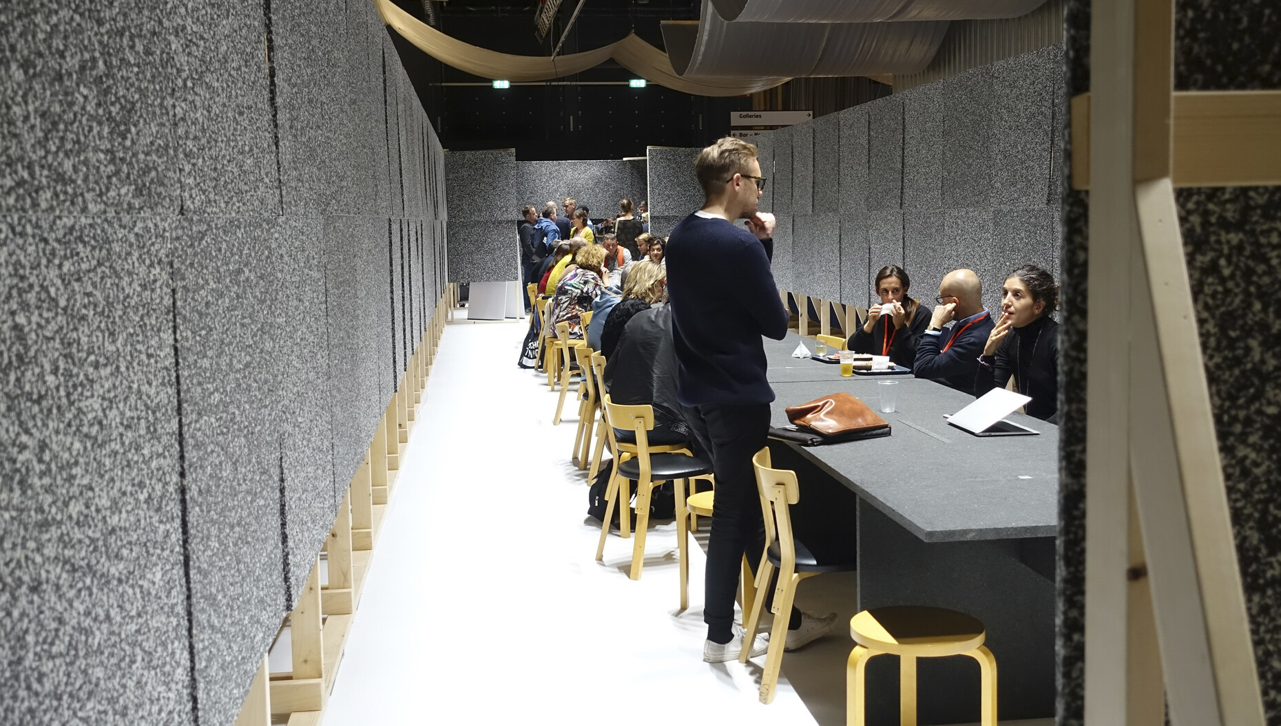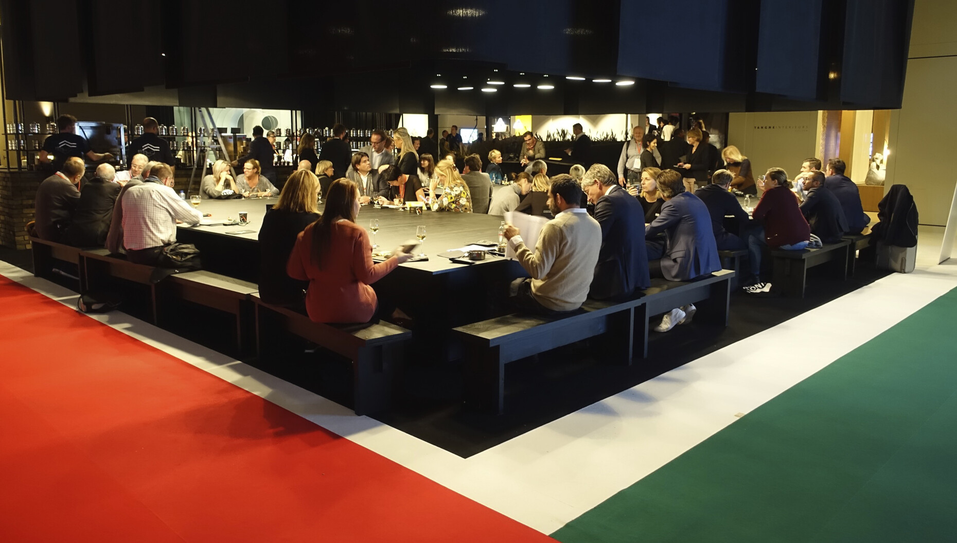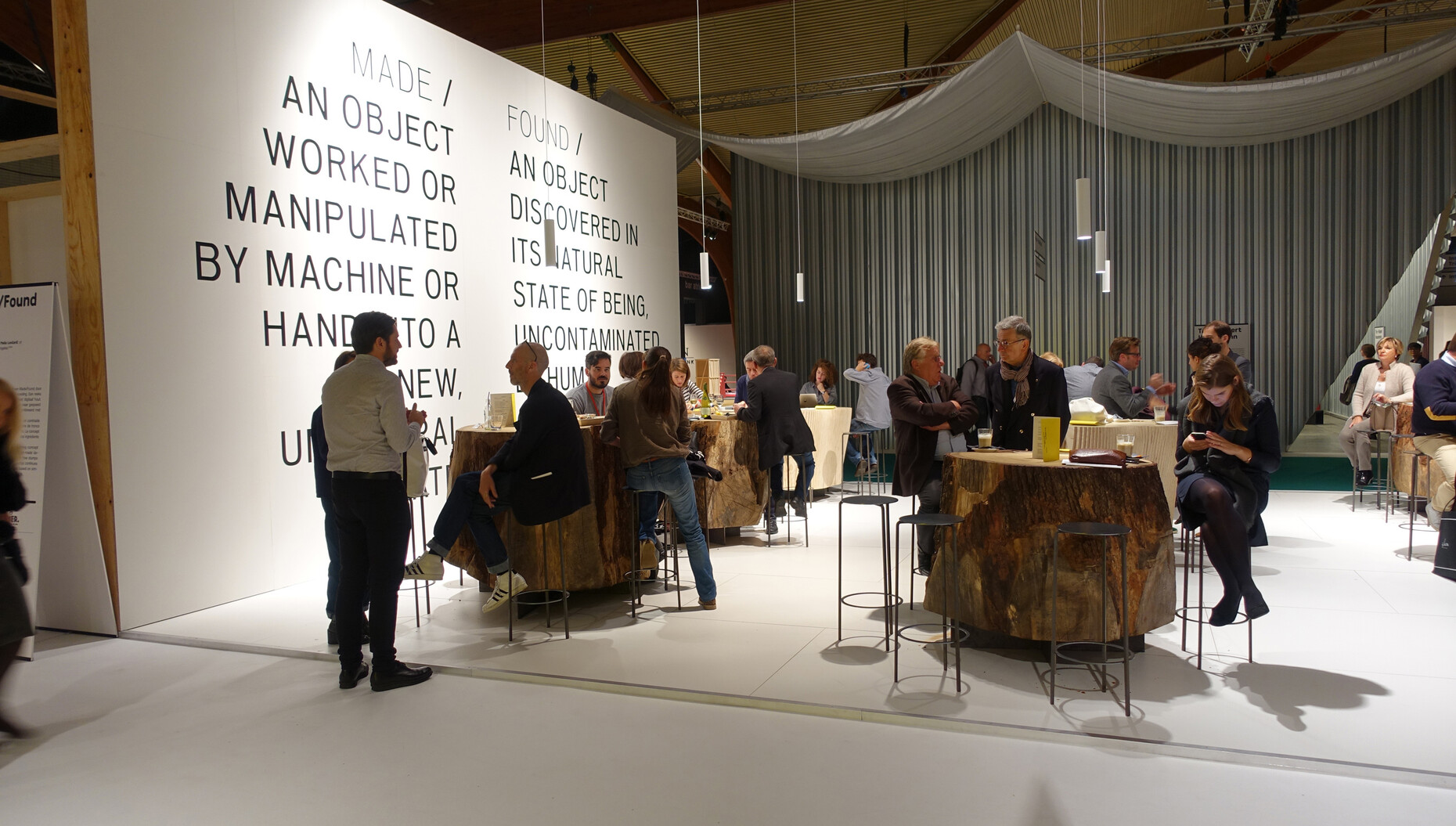 Weil man zu Recht stolz auf die eigene Geschichte und das Erreichte sein kann, will man es zum Jubiläum nun besonders gut machen. In vollem Umfang gelungen ist das nicht. Man möchte zwar ungern gleich von Krise sprechen (das Wort wird ohnehin so inflationär gebraucht wie die Worte Design und Kurator) – die Gründe aber, weshalb der oft so frische Geist von Kortrijk sich diesmal überraschend rar macht, müssen interessieren. Auf der Habenseite steht auch 2016: Die geschickt durchmischte Abfolge der Hersteller von Möbeln, Armaturen; Teppichen und Textilien sowie Anbieter neuer Materialien und Architektursysteme gestaltet einen Rundgang nach wie vor abwechslungsreich und sorgt für Überraschungen. Auch die Gewinner des Wettbewerbs in der Kategorie „Spaces“ zaubern abermals sehenswerte Restaurants und Bars zwischen die Stände – angefangen bei dem aus einfachsten Materialien gebauten, improvisiert wirkenden und zugleich perfekten Raum der „Bar Nose“ bis hin zu den Natürliches und Digitales einander gegenüberstellenden Baumstämmen von „Made/Found“ und der offenen und kreisrunden Theke von „Le Banquet Gaulois“.