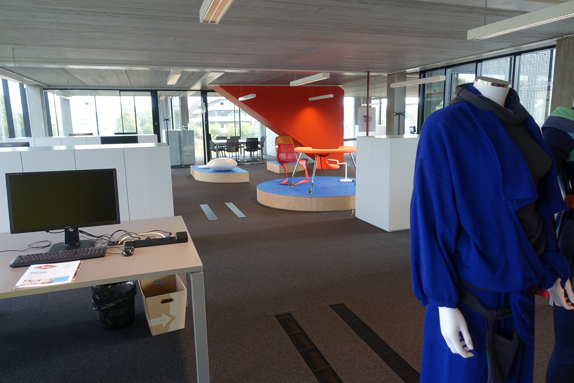 Es fällt aber auch auf: Die so zentrale Verzahnung von Messe und Kultur, Geschäft und Reflexion, zeigt plötzlich Schwächen, ja, sie scheint mit einem Mal fast verschwunden zu sein. Man habe, so ist von offizieller Seite zu hören, den Standort Messegelände stärken, das Nachdenken mittels Ausstellungen und anderen Aktivitäten in die Hallen der XPO zurückholen wollen. Ein kurzer Spaziergang durch die Stadt und über die von der Leie eingerahmte Buda-Insel offenbart dann auch: Von der Biennale ist hier so gut wie nichts mehr zu sehen. Während 2012 ein kolossaler magentafarbener Stuhl auf dem Großen Markt in der Stadtmitte stand und 2014 in der Turnhalle einer alten Schule (neben den von der ehemaligen Stadtbefestigung übrig gebliebenen Broel-Türmen) Staubsaugerroboter Wiener Walzer tanzten, bleibt die Innenstand heute Einheimischen und Touristen überlassen. Flanierte man bei früheren Ausgaben durch die Buda Factory oder lauschte im Buda Tower einem außergewöhnlichen Konzert der Band „Goose“, bei dem jeder der vier Musiker zwar leibhaftig in einem anderen Stockwerk auftrat, sein Spiel dann aber doch medial in Bild und Ton zusammenstimmte, finden sich diesmal außerhalb der Messe keine solchen Highlights mehr. Selbst die in das neue Voka-Bürogebäude unweit der XPO ausgelagerte Schau zur Geschichte der Biennale bleibt eine lieblos auf kleine Viertelkreise zwischen Schreibtische gezwängte Ansammlung weniger Objekte.