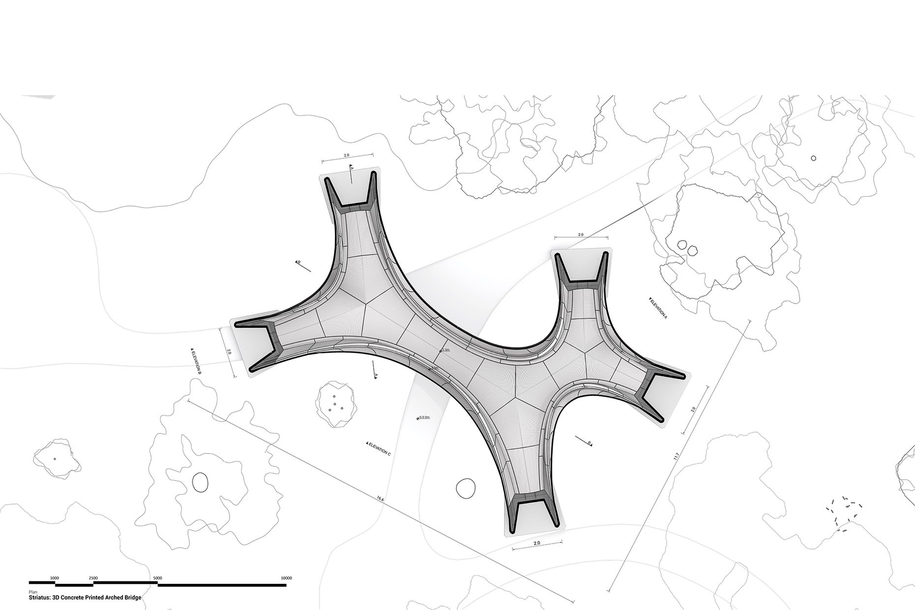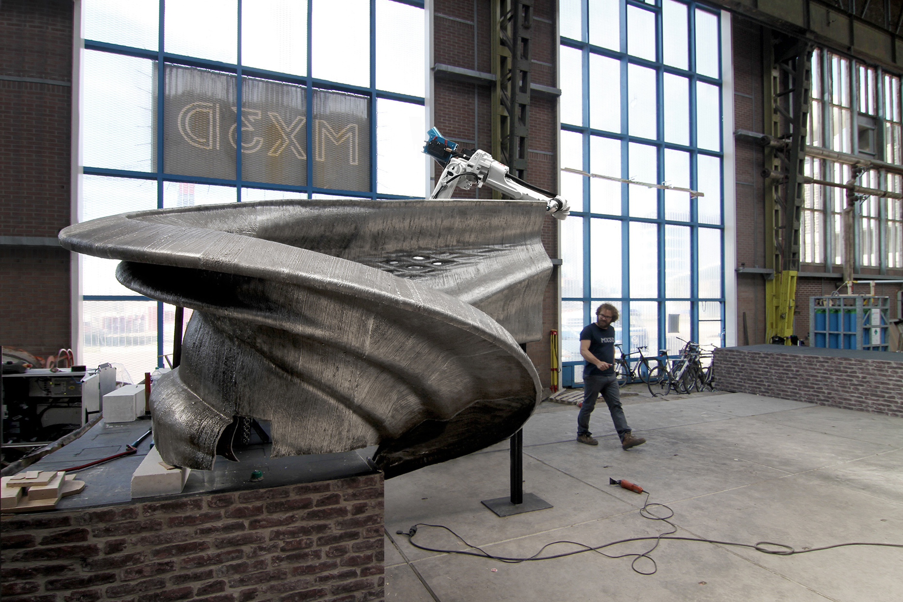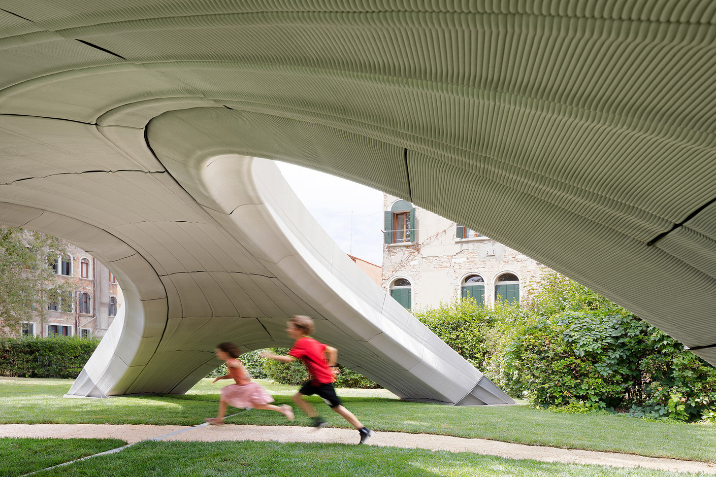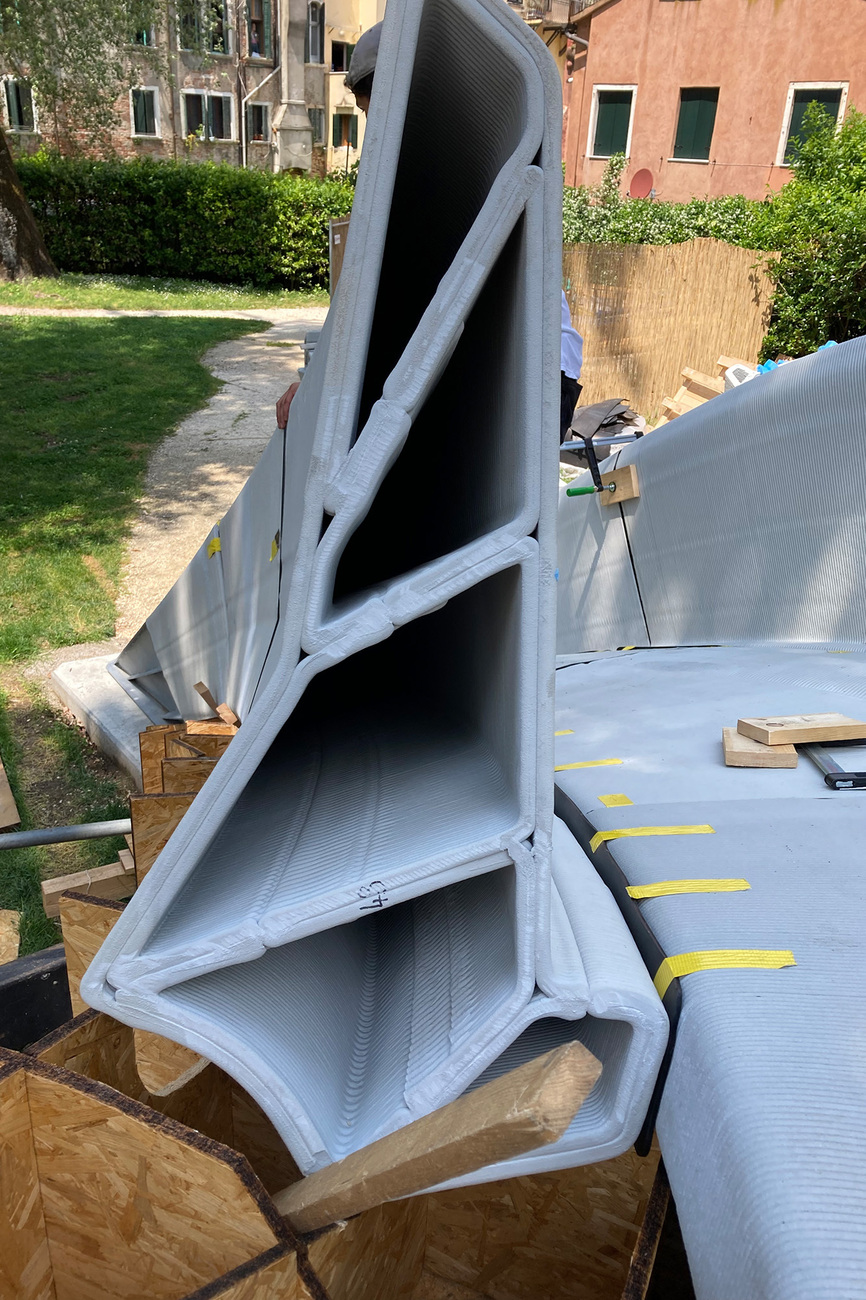 Und so könnten die Möglichkeiten des 3D-Drucks zu einem neuen architektonischen Vokabular führen, das besonders für die großen Formschaffenden unter den Architekten interessant sein dürfte. Deshalb überrascht es nicht, dass Zaha Hadid Architects gerade eine unbewehrte Brücke fertig gestellt haben, die in Zusammenarbeit mit der Block Research Group (BRG) der ETH Zürich entwickelt wurde. Das für die diesjährige Architekturbiennale errichtete Bauwerk setzt sich aus 3D-gedruckten keilförmigen Beton-Hohlblöcken zusammen, die nur durch die Schwerkraft zusammengehalten werden. Sie bilden eine Art Gewölbe aus, dass die Last auf die Fundamente verteilt und sich an den statischen Prinzipien der gotischen Kathedralen orientiert. Die Brücke ist im Übrigen – und das sei hier der Vollständigkeit halber noch erwähnt – die "erste in 3D gedruckte Bogenbrücke ihrer Art".