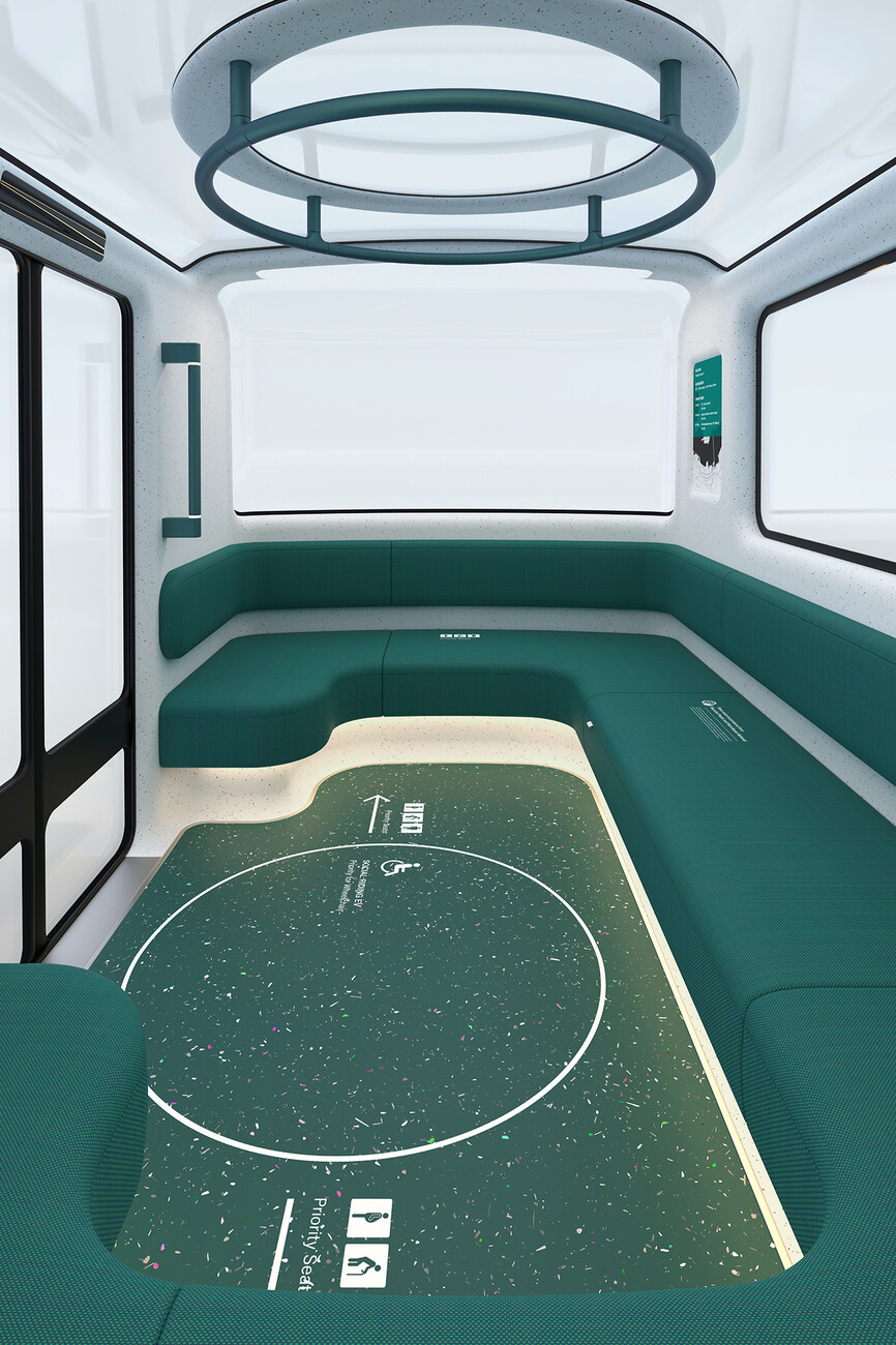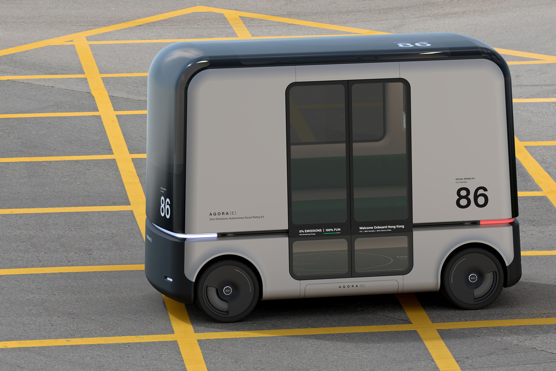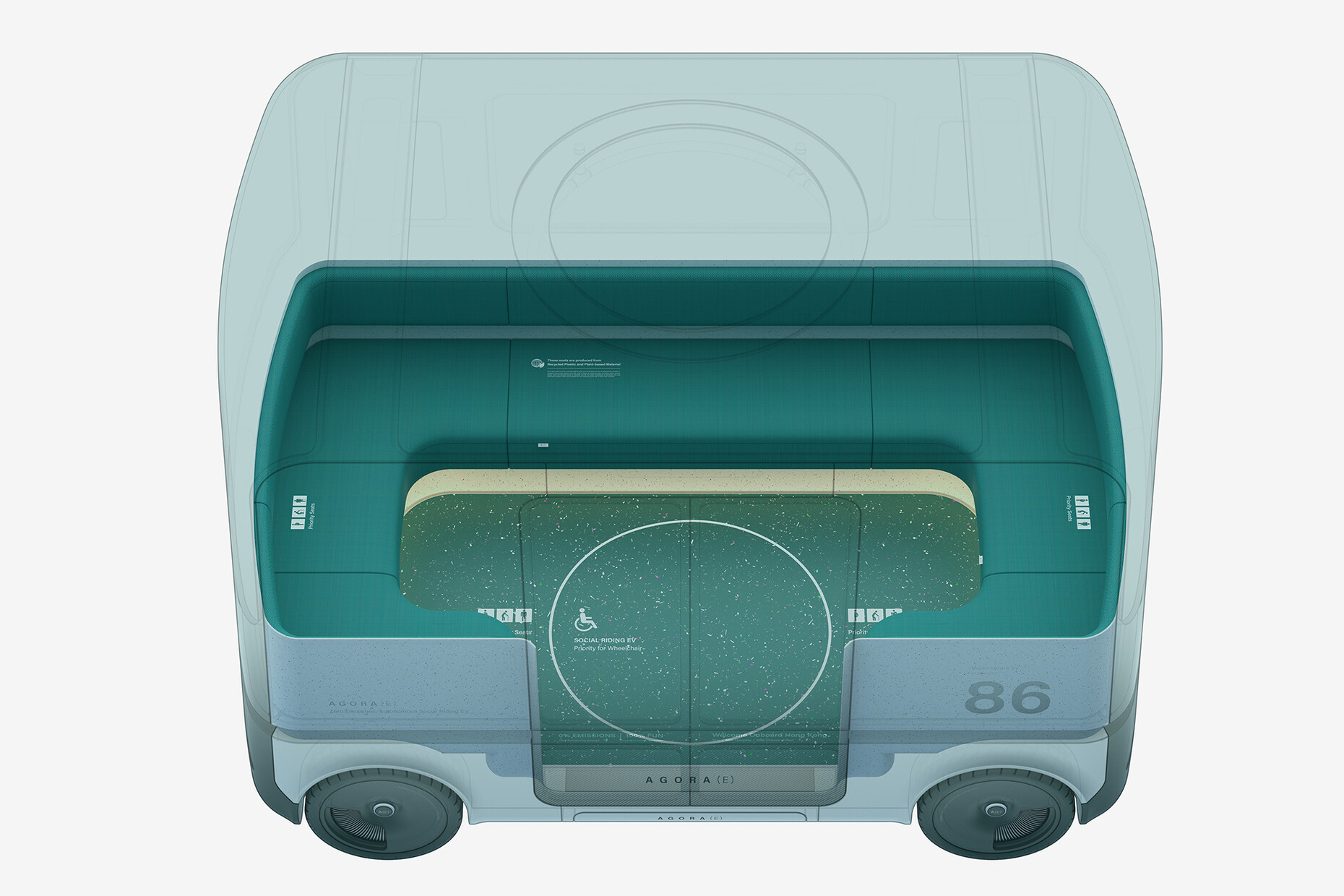 Mit der Wahl auf Tannengrün für Boden und Polster soll eine beruhigende Atmosphäre geschaffen und der Nachhaltigkeitsgedanke transportieren werden. Diesen setzt er innerhalb der Kabine mit recycelten und nachwachsenden Materialien um. Den Außenraum sieht Ponti als kompakten Quader vor. Damit nutzt er Stadt- und Innenraum auf effizient Weise aus. Seiten, Decke und Schiebetüren sieht er mit großflächigen Verglasungen vor. Sie ließen nicht nur natürliches Licht ins Innere, sondern ermöglichten auch "einen ungehinderten Blick auf das ikonische Stadtbild von Hongkong", so der Gestalter. Aktuell sucht Ponti nach Verbündeten, um Agora E auf die Straße zu bringen. Ob das gelingt oder nicht, in jedem Fall macht er aufmerksam auf die vernachlässigten Aspekte des Transportwesens: Er zeigt, öffentlicher Nahverkehr ist nicht nur nachhaltig, sondern auch sozial und vielleicht sogar unterhaltsam. Vielleicht werden die Menschen in diesem Bus der Zukunft — nach antikem Vorbild — bald wieder näher zusammenrücken. (ncm)
