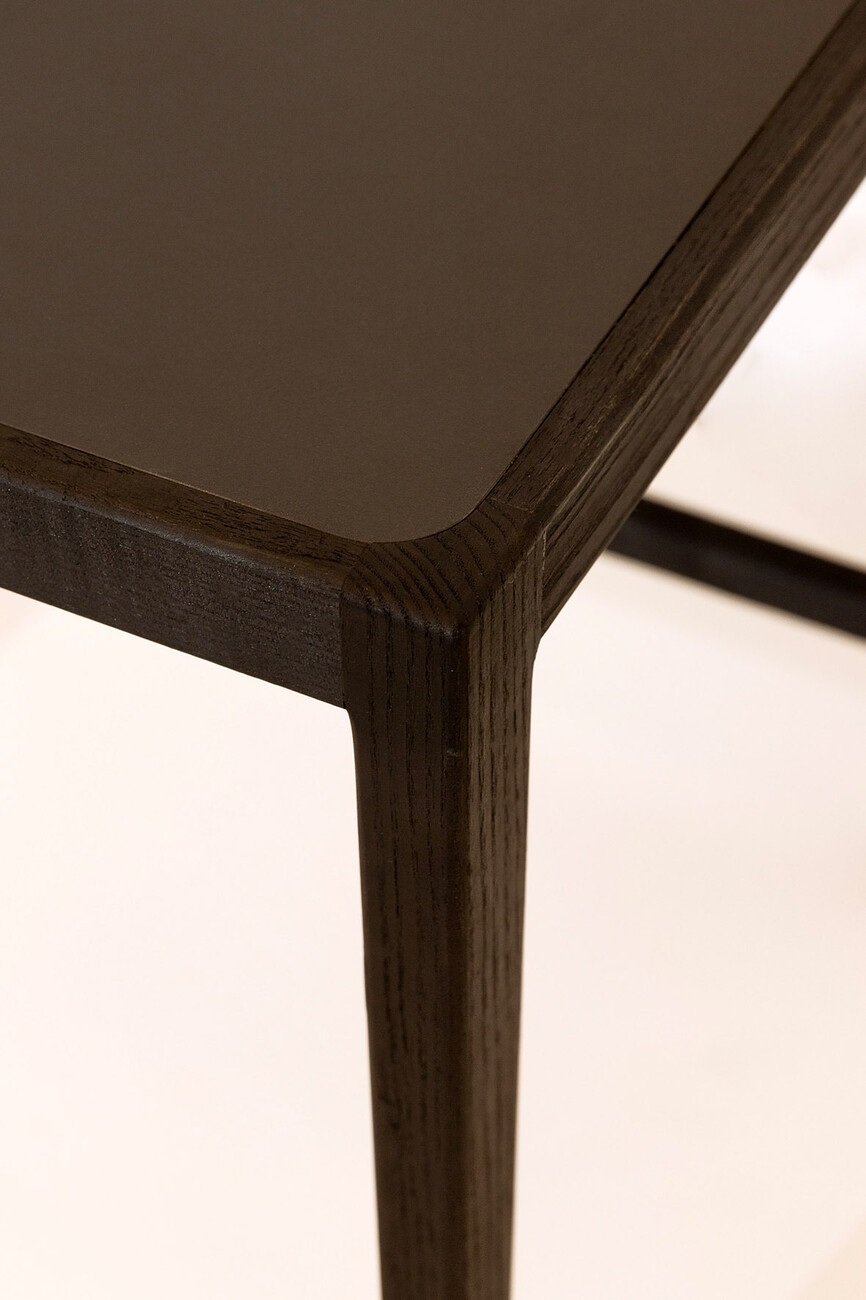 Alexander von Dombois: Ich liebe dieses Material – allein der Geruch! Es wirkt erstmal total technisch, und wer nicht weiß, was es ist, tippt wahrscheinlich zuerst auf Leder oder sogar einen Kunststoff. Dabei ist es komplett natürlich, besteht aus Leinöl, Holz- oder Korkmehl und Kreide. Und es wird mit der Zeit immer schöner. Wenn es an den Rändern speckig wird, sieht das einfach gut aus. Es gibt kein besseres Material, um darauf zu schreiben. Heute sieht man Linoleum-Tischplatten in jeder hippen Naturweinbar. Ich fand es spannend, diesen Werkstoff mal wieder ganz klassisch als eingelassene Sitzfläche in einen Holzzargenstuhl zu bringen.