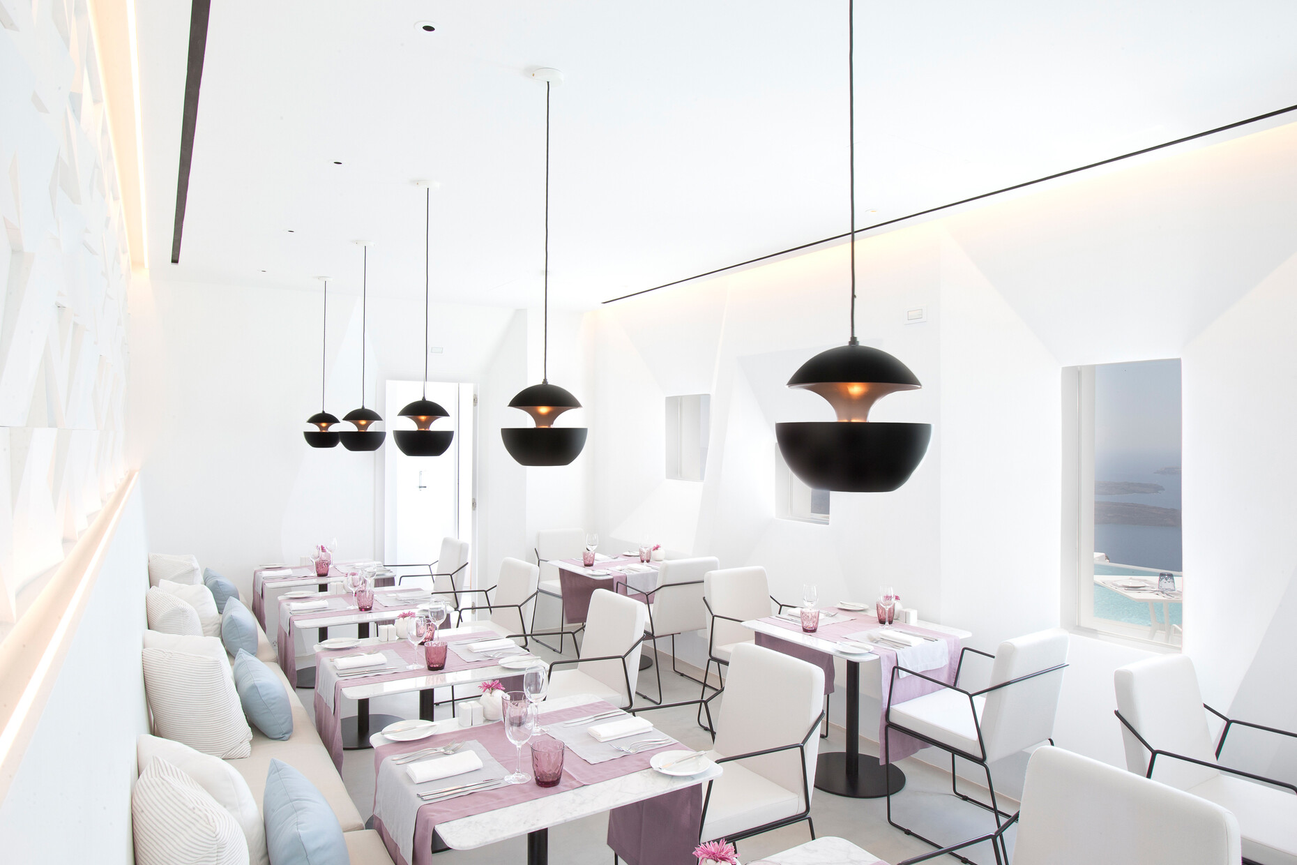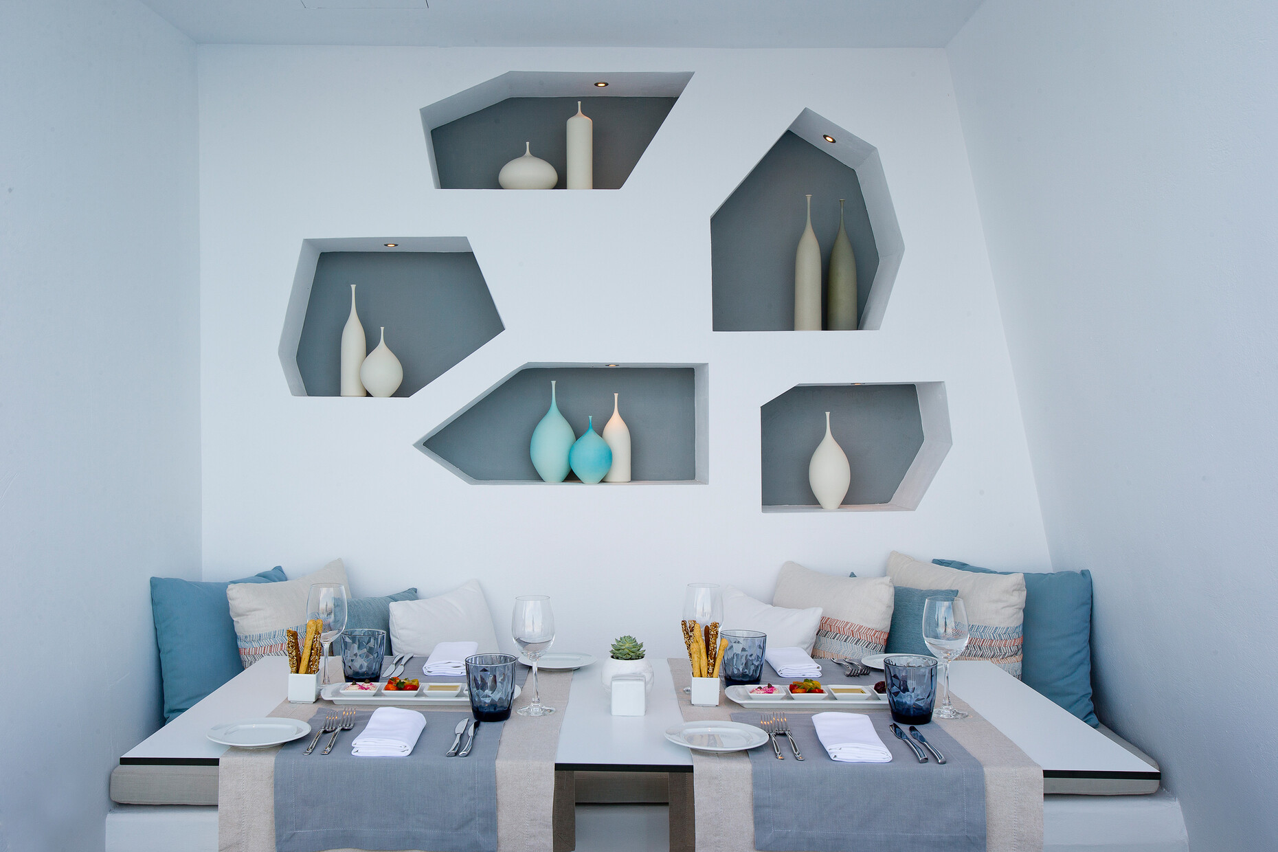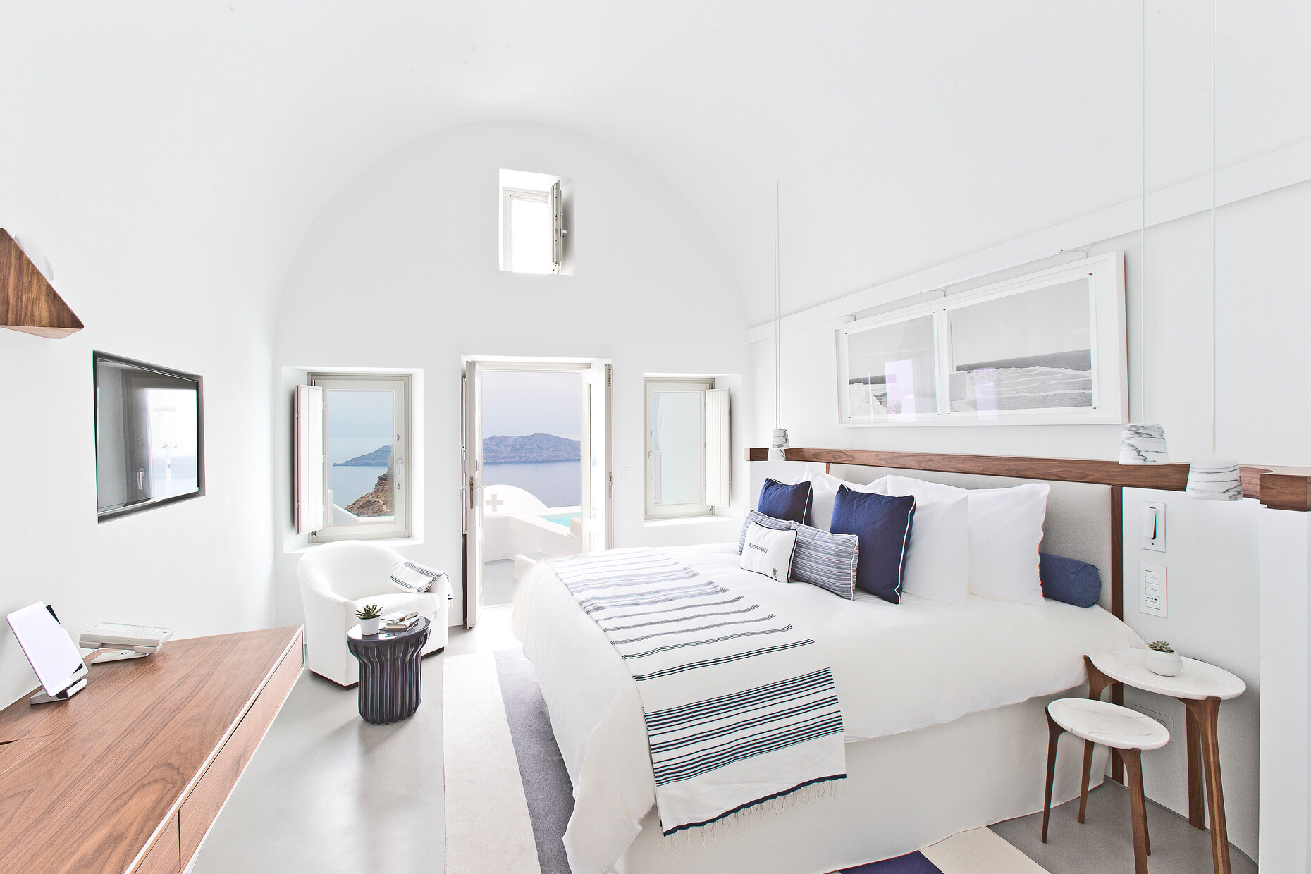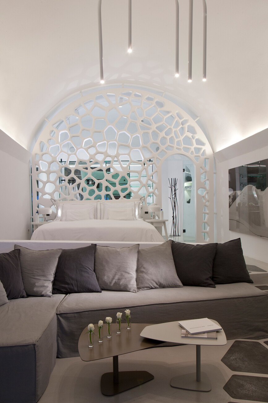Abgerundete Wände, aus denen Aussparungen und Mobiliar wie Ablagen oder Sitzgelegenheiten herausgegraben wurden, zählen zu den Charakteristika der einstigen "Wohnhöhlen" am höchsten Punkt der Insel im Dorf Imerovigli. Fifth Element Interiors London und SMK Interiors Greece haben handgefertigte Regale und Unterschränke in diese Wandnischen eingepasst. Fließende Übergänge bieten die hell gebürsteten Betonböden, die kaum sichtbar in die mit Kalk getünchten Hauswände übergehen. Dank der hellen Oberflächen, die das Sonnenlicht sanft reflektieren, ergibt sich eine einzigartige Lichtstimmung. 21 Zimmer und zahlreiche Terrassen fasst das Boutiquehotel, das erst vor zwei Jahren komplett renoviert wurde: Vom "Deluxe Room" mit eigenem Pool bis zur "Villa", einem separaten Bereich auf 400 Quadratmetern mit privatem Spa und offener Küche, bietet das Grace Hotel seinen Gästen ein Spektrum individueller Angebote zur Auswahl. Die Abkühlung an heißen Sommertagen ist indes nicht weit: Gut 22 Meter hinab in die Caldera blickt man aus dem "Infinity Pool". Bei einem kleinen Ausflug in die direkte Umgebung des Hotels kann man zudem die vulkanische Weinproduktion der Insel erkunden.