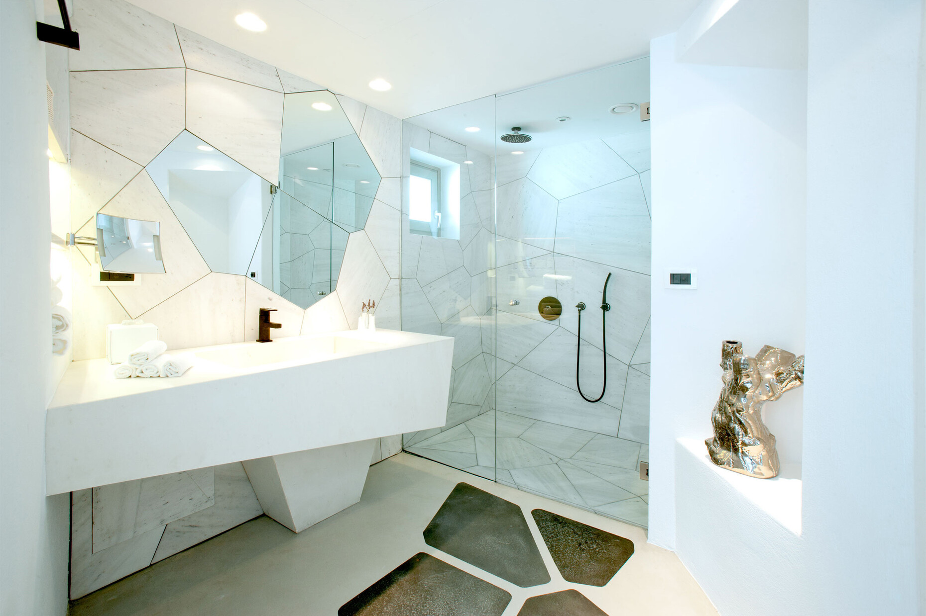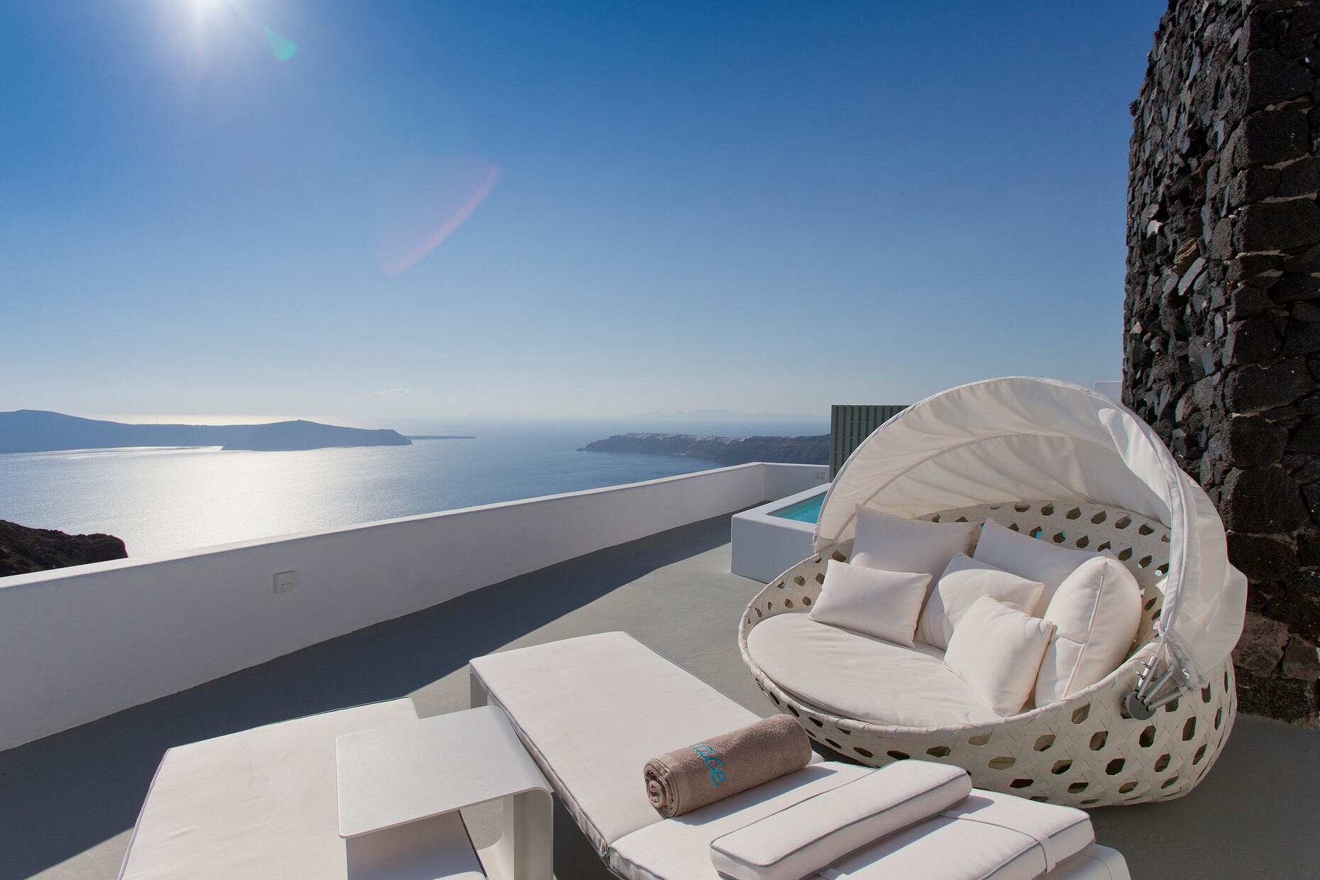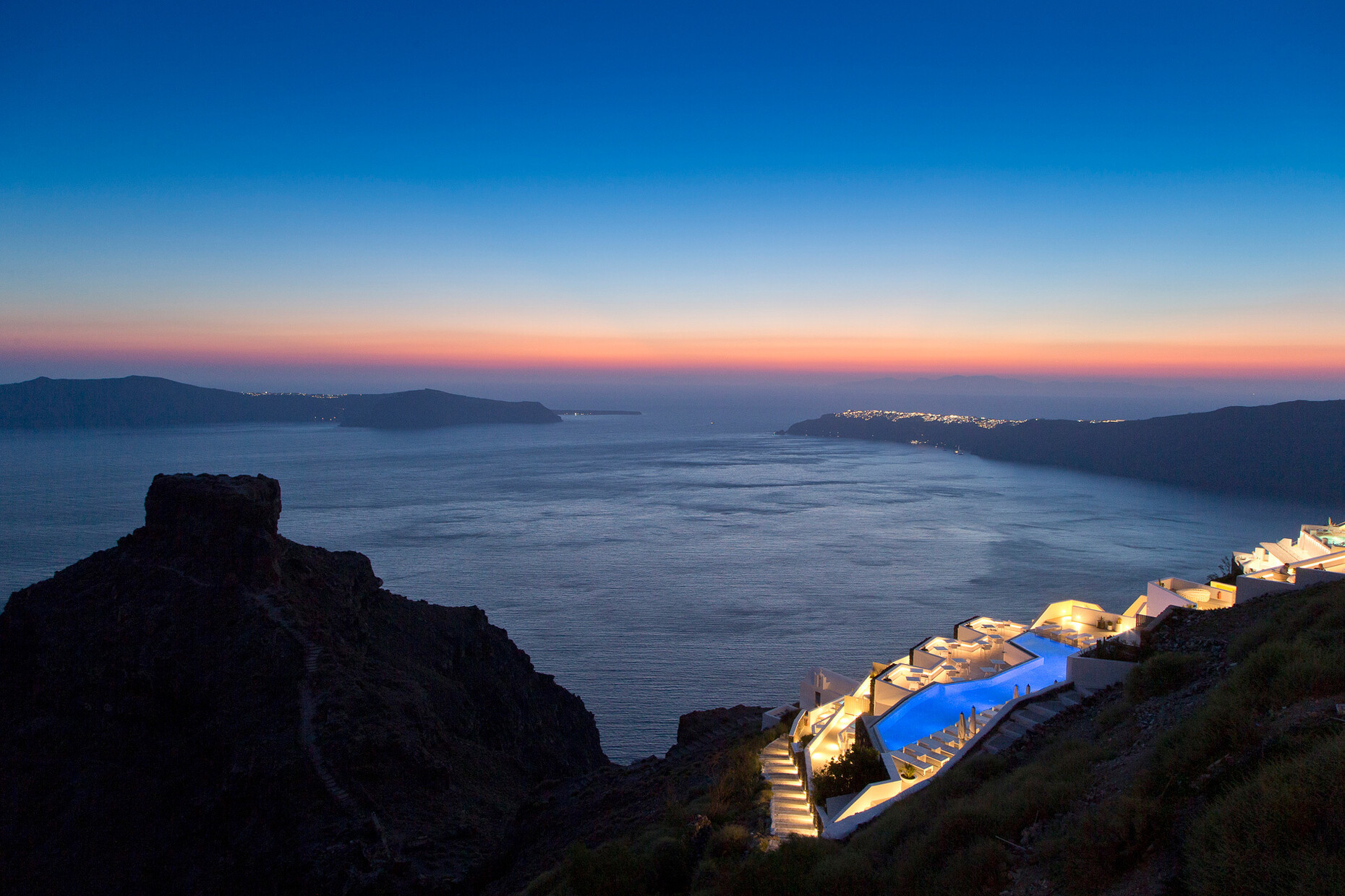 Abgerundete Wände, aus denen Aussparungen und Mobiliar wie Ablagen oder Sitzgelegenheiten herausgegraben wurden, zählen zu den Charakteristika der einstigen "Wohnhöhlen" am höchsten Punkt der Insel im Dorf Imerovigli. Fifth Element Interiors London und SMK Interiors Greece haben handgefertigte Regale und Unterschränke in diese Wandnischen eingepasst. Fließende Übergänge bieten die hell gebürsteten Betonböden, die kaum sichtbar in die mit Kalk getünchten Hauswände übergehen. Dank der hellen Oberflächen, die das Sonnenlicht sanft reflektieren, ergibt sich eine einzigartige Lichtstimmung. 21 Zimmer und zahlreiche Terrassen fasst das Boutiquehotel, das erst vor zwei Jahren komplett renoviert wurde: Vom "Deluxe Room" mit eigenem Pool bis zur "Villa", einem separaten Bereich auf 400 Quadratmetern mit privatem Spa und offener Küche, bietet das Grace Hotel seinen Gästen ein Spektrum individueller Angebote zur Auswahl. Die Abkühlung an heißen Sommertagen ist indes nicht weit: Gut 22 Meter hinab in die Caldera blickt man aus dem "Infinity Pool". Bei einem kleinen Ausflug in die direkte Umgebung des Hotels kann man zudem die vulkanische Weinproduktion der Insel erkunden.
