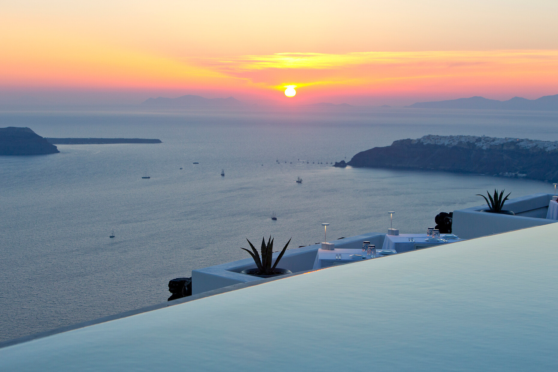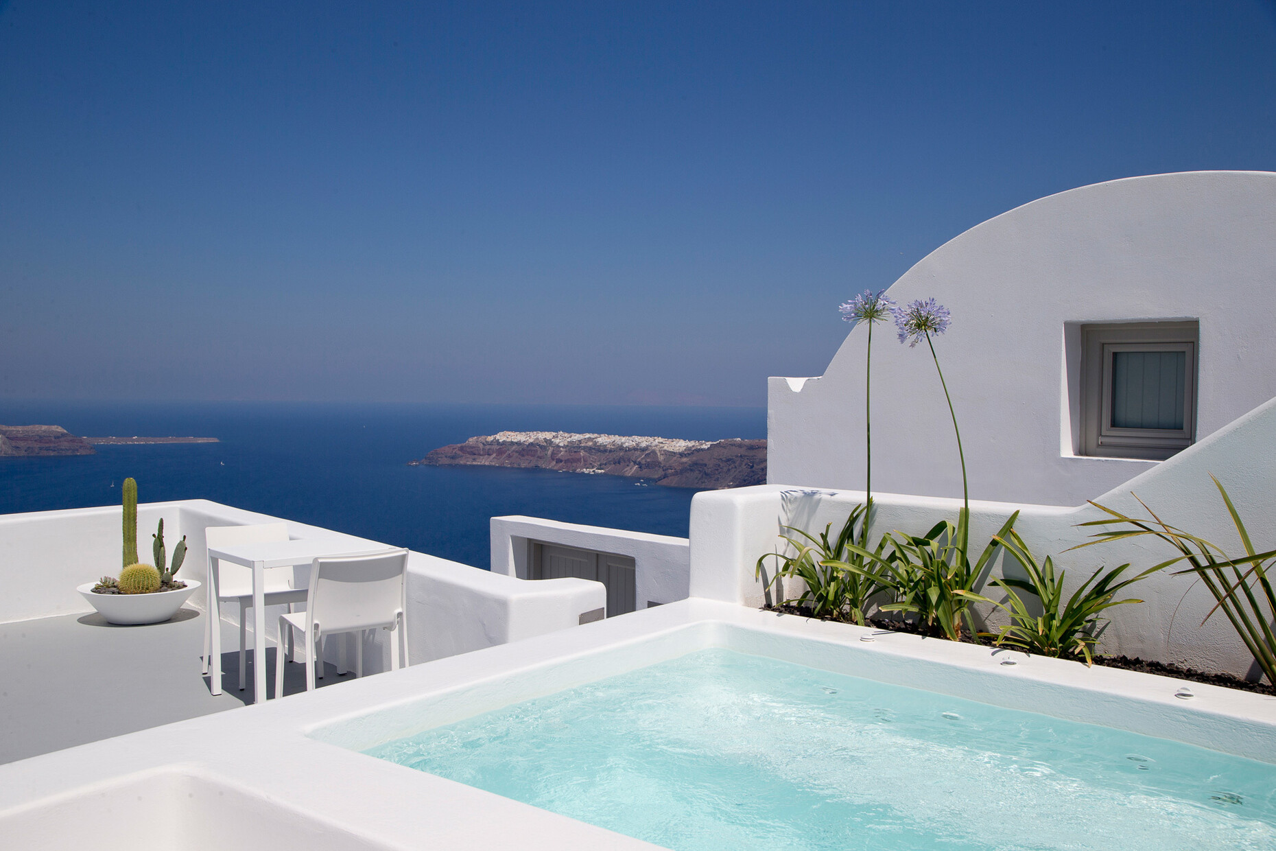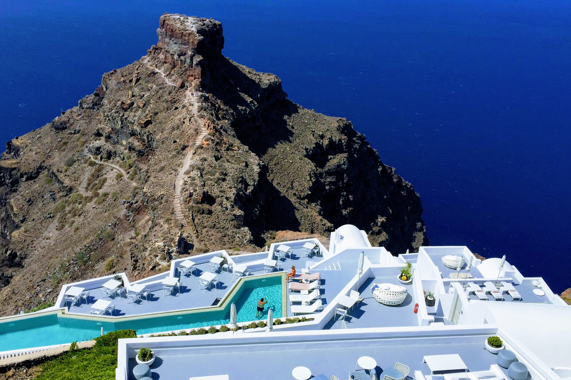 Strahlend weiß: Das ist die Farbe von Santorin. Einst entstand die Kykladeninsel im Ägäischen Meer durch einen Vulkanausbruch. Das schwarze Gestein der zerklüfteten Landschaft bildet einen reizvollen Kontrast zu den weißen Häusern, die die Hänge der Steilküste zieren. Viele bieten wunderbare Ausblicke auf das offene Meer. Eines der schönsten Panoramen haben die Gäste vom Grace Hotel im Nordwesten der Insel, abseits des Trubels. Die Architekturbüros Divercity und mplusm ließen sich von den traditionellen Bauten der Region inspirieren.