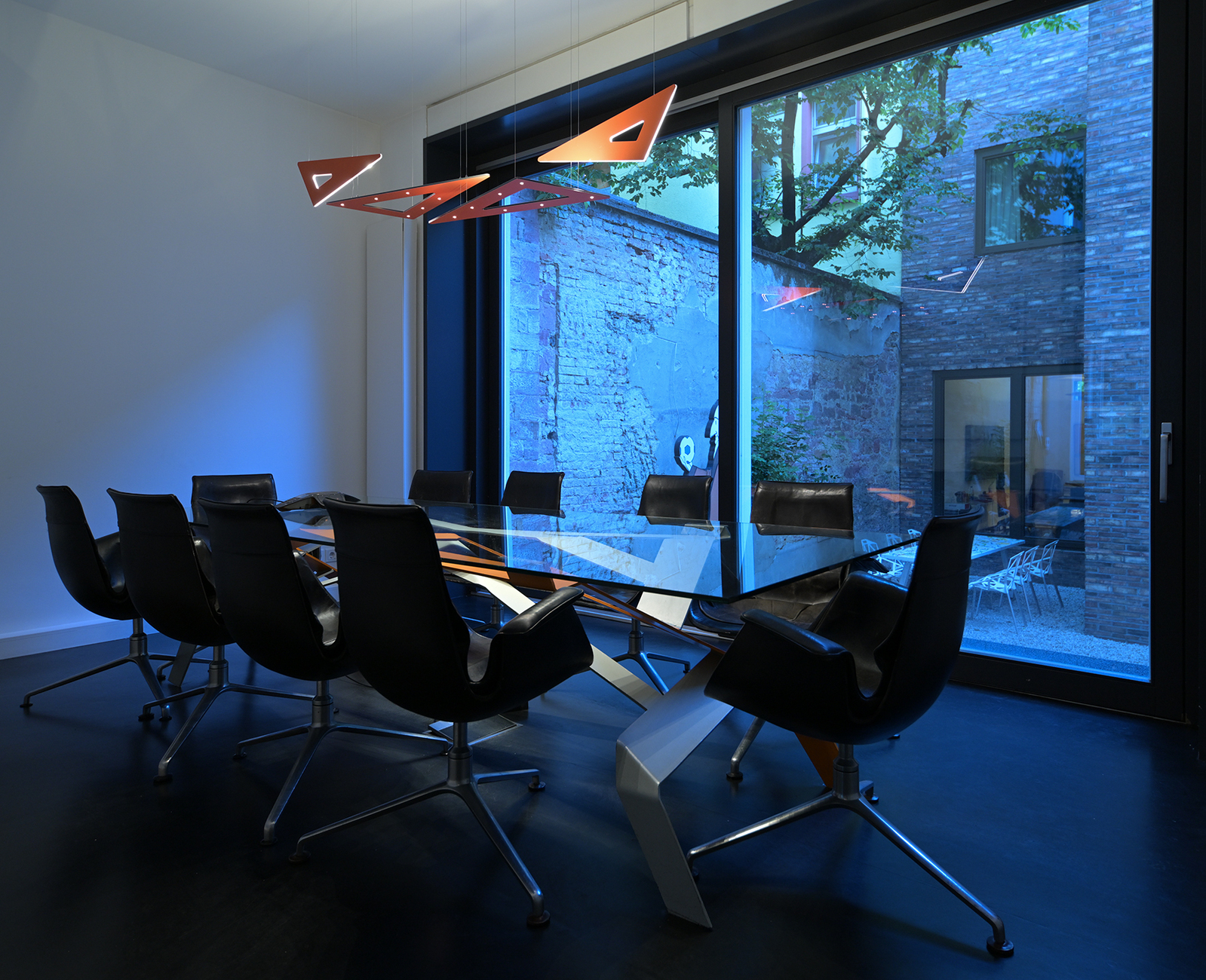 Eine passende Leuchte für die Meetingfläche bei Stylepark zu finden, war bislang ein schwieriges Unterfangen: Ein langgestreckter Raum, schmal, aber mit hohen Decken, dessen Zentrum vom "Breeding Table" aus Stahl und Glas dominiert ist: Ein Unikat mit ungewöhnlich dynamischer Form samt "gefalteten" Beinen und einer kräftigen Farbgebung in Orange wie Hellgrau, einst als Forschungsprojekt vom Büro Kram/Weishaar entwickelt. Dem internationalen Publikum wurde der Prototyp erstmals 2004 während des Events "Stylepark in Residence" in Köln präsentiert. Die Basis bildete eine von den Designern kreierte Software, die Schnittmuster mit komplexen Geometrien und unregelmäßigen Winkeln "züchtete", aus denen die Kreativen auswählen konnten. Anschließend wurden die Favoriten mittels automatisierten Laserschneid- und Biegemaschinen produziert. Unter den Bedingungen der Massenproduktion entstanden so einzigartige Designs.