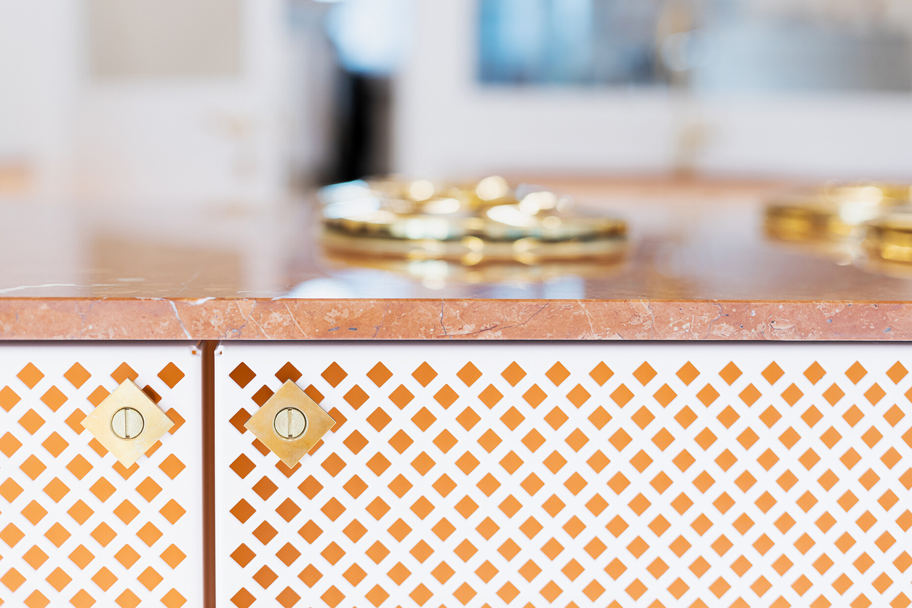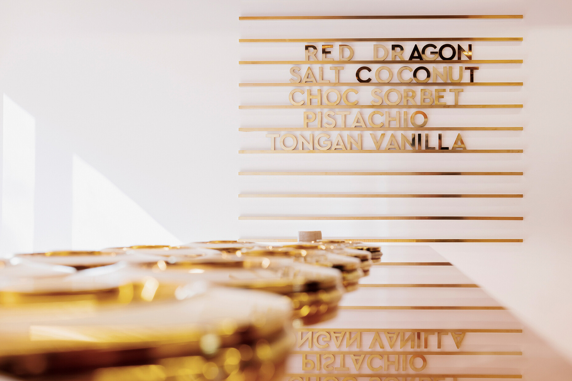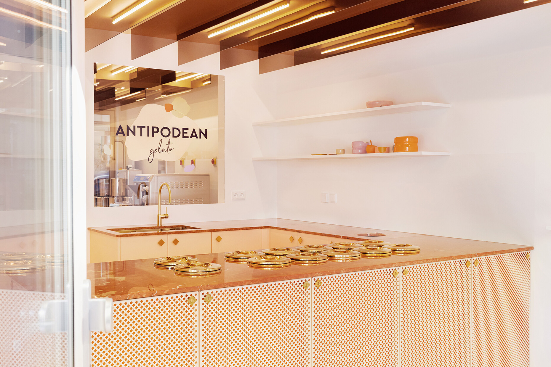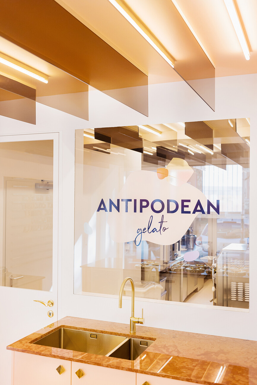 "Gelato" steht auf einem runden Schild über dem Eingang in schwarzer Schreibschrift. Mehr Hinweise, was der kleine Laden im Frankfurter Nordend zu bieten hat, gibt es auf den ersten Blick nicht. Stattdessen betritt man eine clean wirkende Fläche in Weiß und zarten Pfirsichtönen. Der Blick wird von den glänzenden Details aus Messing angezogen und wandert von der Theke mit farblich passendem Marmor und perforierten Metallplatten über die verspiegelten Deckenlamellen in die Tiefe des Raumes. Was sich unter den mysteriösen runden Deckeln verbirgt, die in die Theke eingelassen sind, ist auf der Menütafel an der Wand mit Schiebelettern vermerkt. Hausgemachtes Gelato, von "Salt Coconut" bis "Tongan Vanilla" nach Rezepten von Taila Semerano, einer italienischen Gelato-Weltmeisterin, die in Apulien eine eigene Eisdiele betreibt. Die Inspiration für das Konzept von Antipodean Gelato stammt allerdings vom anderen Ende der Welt, aus Australien. "Antipodean" steht so für einen Ort auf der gegenüberliegenden Seite der Erde. Rachel Dodoo-Mehl, die Gründerin von Antipodean Gelato, ist dort aufgewachsen, 2012 kamen sie und ihr Mann Christian Mehl nach Frankfurt. "In Australien ist die Gastronomiekultur eine andere – gutes Essen darf etwas kosten und die Details stehen mehr im Fokus", sagt er. Die Sehnsucht nach kreativen, hochwertigen Eis übersetzten sie in ihr eigenes Konzept: "Das was wir gesucht haben, gab es in Frankfurt nicht, daher haben wir uns gedacht dann machen wir es eben selbst", so Mehl.
