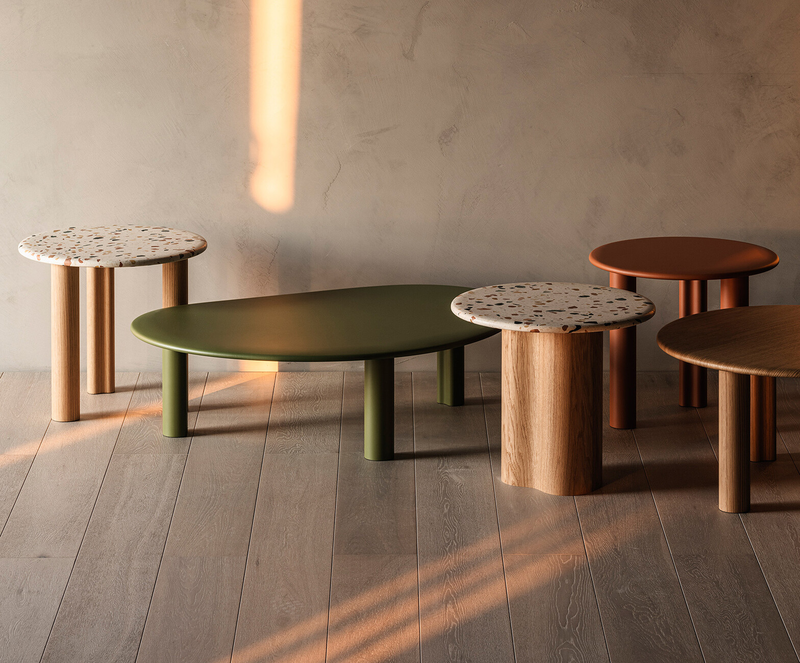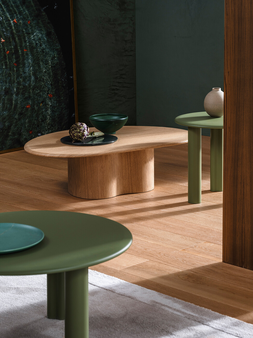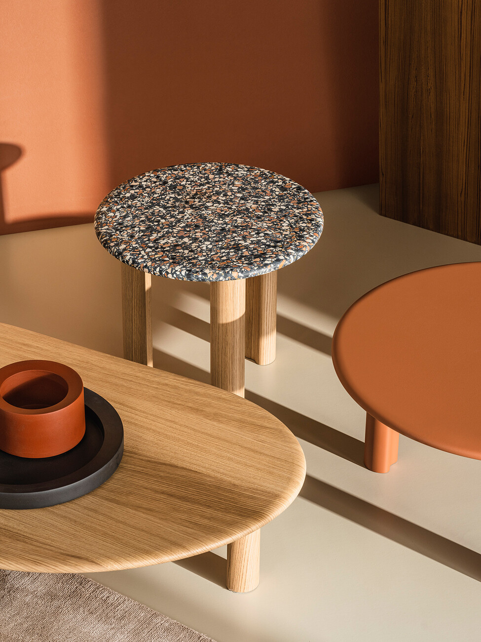 Ein System aus modularen Elementen, aus dem sich eine Vielzahl von Beistelltischen kreieren lässt: Mit "Ghia" haben Altherr Désile Park für Arper eine Kollektion entwickelt, die dem Wunsch nach individuellen Lösungen maximalen Raum gibt. Gestell und Platte sind so flexibel wählbar – vom zentralen Sockel über die Version mit drei Füßen, von der MDF-Platte in natürlicher, schwarz gebeizter oder pulverbeschichteter Eiche bis zum Terrazzo. Die Ghia-Kollektion ist FSC-zertifiziert und frei von Volatile Organic Compound Emissionen. Für die Herstellung der Terrazzoplatten werden ausschließlich natürliche Materialien wie Marmor und Portlandzement verwendet. Der gesamte Prozess erfordert keine Wärme, also keine fossilen Brennstoffe und keine synthetischen Harze. Außerdem wird für den Produktionsprozess kalk-, chlor- und reinigungsmittelfreies Regenwasser verwendet, wodurch die CO2-Emissionen reduziert werden und die Umwelt so wenig wie möglich belastet wird. Auch in der Form bietet "GHIA" eine Balance: Das Zusammenspiel aus geometrischen und organischen Elementen fungiert als Brücke zu den weiteren Loungemöbeln von Arper. Dank des großen Gestaltungsspielraums kann "GHIA" in der Ausführung für jede gewünschte Innenarchitektur angepasst werden. (am)