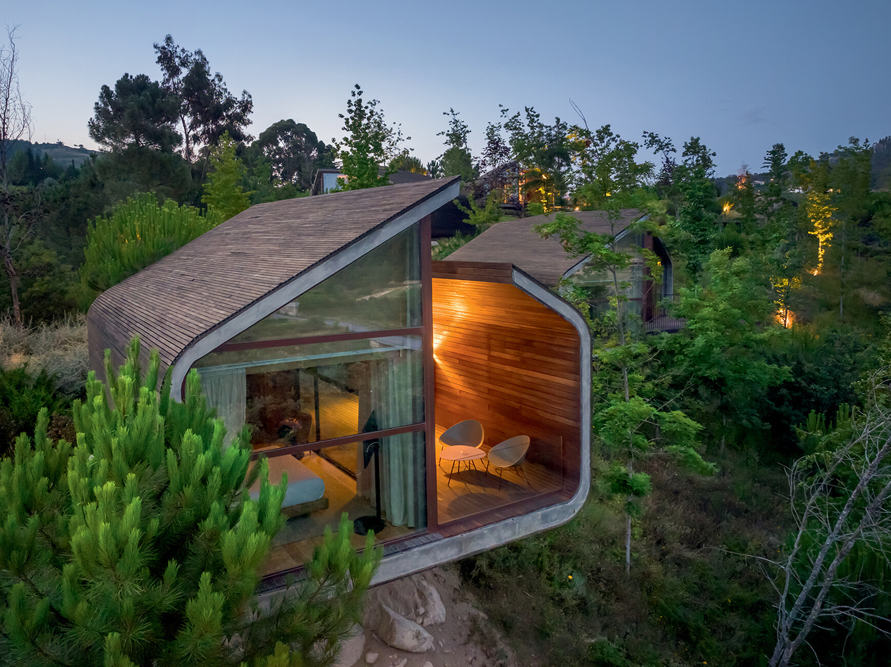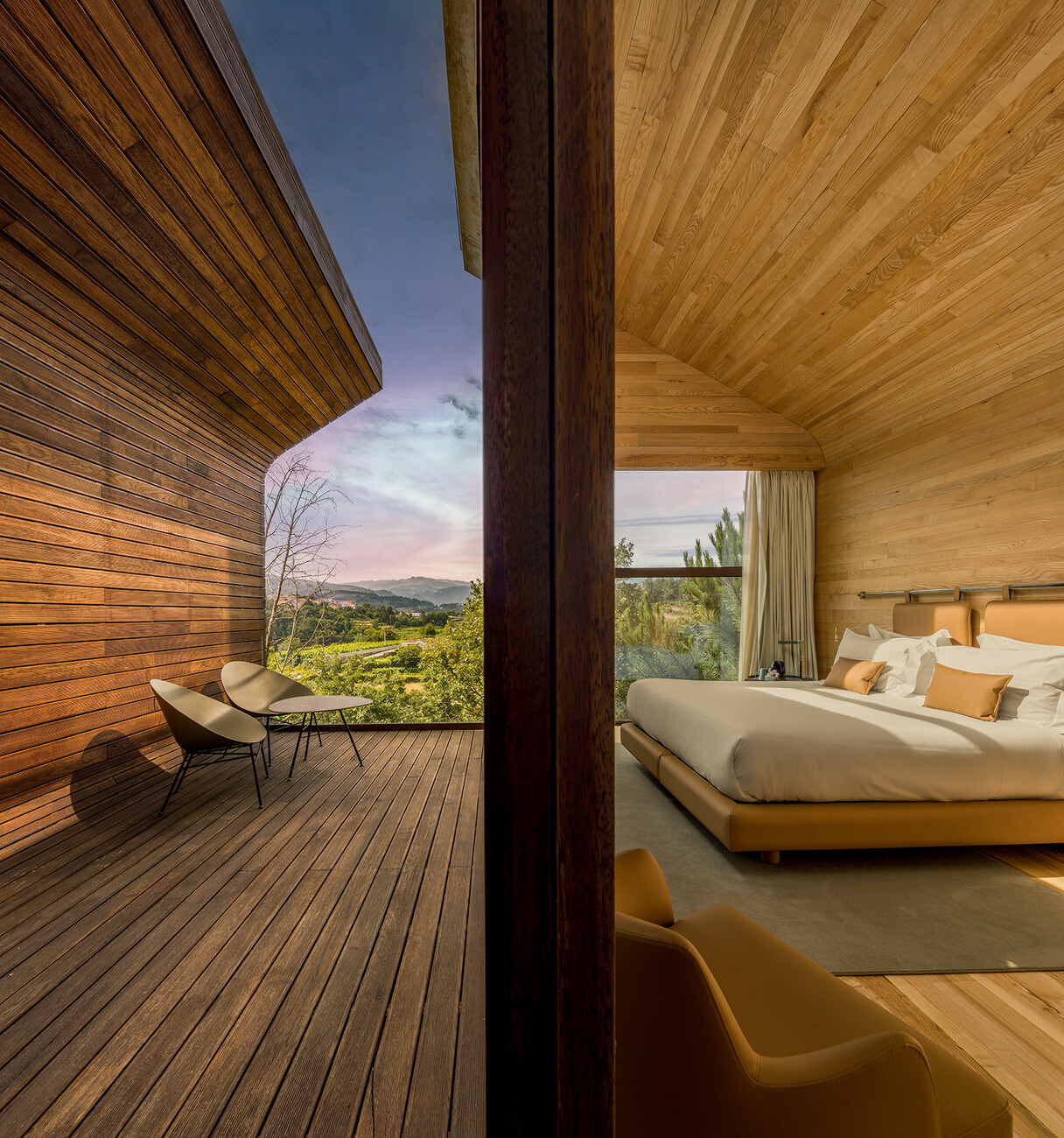 Ein vitales Beispiel für Arpers Expertise stellt das Lavandeira Douro Nature & Wellness dar. Die Lokalität und der Name verraten den Fokus des Ressorts auf Natürlichkeit, den der Möbelhersteller mit umweltfreundlichen Materialien und nachhaltigen Produktionsprozesse teilt. Durch eine offene Architektur fügt sich das Anwesen in die malerische Landschaft der portugiesischen Weinregion. Die Wände der luxuriösen, individuellen Chalets sind mit Holz ausgekleidet, ihre moderne Architektur spielt mit der prototypischen Umrisslinie eines Hauses und umfängt den Balkon. Harmonisch fügen sich Produkte von Arper mit organischen Elementen und Materialien in dieses Setting: Der "Adell" Sessel und die "Leaf" Beistelltische laden ein, auf der Terrasse, dem perfekten Ort zwischen Innen und Außen, Platz zu nehmen, und sich gänzlich dem Hier und Jetzt zu widmen.