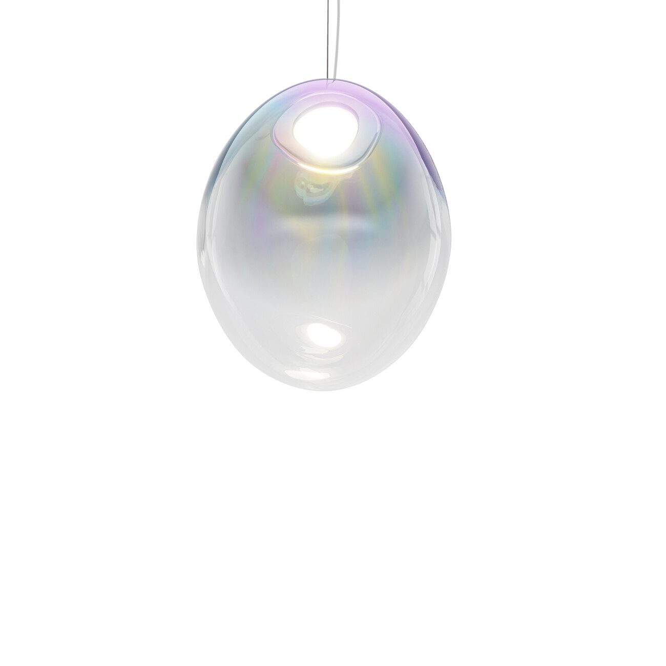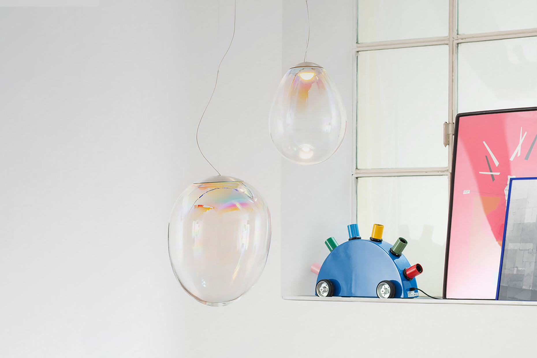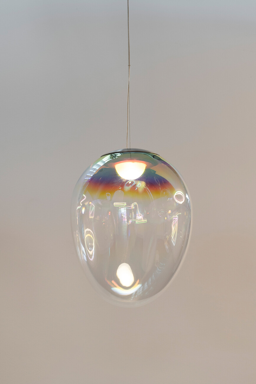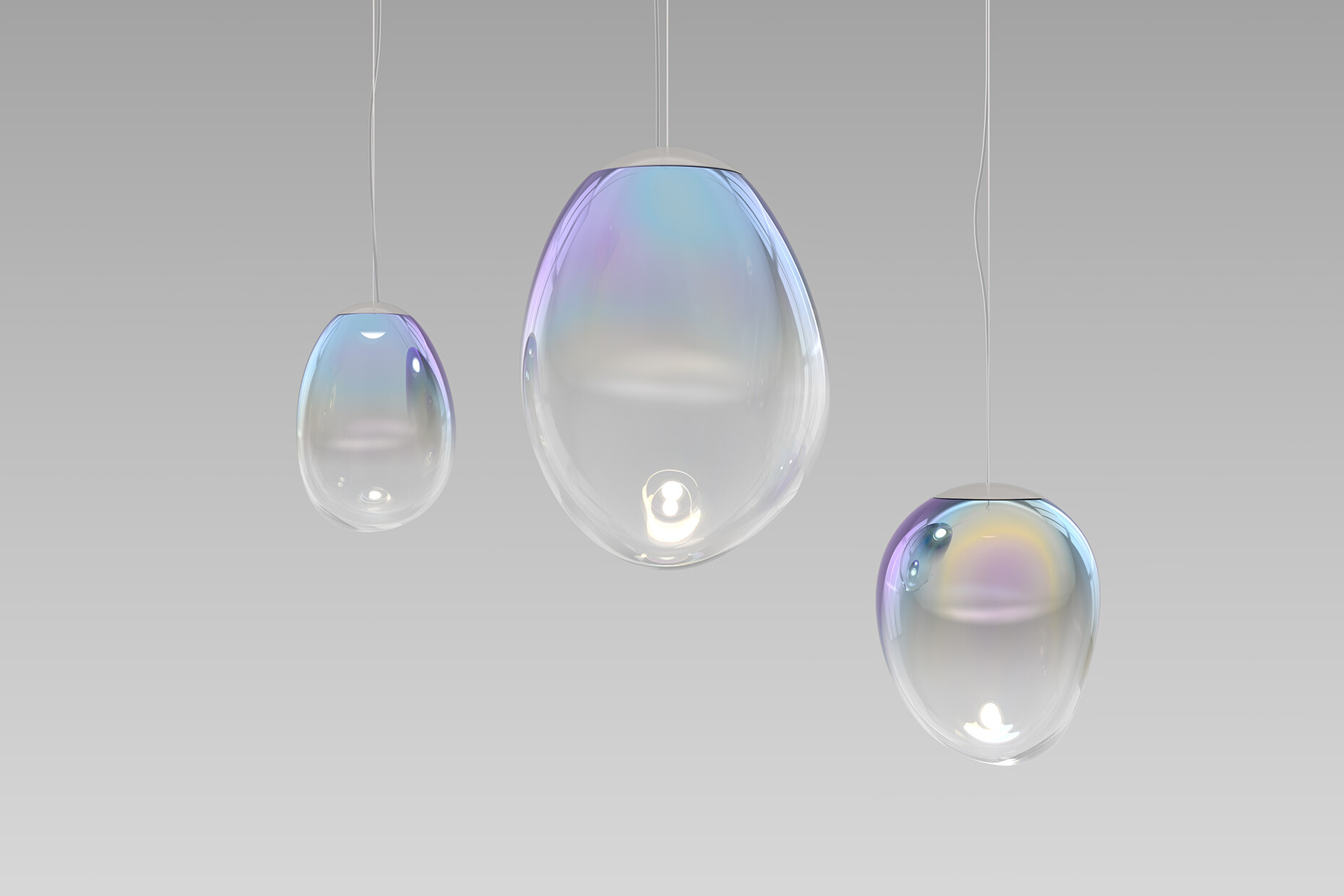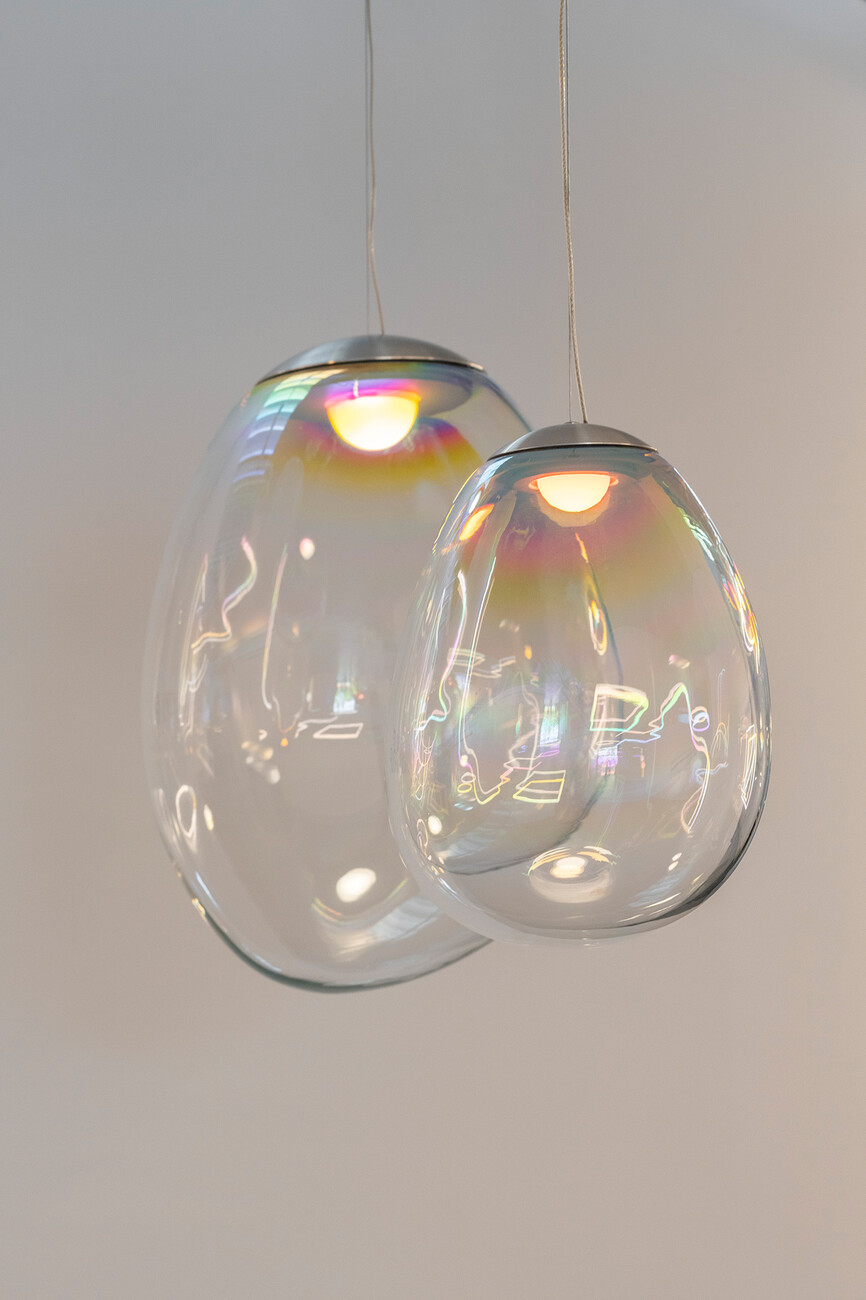 "Stellar Nebula" von Artemide, entworfen von der Bjarke Ingels Group (BIG), überzeugt durch eine Lichtwirkung, bei der ein schimmernder Sternennebel als Vorbild diente. Dabei beruht die Hängelampe auf handgefertigter Glasbläserkunst, wobei der Leuchtenkörper in eine Form geblasen und nach Vollendung nochmals im Ofen erhitzt wird, bis das Kristallglas fast wieder schmilzt. Es entsteht eine organische Form, die jedes Exemplar zu einem Unikat macht. Im Anschluss wird ein dichroitisches Metallfinish im Vakuum in einem nachhaltigen und emissionsfreien Verfahren aufgebracht, was einen weiteren Effekt zur Folge hat: So erinnert "Stellar Nebula" im eingeschalteten Zustand an eine irisierende Seifenblase, während der Leuchtenkörper im ausgeschalteten Zustand klar wie ein Regentropfen ist. Die Hängelampe ist in den Modellen "Stellar Nebula 22", "Stellar Nebula 30" und "Stellar Nebula 40" in drei unterschiedlichen Größen erhältlich und ermöglicht mit ihrer Kombination aus traditionellem Handwerk und innovativer Technik eine besondere Wahrnehmung des Lichts.