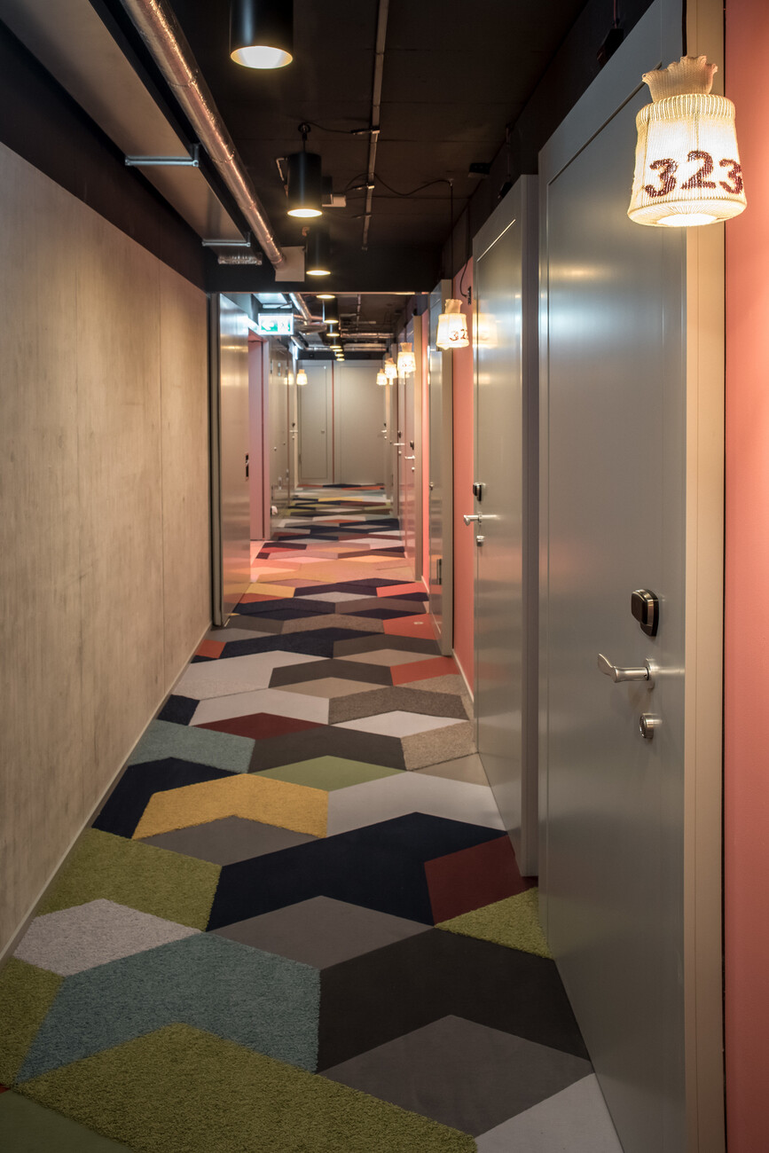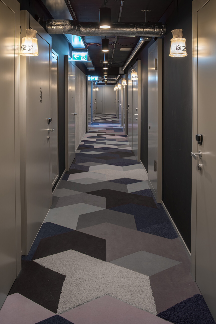 Dass sich Teppichböden auch zur hervorragend als Orientierungshilfe eignen, hat Werner Aisslinger im 25hours Hotel in der Langstraße in Zürich unter Beweis gestellt. Für die Flure der unterschiedlichen Stockwerke entwarf er drei verschiedene Muster in drei verschiedenen Farbgebungen: In den Etagen Eins, Zwei und Drei fügen sich Teppichfliesen in Rhomben- und Pfeilform aneinander, die Nuancen reichen von Schwarz über Gelb, Grün, Blau und Rot bis zu Naturweiß. In den Etagen Vier und Fünf wirken sechseckige Teppichfliesen fast wie ein Fliesenboden. Die obersten beiden Flure kommen grafisch-schlicht in Blau, Grau, Beige und Schwarz daher. Die zurückgenommenen Farben wirken ruhiger, edler und kreieren optische Tiefe. Teppichfliesen, bislang eher in Hotels und Büros zu Hause, eignen sich so verlegt auch für die heimischen vier Wände: Wenn im Wohnzimmer ein Rotweinglas vom Couchtisch fällt oder im Kinderzimmer ein Malheur passiert, muss nicht der ganze Teppich dran glauben, sondern einzelne Teile können problemlos ausgetauscht werden.