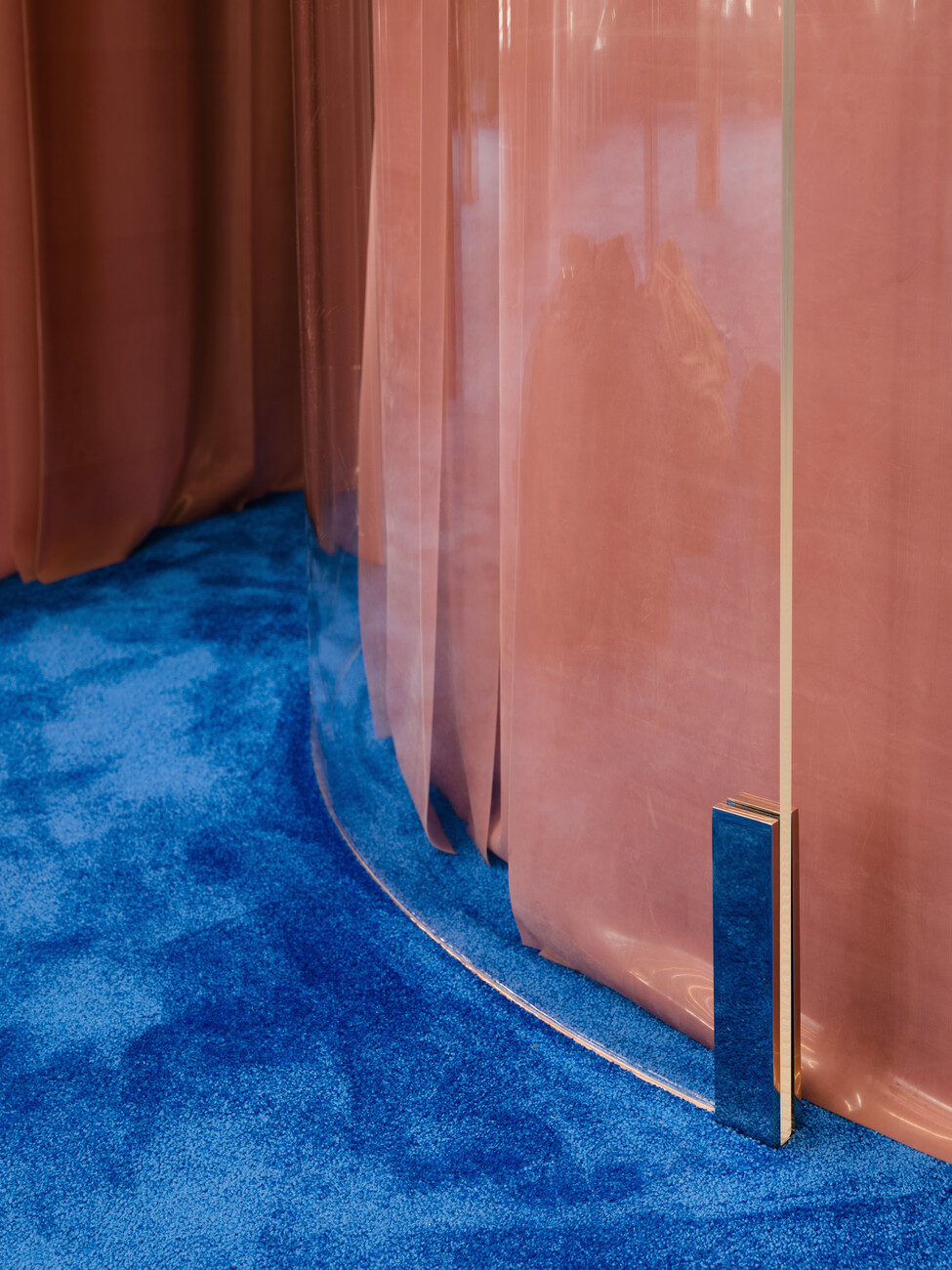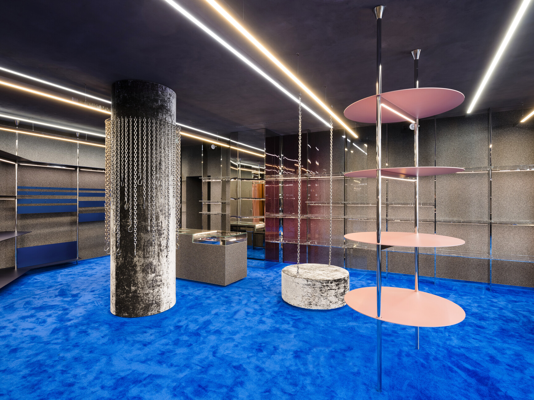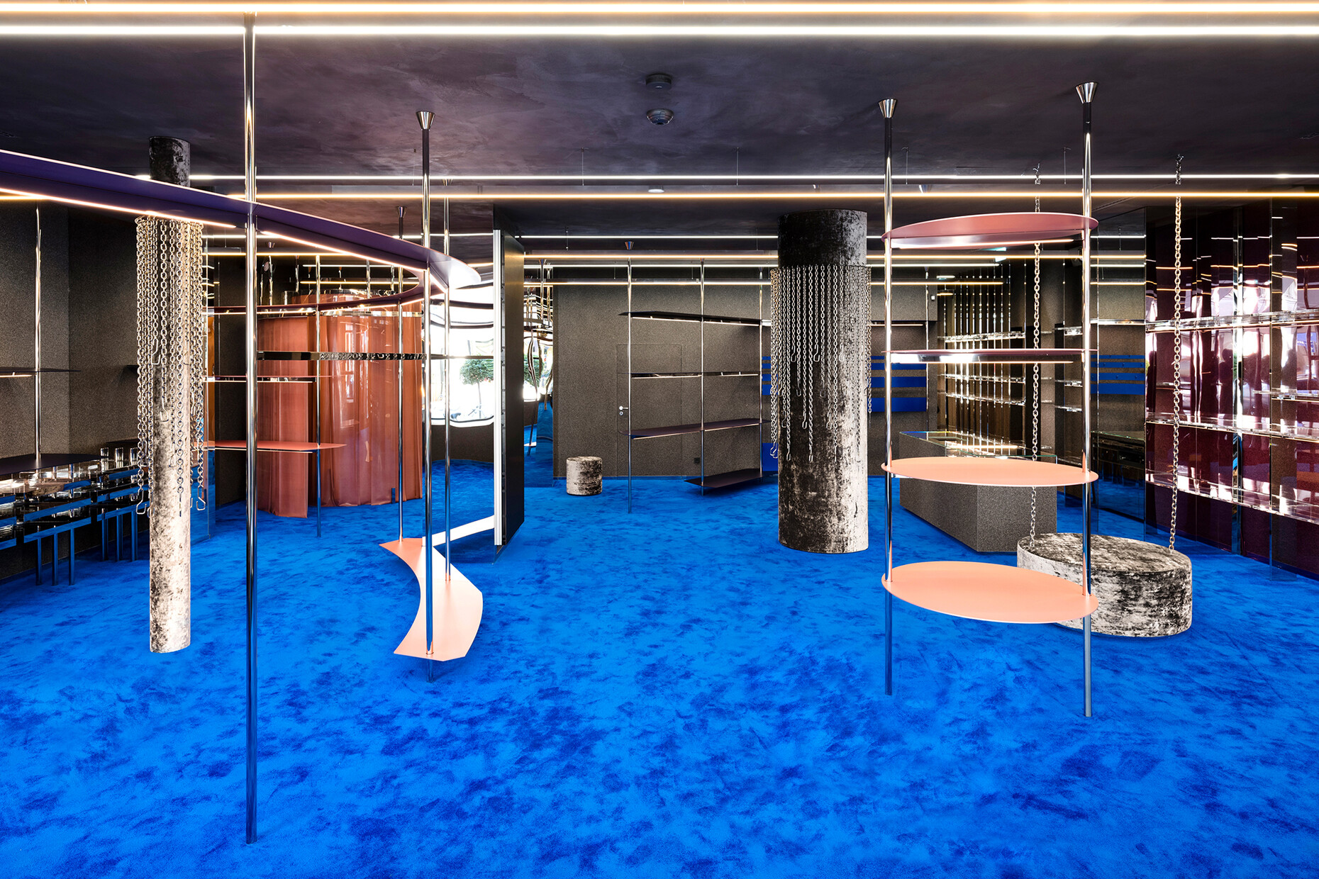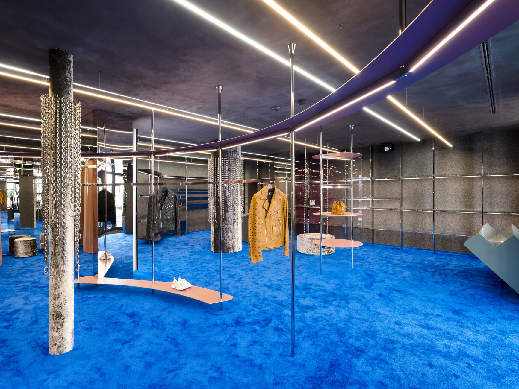 Ein aktuelles Beispiel dafür ist der neue Showroom des Taschenlabels MCM in München, dessen Look die Berliner Avantgarde-Interiordesigner von Gonzalez Haase AAS gestaltet haben. Der royalblaue Teppich leuchtet so intensiv – er überstrahlt fast den Rest der Einrichtung. Gewählt haben die Architekten einen dicht strukturierten und elegant glänzenden Objektvelours. Sie kombinieren den weichen Teppich mit einem dunklen Buntsteinputz – einer rauhen Oberfläche, wie sie früher gern für Treppenhauswände verwendet wurde. Durch die Kombination von diesen ganz unterschiedlichen Texturen und Farben entsteht so ein ganz neuer Raumeindruck, der den Bodenbelag Teppich aufregend anders interpretiert.
