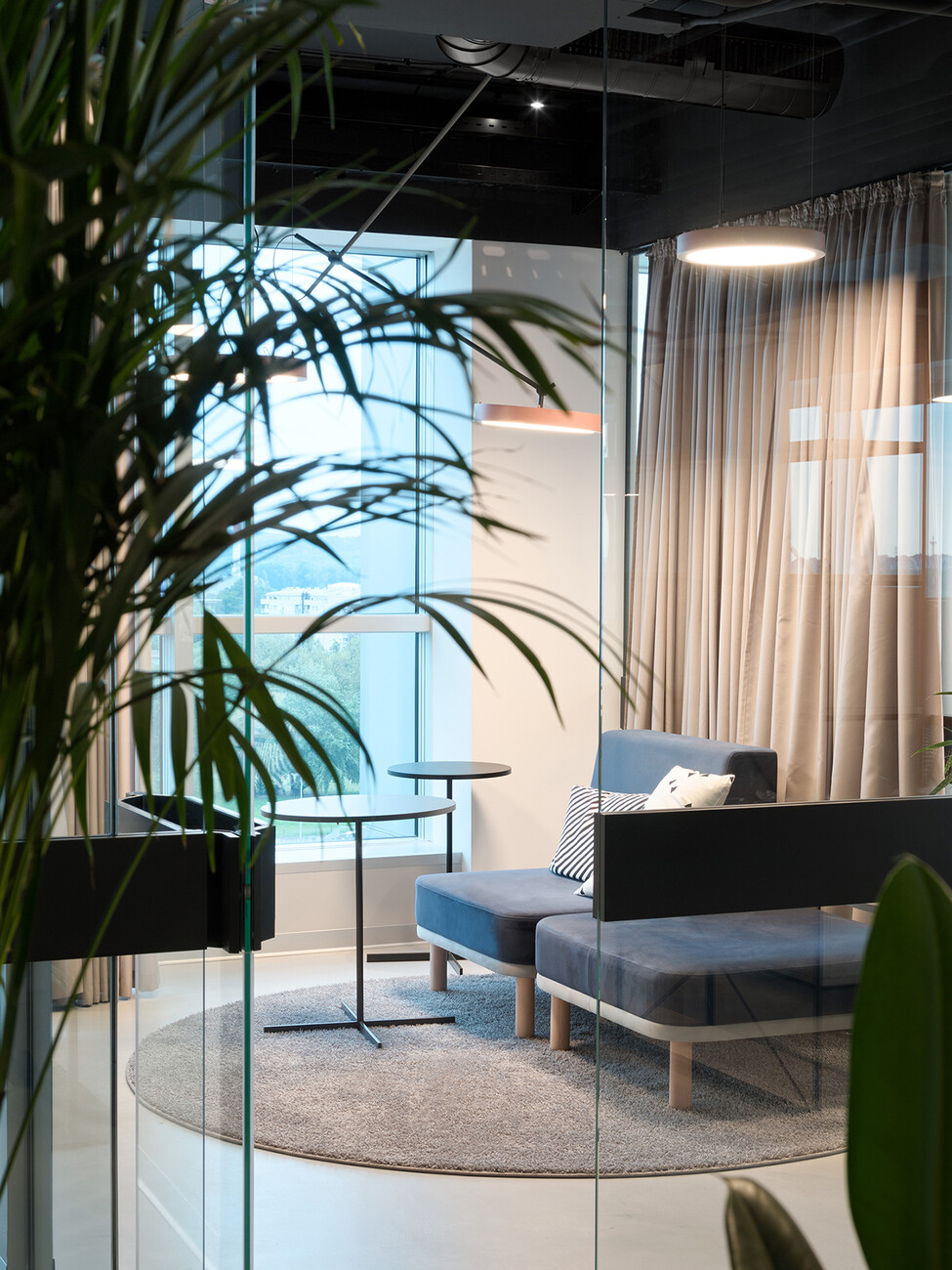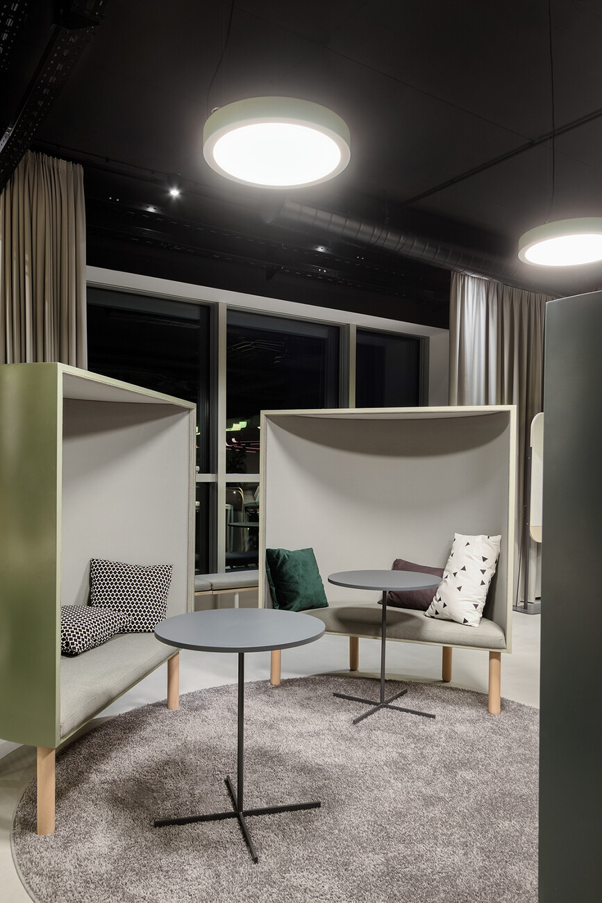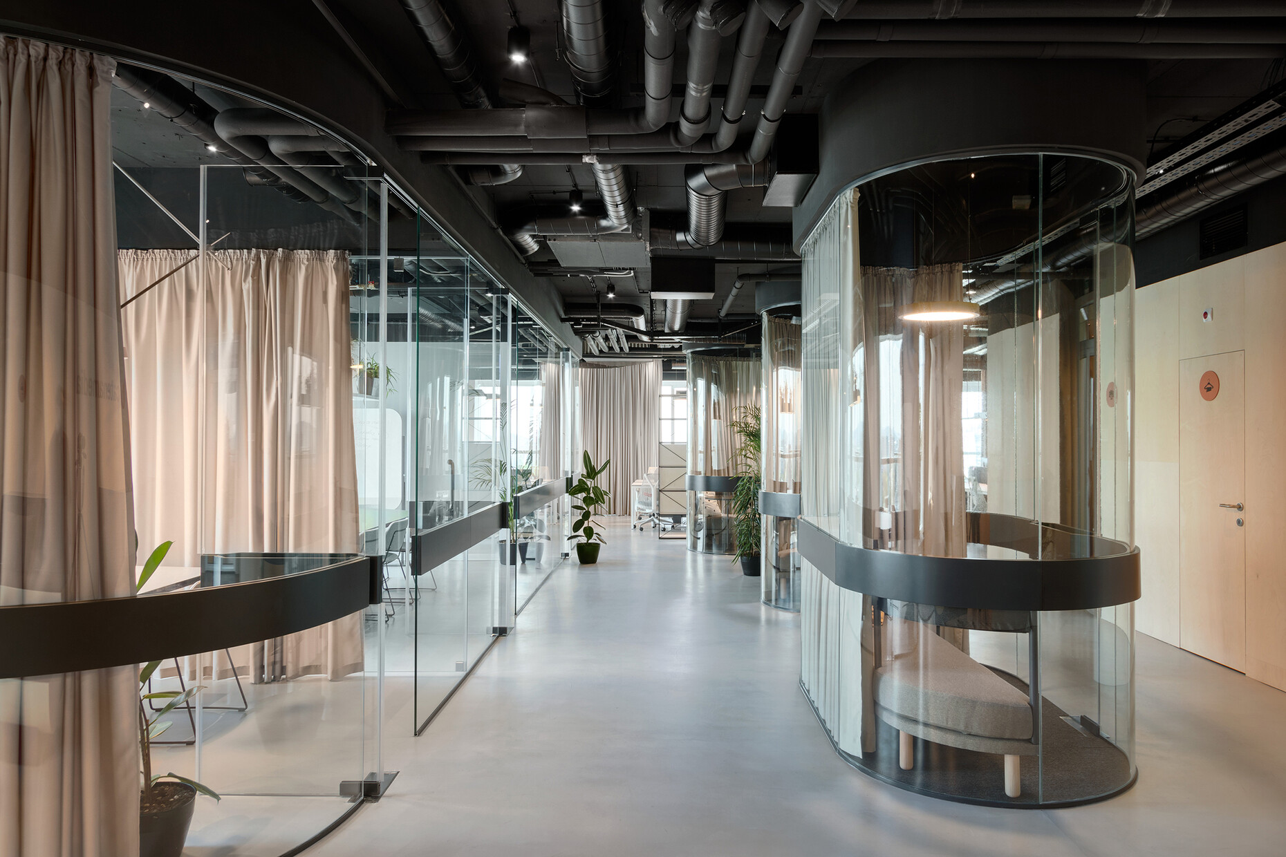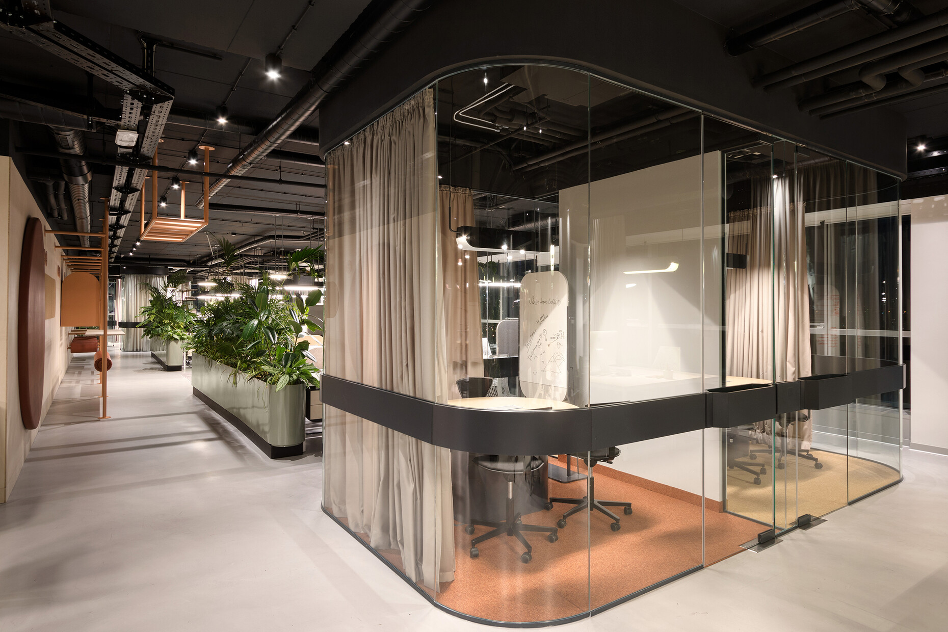 Das Großraumbüro weist verschiedene, ineinander übergehende Zonen auf. Scharfe Kanten sucht man vergebens: Geschlossene Räume aus abgerundeten Glaswänden dienen als Konferenzräume, Besprechungs- und Rückzugsbereiche zum konzentrierten Arbeiten und Telefonieren. Wie es der aktuelle Zeitgeist will, gibt es keine festen Arbeitsplätze für die Mitarbeiter. Diese können nach Bedarf entscheiden, wo und wie sie arbeiten wollen. Intimere Zonen wechseln dabei mit offenen, einem Wohnzimmer ähnlichen Steharbeitsplätzen und "normalen" Arbeitsplätzen an größeren Tischen ab.