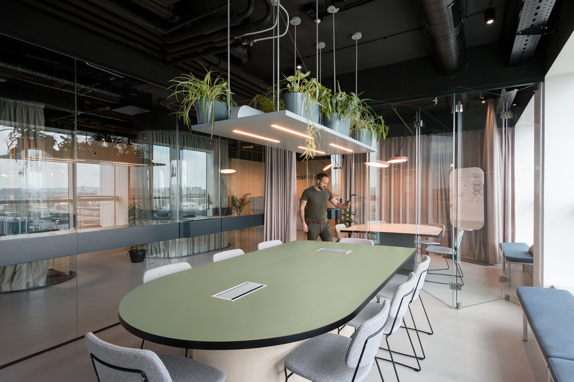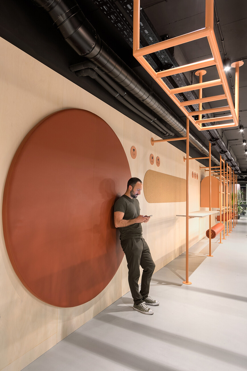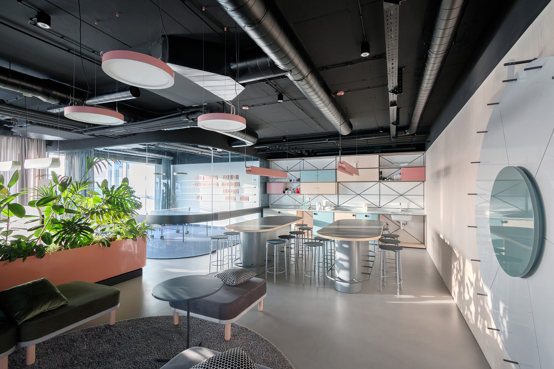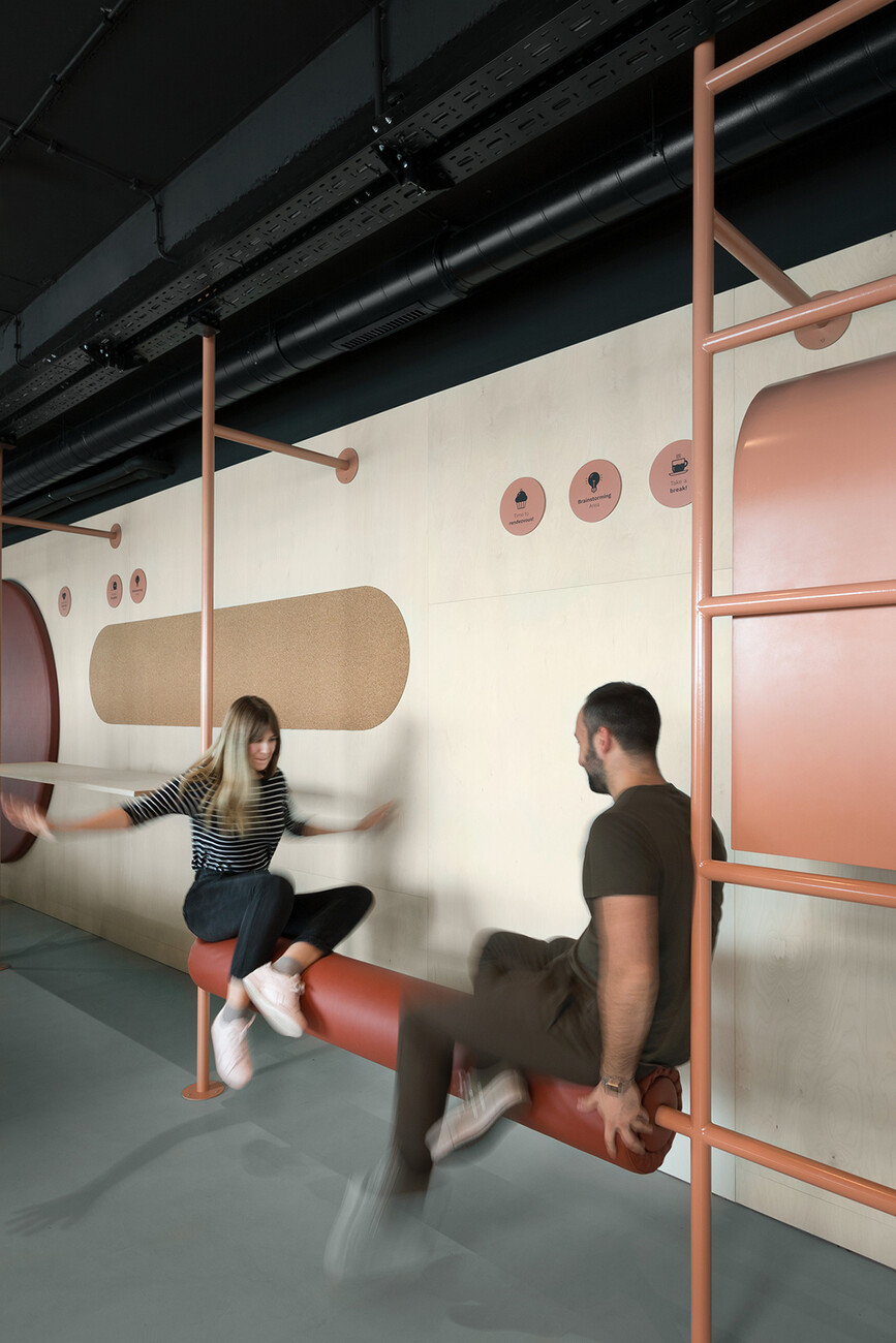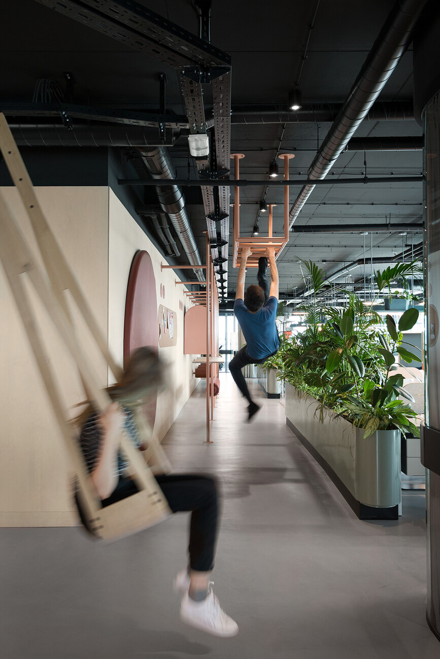 Eine zentrale, mit Holz verkleidete Wand bietet nicht nur Steharbeitsplätze, sondern zudem jede Menge Möglichkeiten zur körperlichen Ertüchtigung – für den kleinen Klimmzug zwischendurch oder um die Wirbelsäule einfach mal ordentlich in die Länge zu ziehen. Und in der offenen Küche laden zwei große Tische, Schaukeln, eine Tischtennisplatte und ein Glücksrad, das zugleich als Whiteboard dient, zur unterhaltsam-aktiven Pause ein.
