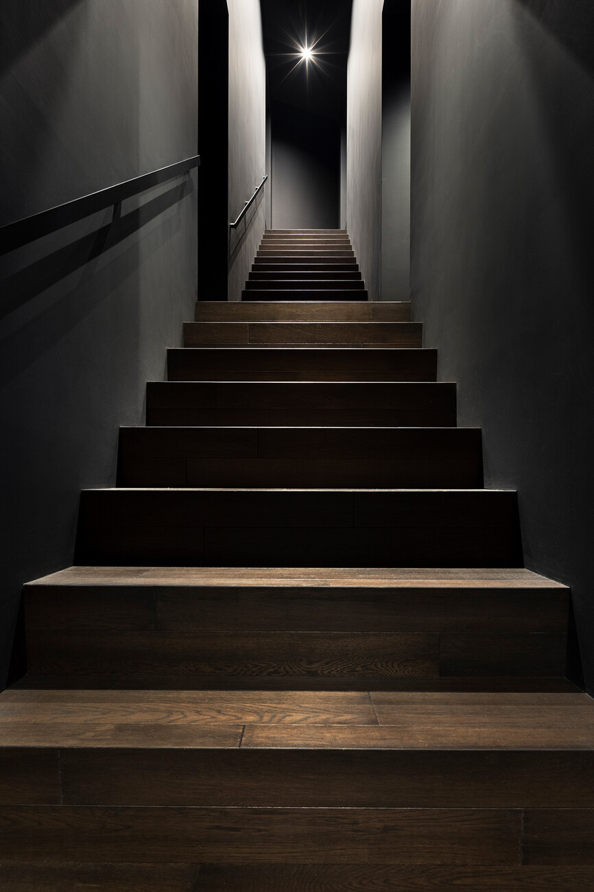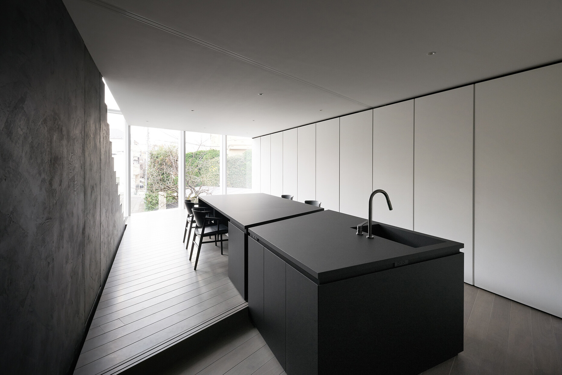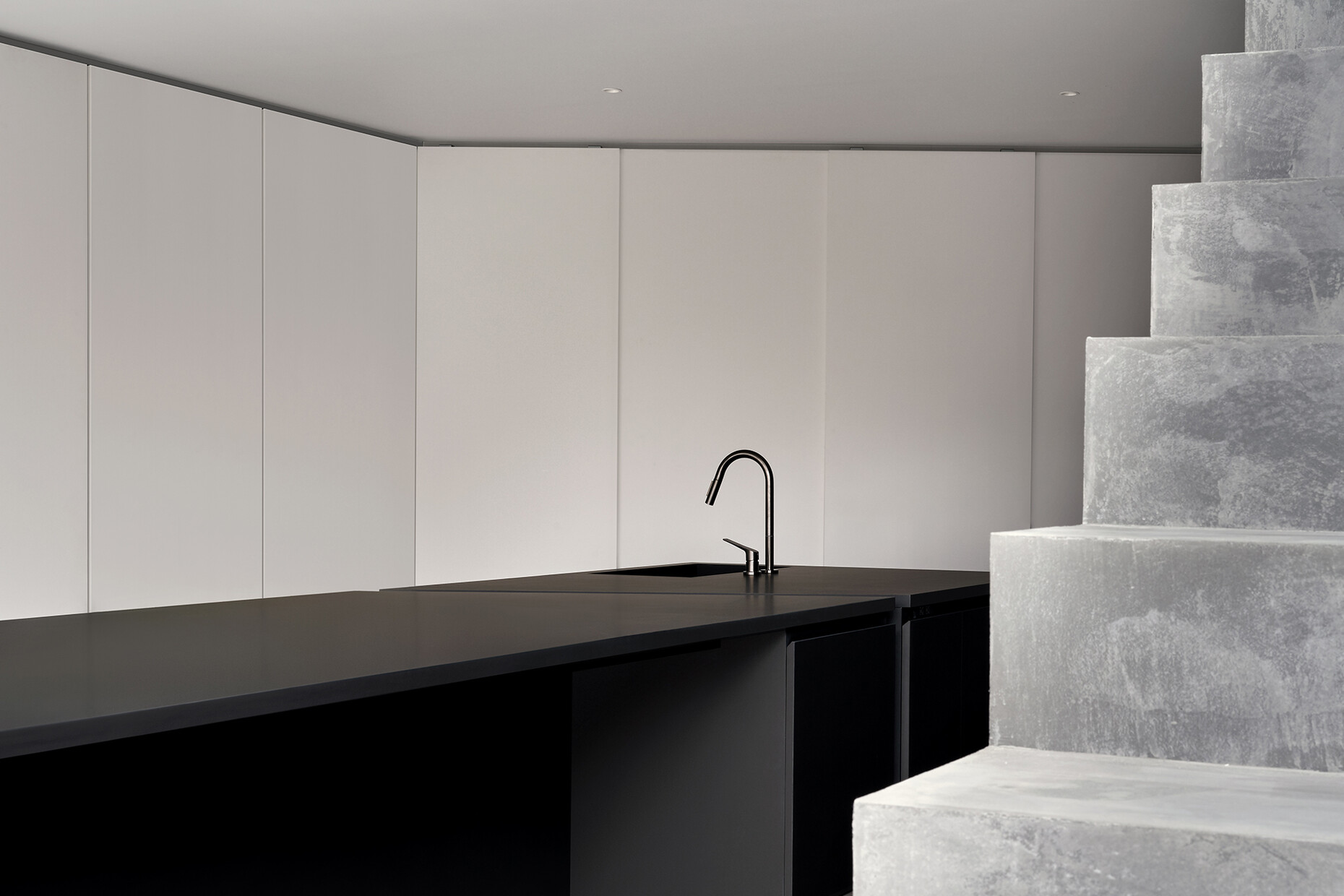 Nach oben hin ändert sich dann das Steigungsverhältnis der Stufen und die Treppe wird zu einer Art Himmelsleiter, die einem Oberlicht entgegenstrebt. Sie ist aber nicht nur ein architektonischer Hingucker, sondern beherbergt auch funktionale Bereiche wie Badezimmer und Stauräume. "Ich wollte die Treppe so gestalten, dass sie nicht nur ein Objekt ist, sondern Funktionen erfüllt", erklärt Sato. Bei den Badezimmern entschied er sich für AXOR-Produkte in der "AXOR FinishPlus"-Oberfläche "Brushed Black Chrome", die den Kontrast zwischen der erdverbundenen Treppe und den luftigen Wohnräumen zusätzlich betonen. Für die Waschtische kamen die "AXOR Uno"-Armaturen zum Einsatz, deren minimalistisches Erscheinungsbild perfekt zum Rest des Hauses passt. Bei Bad und Dusche wählte der Architekt dann die Kollektionen "AXOR Citterio E" und "AXOR Citterio M", wobei letztere auch in den beiden Küchen Verwendung fand.