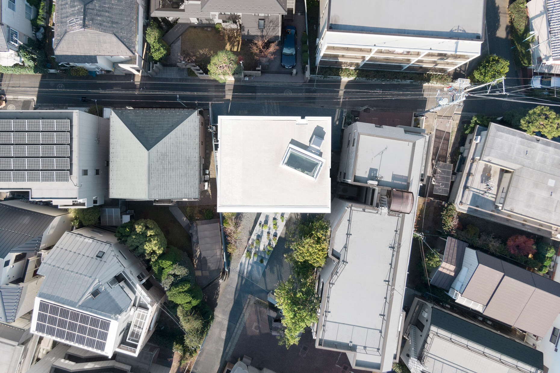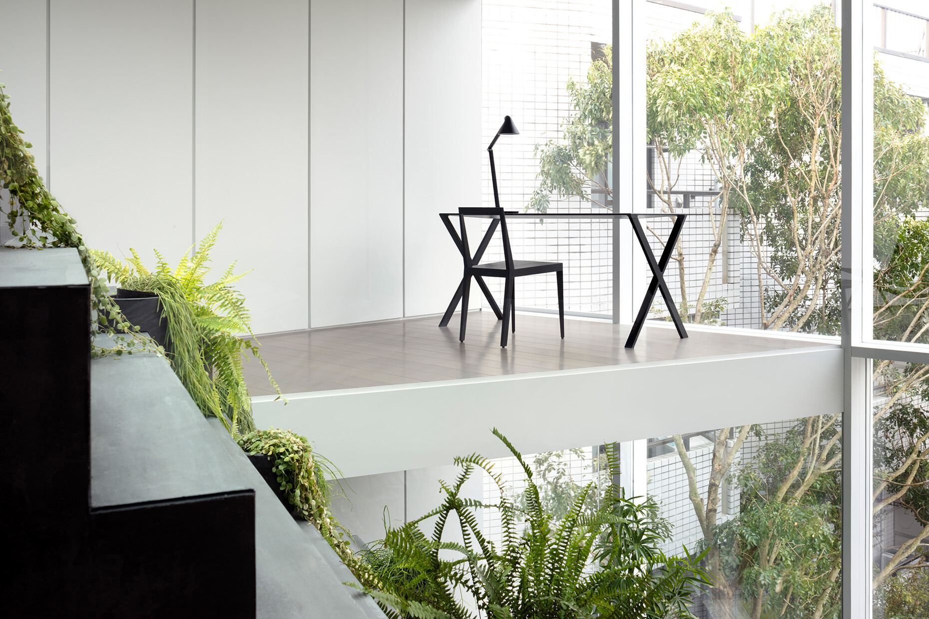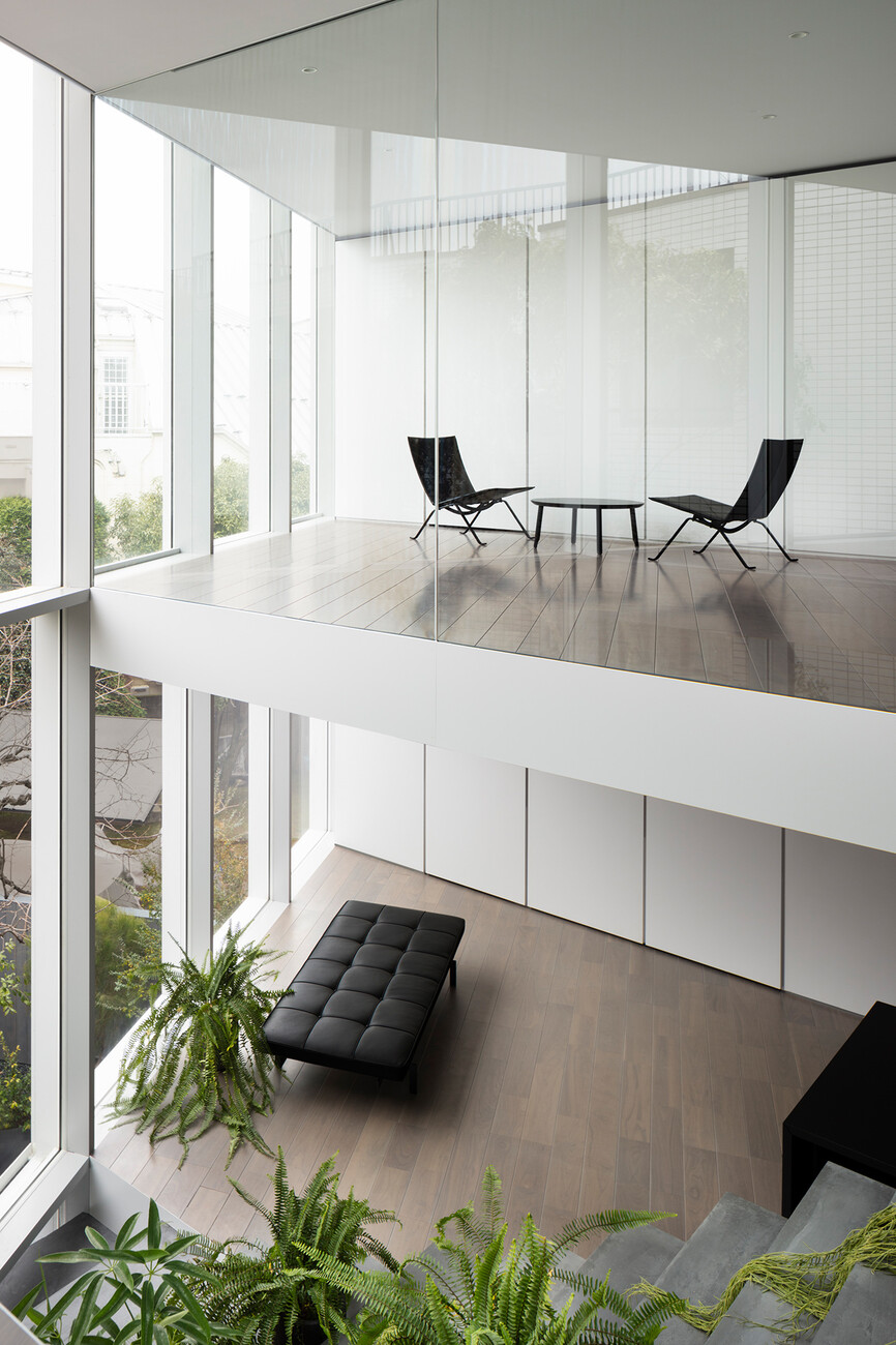Dafür rückte der Architekt das Gebäude an die Nordseite des Grundstücks und öffnete den Garten nach Süden, um so viel Licht, Luft und Aussicht wie möglich zu garantieren. Die große Treppe ist zunächst Teil des Gartens, mit einem seitlichen Eingang für die dreiköpfige Familie im ersten Geschoss und deren Großeltern im Erdgeschoss. Im Innern wird sie dann zu einem verbindenden Element, um das sich mehrere lichtdurchflutete Galerien gruppieren. Dabei ist die Treppe nicht nur ein Treffpunkt für die Familie, sondern auch ein Bindeglied zwischen Garten und Wohnraum. Dem dienen auch die 100 Blumentöpfe, die auf den Stufen positioniert sind. "Es ist, als ob ein Garten von außen in das Haus kommt“, sagt Sato.