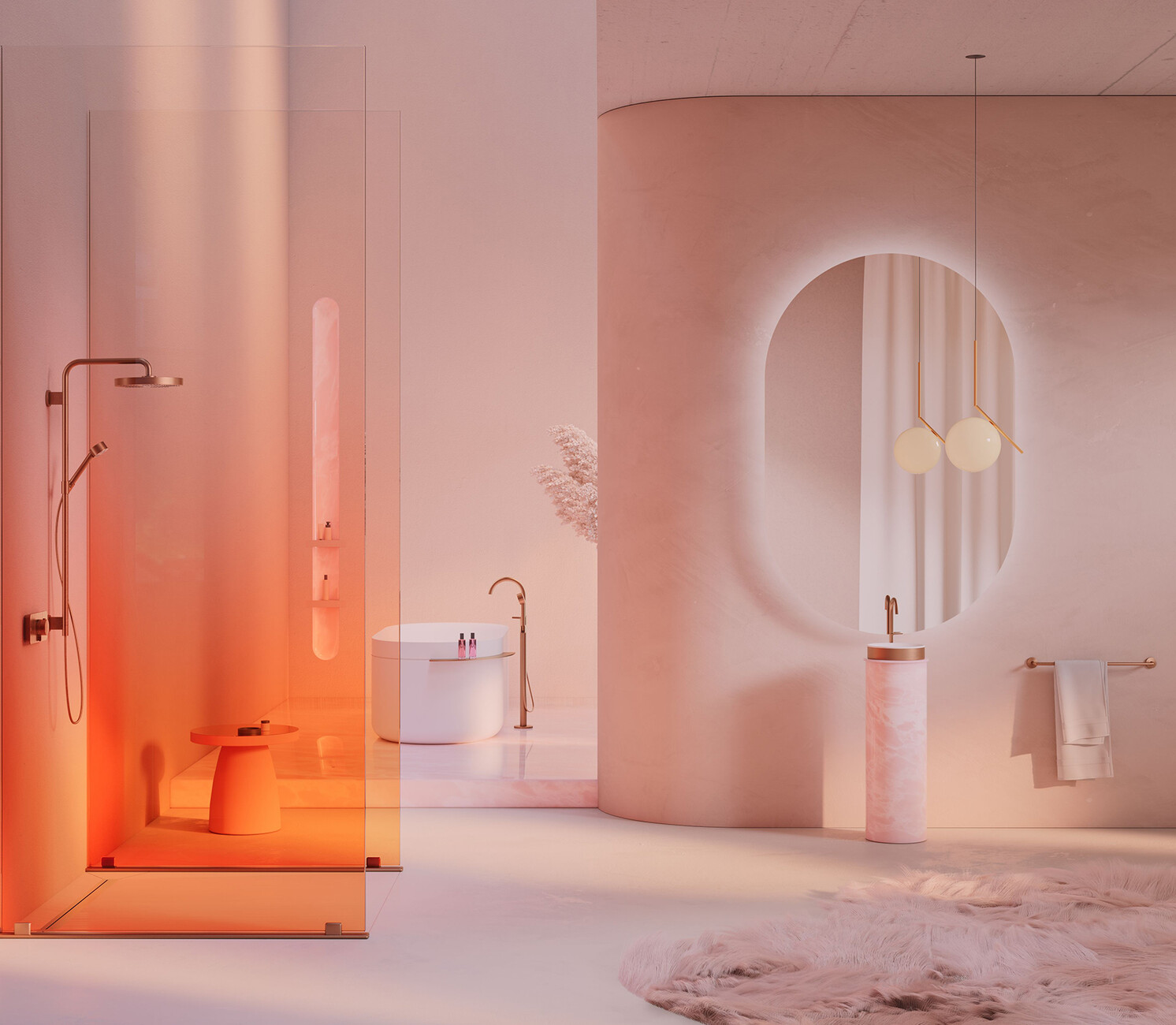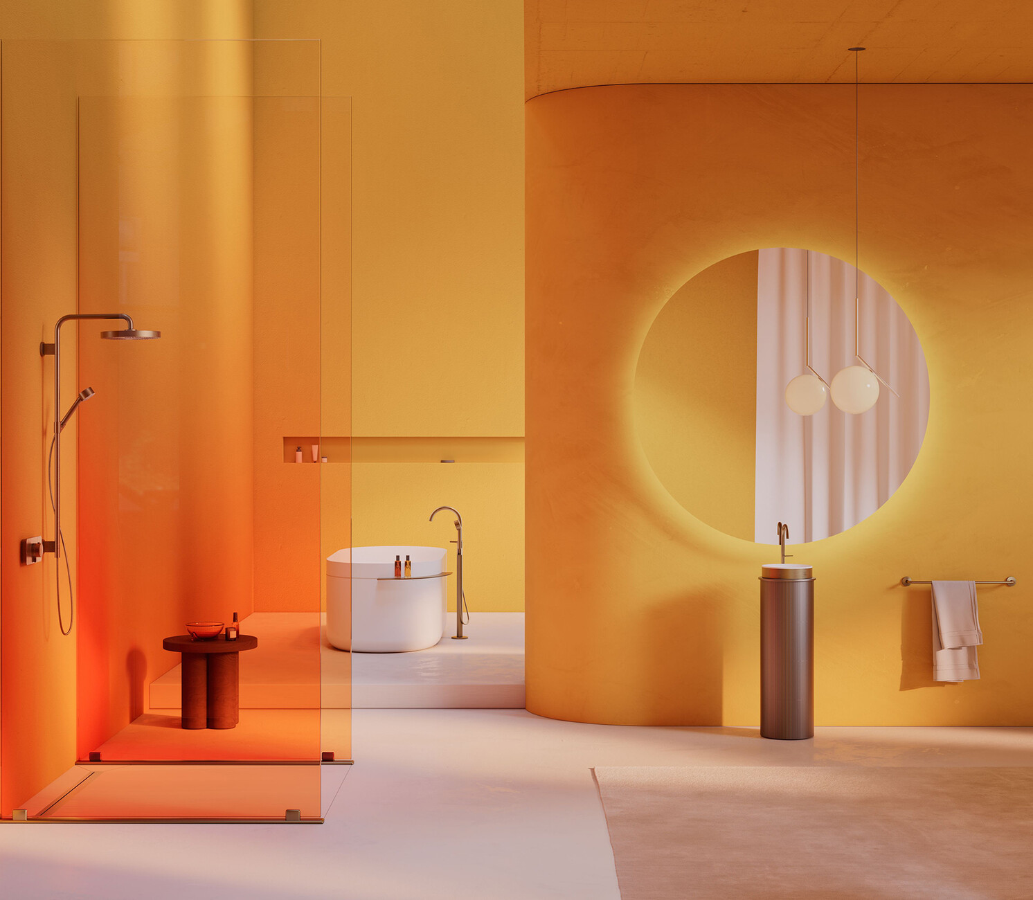 Die Möglichkeiten, die Farbe und Individualisierung bieten, präsentiert AXOR nicht nur im Rahmen seiner Fertigungskompetenz, sondern auch in Form spezifischer Badkonzepte – wie etwa "Utopian Dream", das vom spanischen Designstudios Masquespacio entworfen wurde. Dazu kombinierten die beiden DesignerInnen Ana Milena Hernández Palacios und Christophe Penasse sakrale Elemente mit einer postmodernen Formensprache. Als Setting dient ein 20 Quadratmeter großer Raum, der in eine Hochhauskulisse eingebettet ist. Im Zusammenwirken von Farben und Oberflächen ergibt sich ein dynamisches Wechselspiel aus glänzenden Säulen und den roten Reflexionen der umgebenden Großstadt. Das Badezimmer wird zum futuristischen Tempel, der es seinen NutzerInnen ermöglicht, den Alltag weit hinter sich zu lassen. Dabei spielen auch die neuen Produkte aus der von Philippe Starck entworfenen Kollektion "AXOR Starck" eine entscheidende Rolle: So sind etwa Waschtisch, Wanne, Dusche oder Accessoires wie ein Handtuchhalter in der AXOR FinishPlus-Oberfläche "AXOR Polished Black Chrome" veredelt und bilden im Zusammenspiel ein homogenes Ganzes.